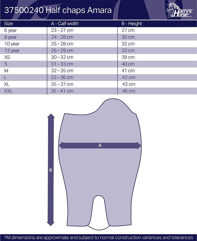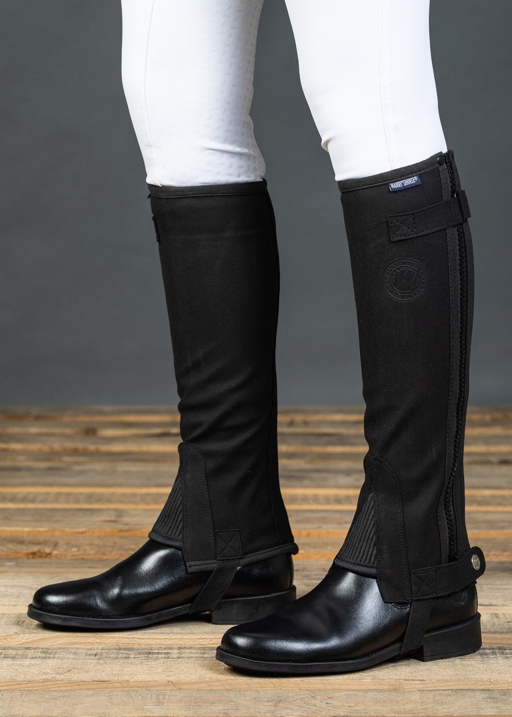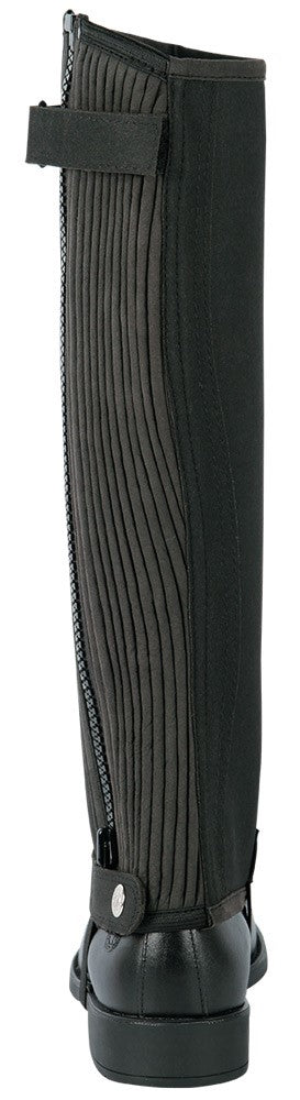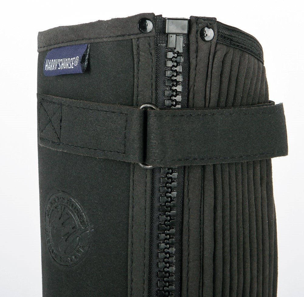 Dokihorse Amara mini chaps with elastic calf section, zipper on the outside, Velcro at the top to keep the chaps nicely closed and a press stud at the bottom.