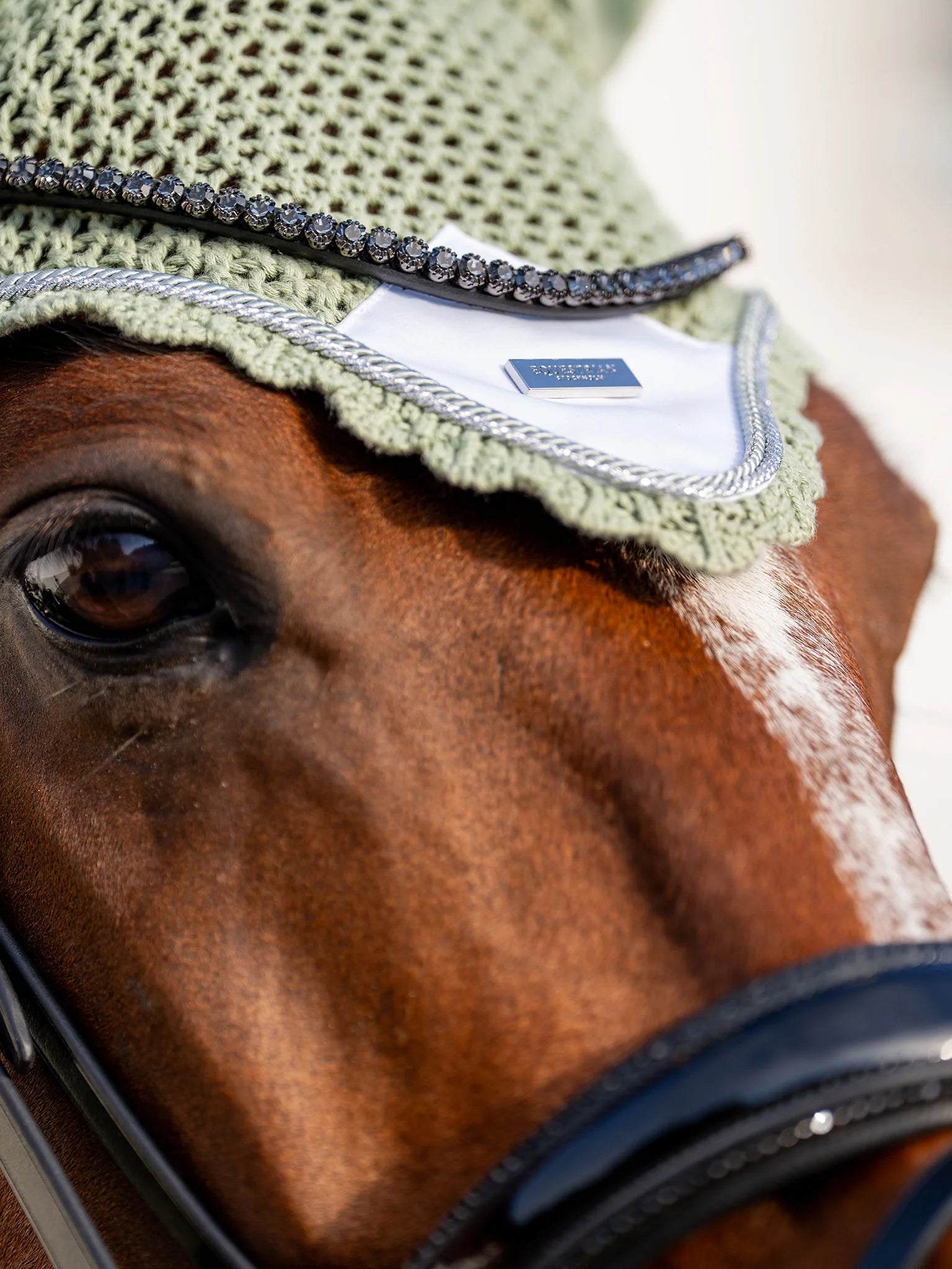 Luxe oorkapje in een zachte pistachekleur met witte en zilveren details. Het netje biedt bescherming tegen insecten en dempt geluid. Gehaakt oornetje met elastische stof bij de oren voor minimale wrijving. Dit oornetje past perfect bij het zadeldek uit dezelfde collectie.