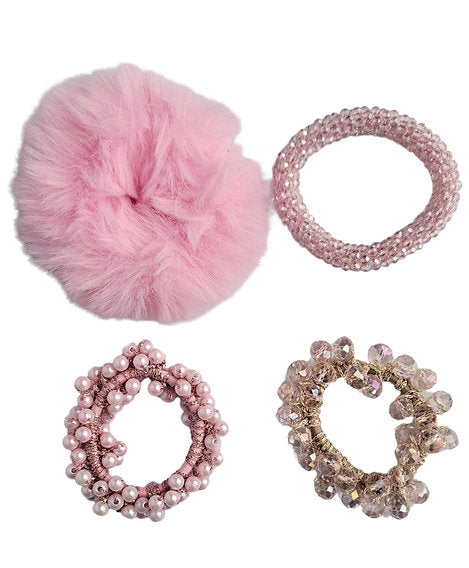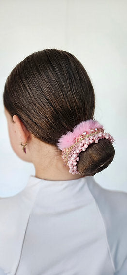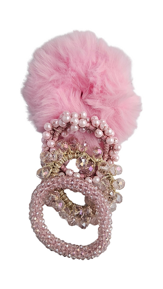 Setje baby roze bestaat uit een baby roze kleur Equibun fluffy, baby roze parelelastiek, roze kristal elasiek en roze strass elastiek en een knotpin
