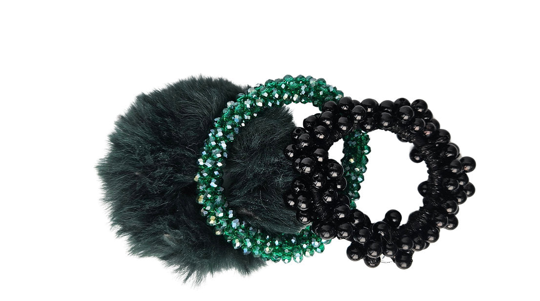 Setje zwart groen bestaat uit een donker groene kleur Equibun fluffy, zwart parelelastiek en donkergroen strass elastiek. en een knotpin