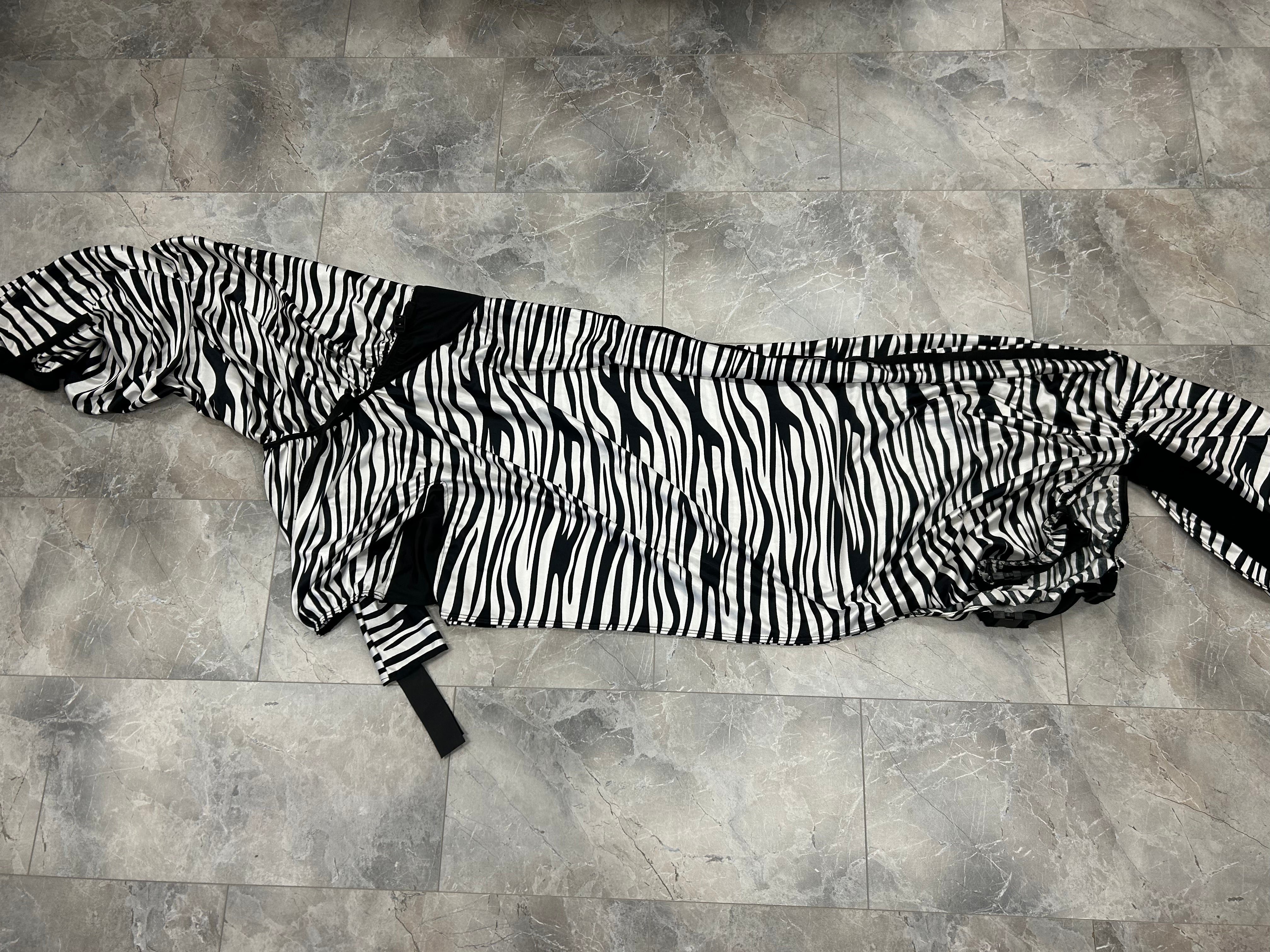 De deken is volledig dekkend, inclusief een vaste hals en buikflap, en is gemaakt van ademend, huidvriendelijk materiaal dat irritatie en schuren voorkomt. Dankzij de verstelbare buikflap en staartriem blijft de deken goed op zijn plaats, zelfs bij actief bewegen in de wei. De fijne stof houdt zelfs de kleinste insecten op afstand en helpt zo je paard te beschermen tegen jeuk, schuren en allergische reacties veroorzaakt door muggen en knutten. Ideaal voor dagelijks gebruik tijdens het insectenseizoen.
