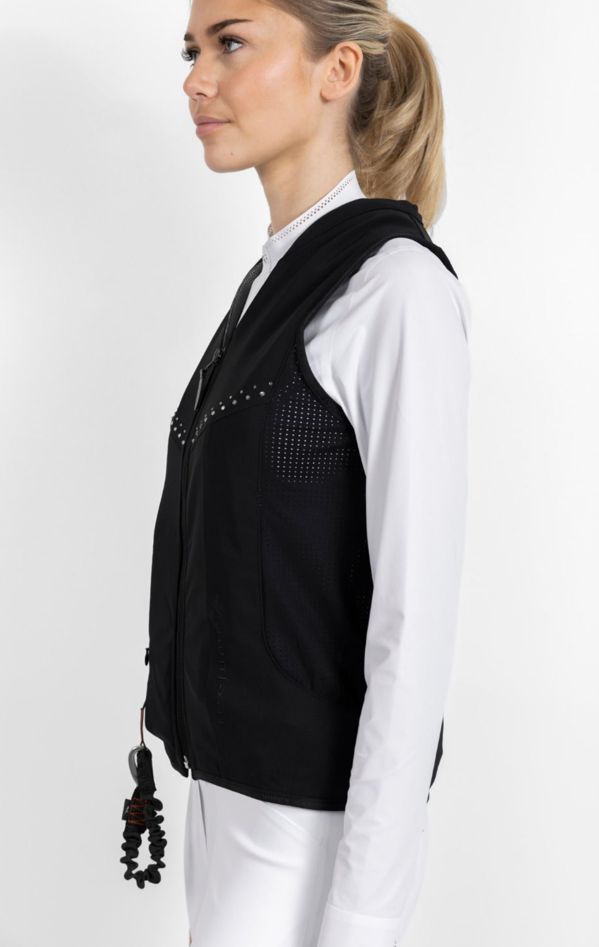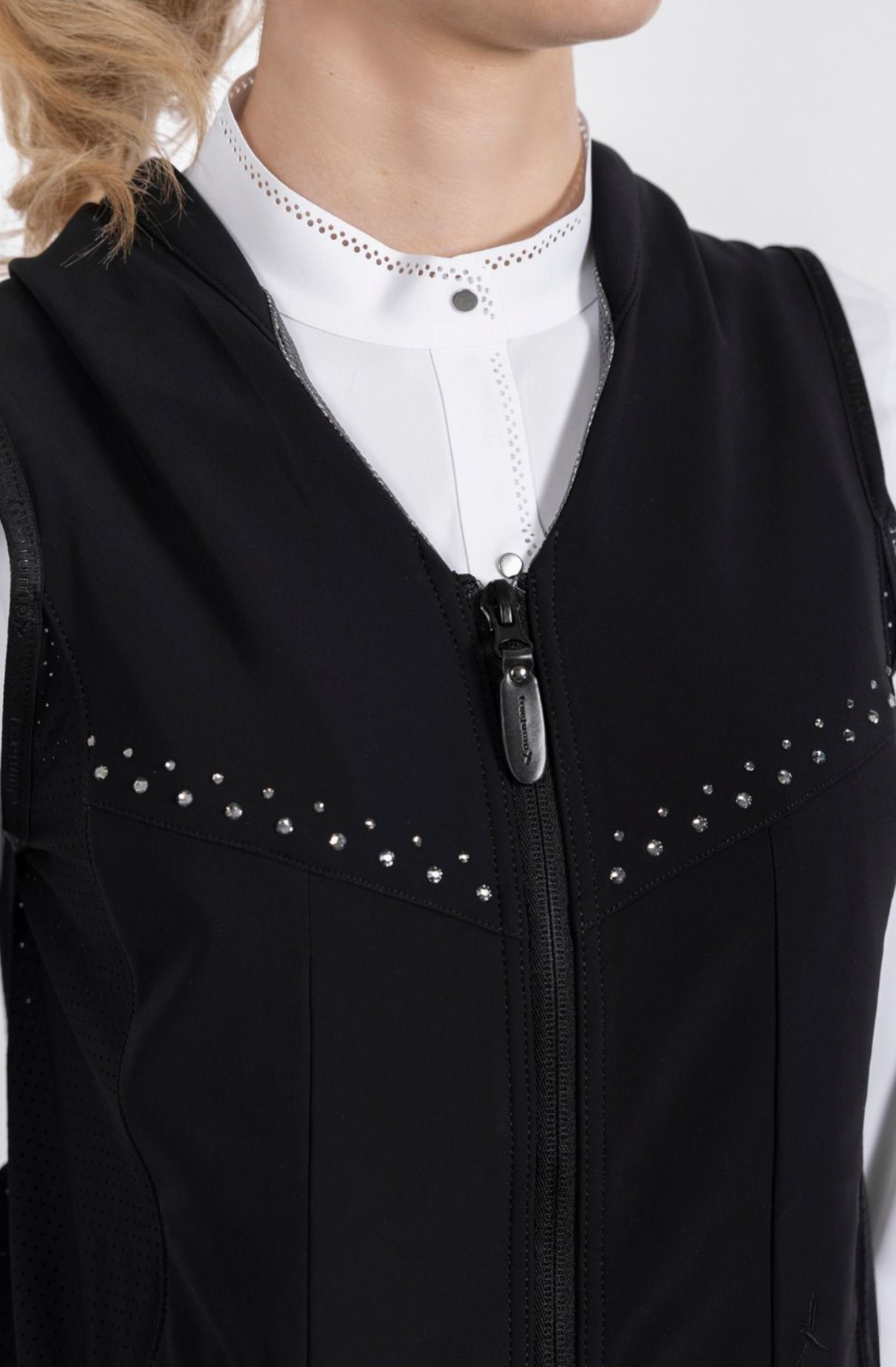 Het vest is vervaardigd uit zijdeachtig Italiaans textiel met geperforeerde zijkanten voor ademend vermogen en optimaal comfort. De aangesloten pasvorm zorgt voor bewegingsvrijheid, terwijl de kristallen zorgen voor een verfijnde uitstraling.
