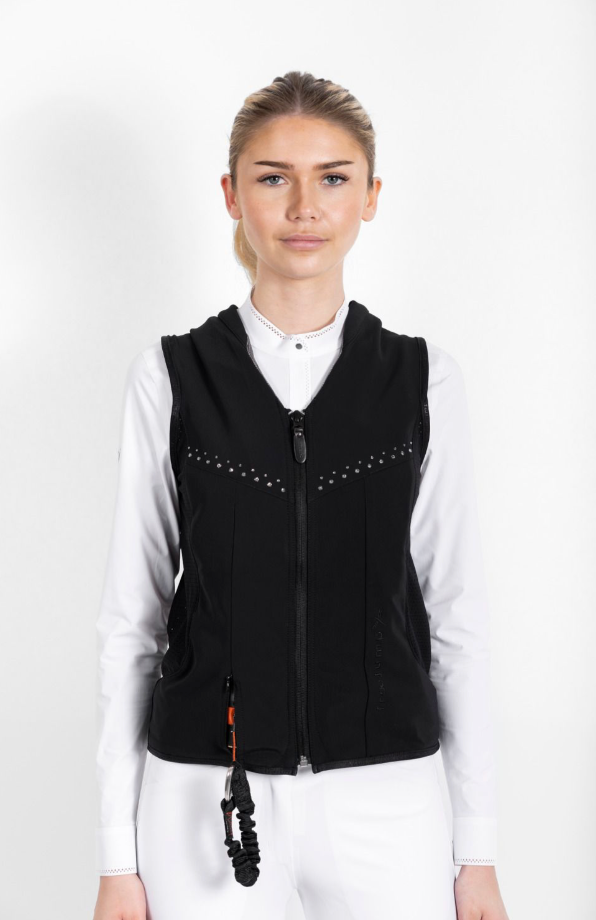 De Freejump Airbag Crystal combineert elegante stijl met geavanceerde veiligheidstechnologie. Versierd met subtiele kristallen op de borst, biedt dit vest geoptimaliseerde bescherming van nek, rug, lenden, heiligbeen, bekken en borstkas bij een val. Het vest kan gedragen worden over een dunne laag kleding of onder een compatibel wedstrijdjasje met minimaal 15% elastaan.
