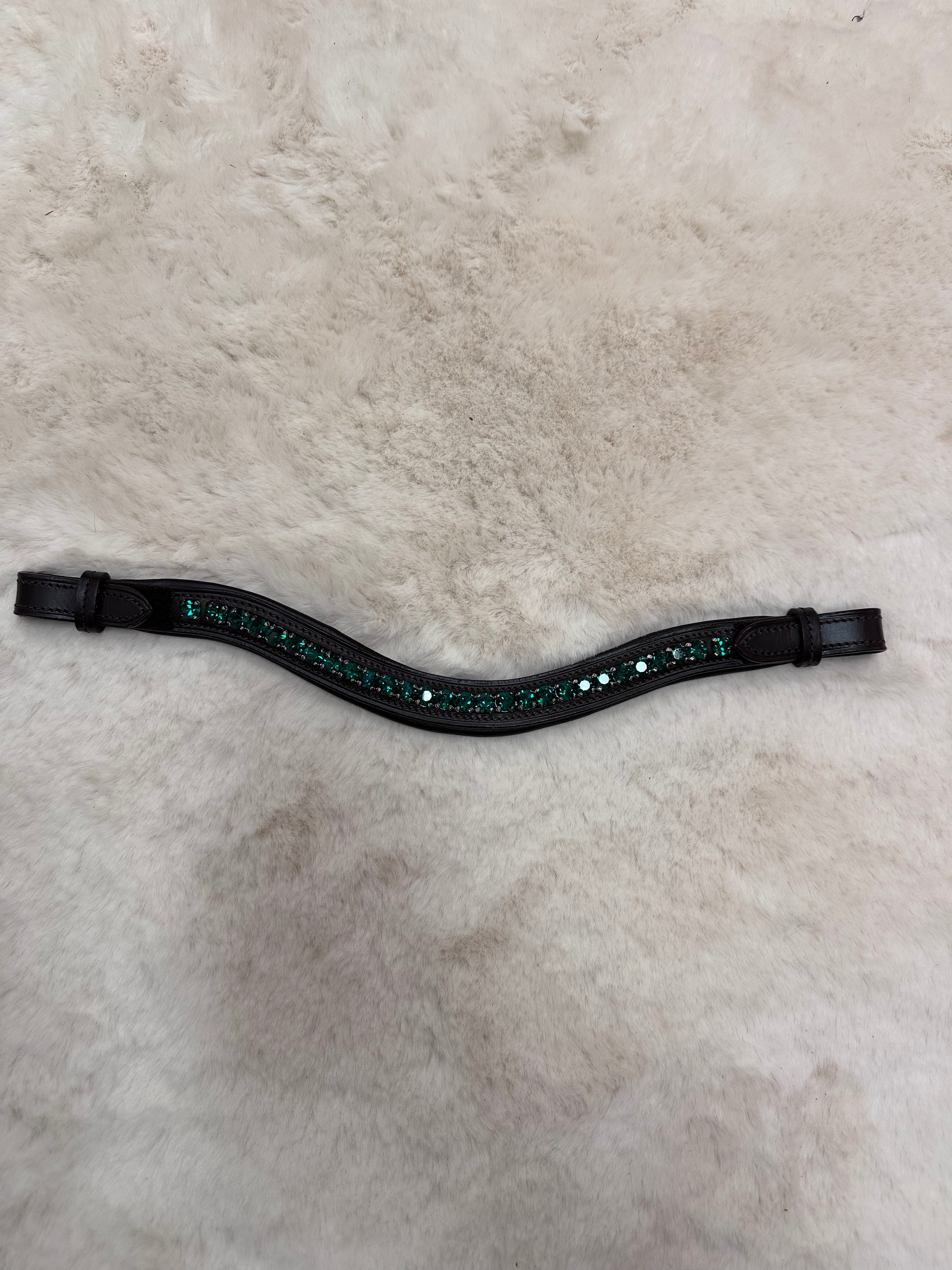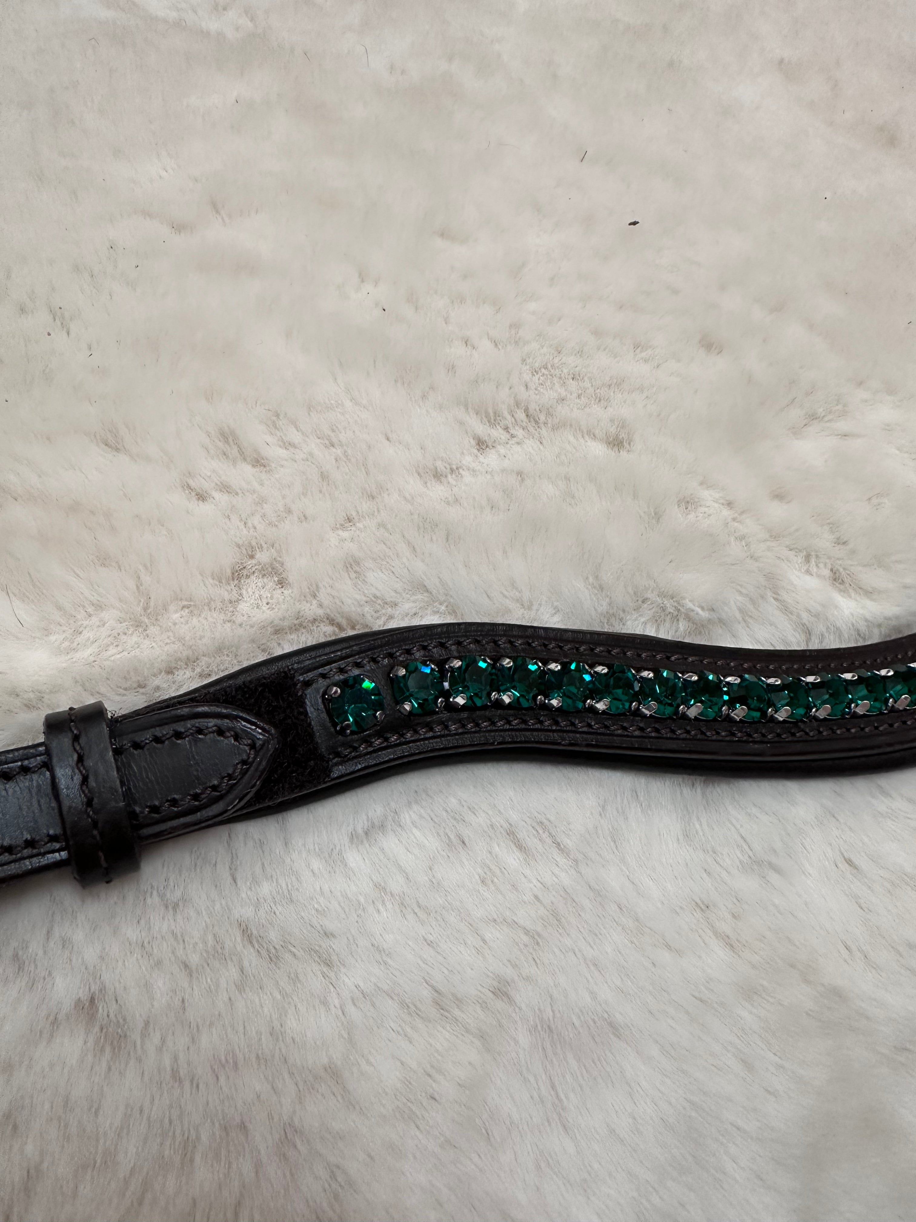 Deze stijlvolle frontriem is versierd met schitterende bling steentjes in een elegante golfvorm. Het voegt een vleugje glamour en verfijning toe aan het hoofdstel, terwijl het een subtiele, maar opvallende uitstraling heeft. Perfect voor paardenliefhebbers die hun rijuitrusting willen verfraaien met een luxueuze, moderne touch.