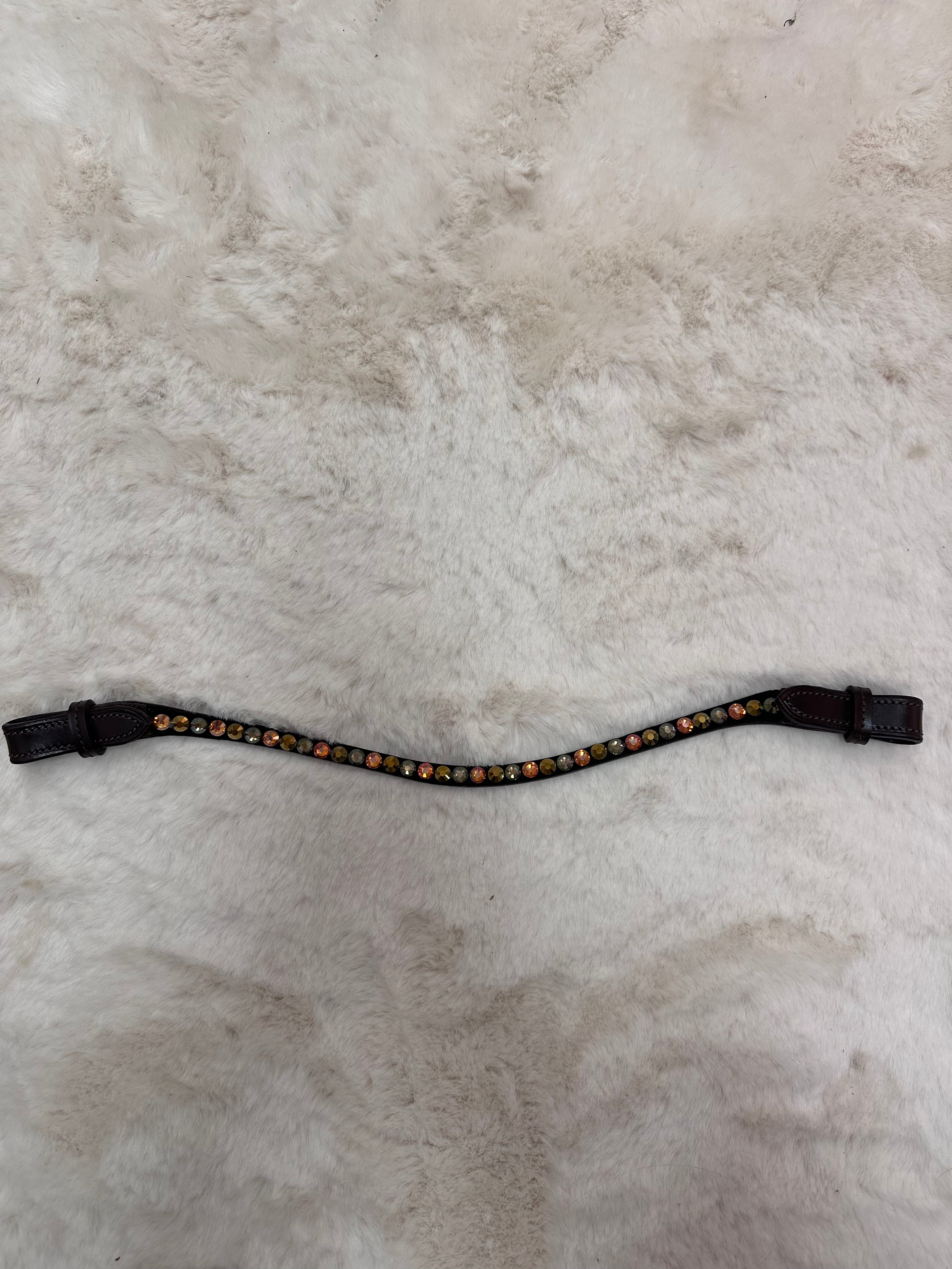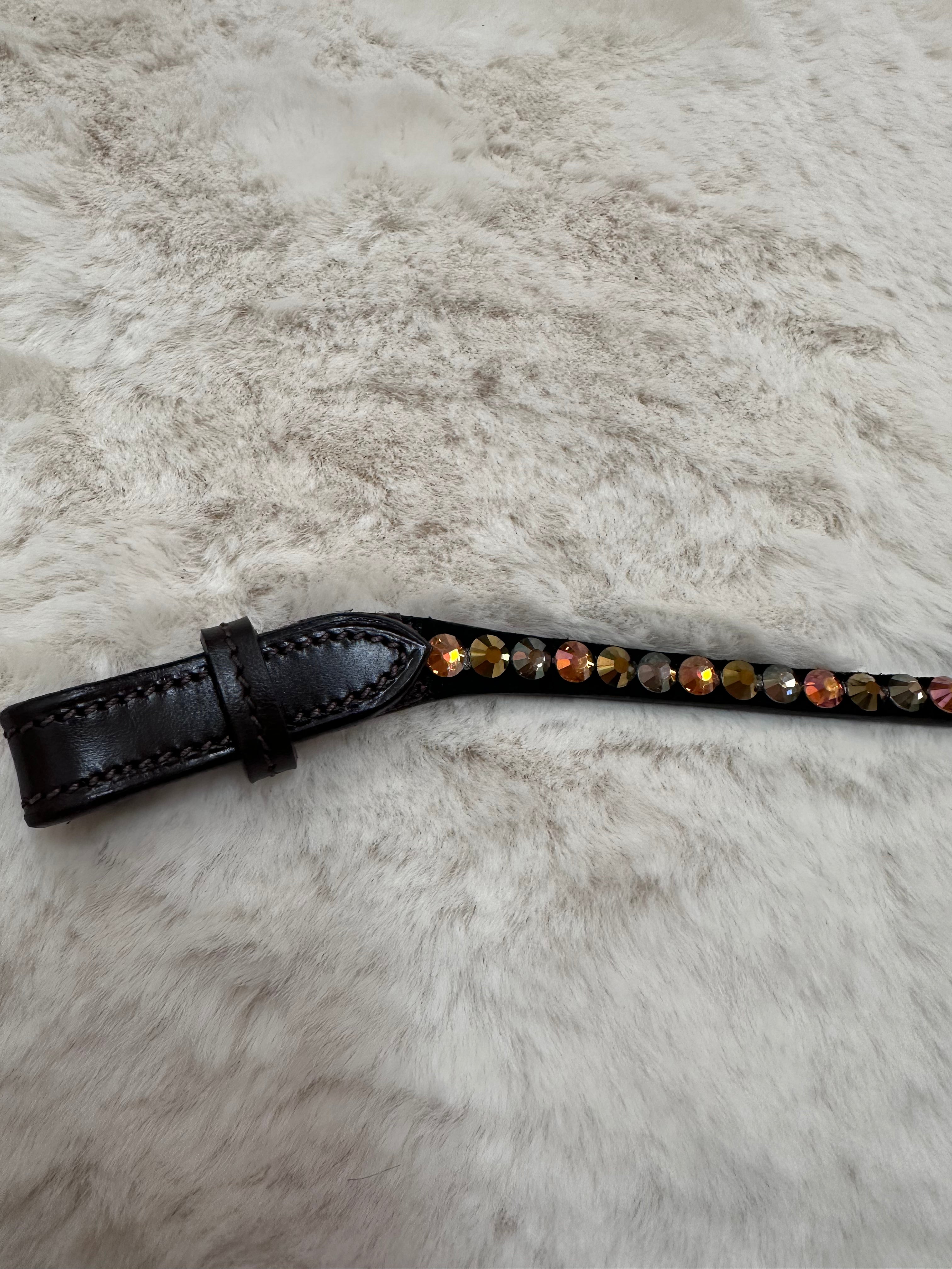 Deze stijlvolle frontriem is versierd met schitterende bling steentjes in een elegante golfvorm. Het voegt een vleugje glamour en verfijning toe aan het hoofdstel, terwijl het een subtiele, maar opvallende uitstraling heeft. Perfect voor paardenliefhebbers die hun rijuitrusting willen verfraaien met een luxueuze, moderne touch.