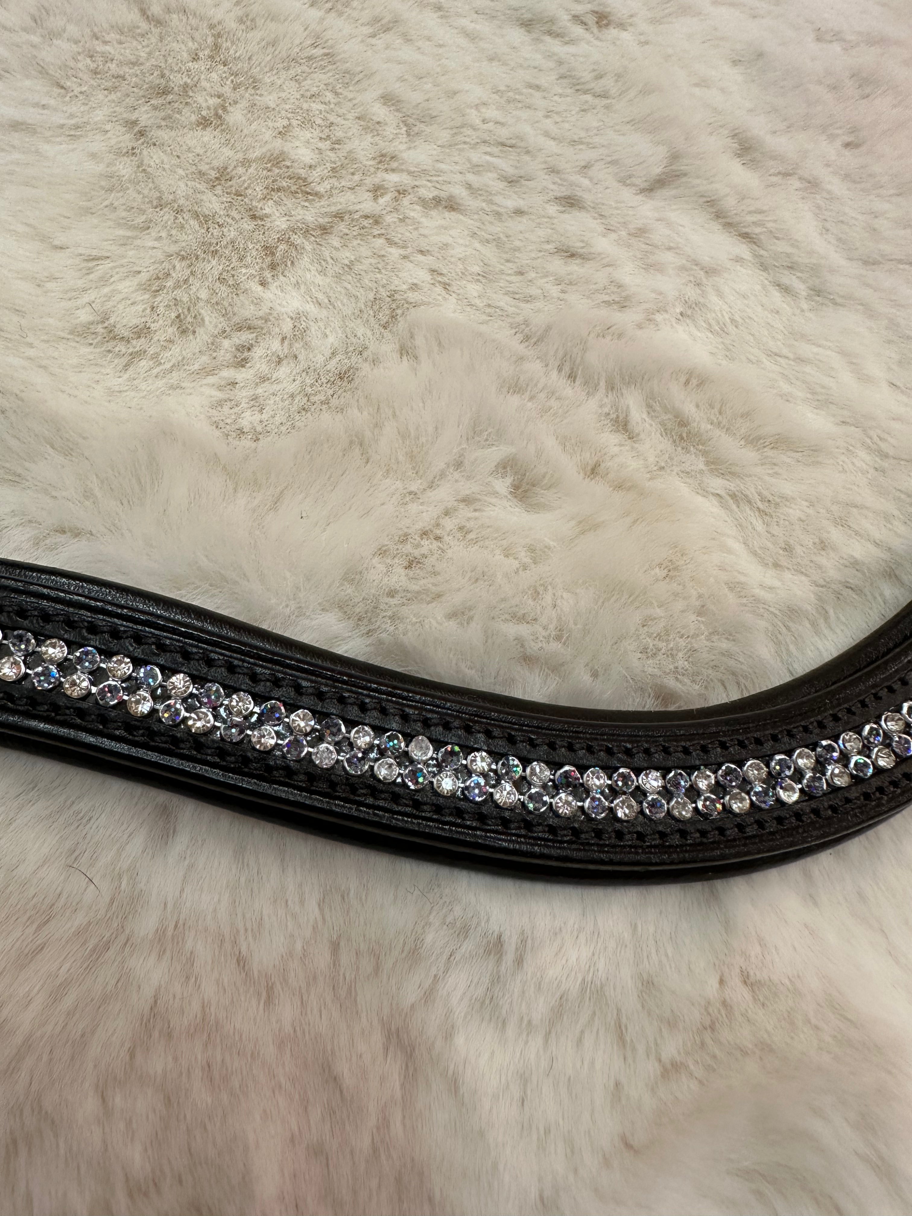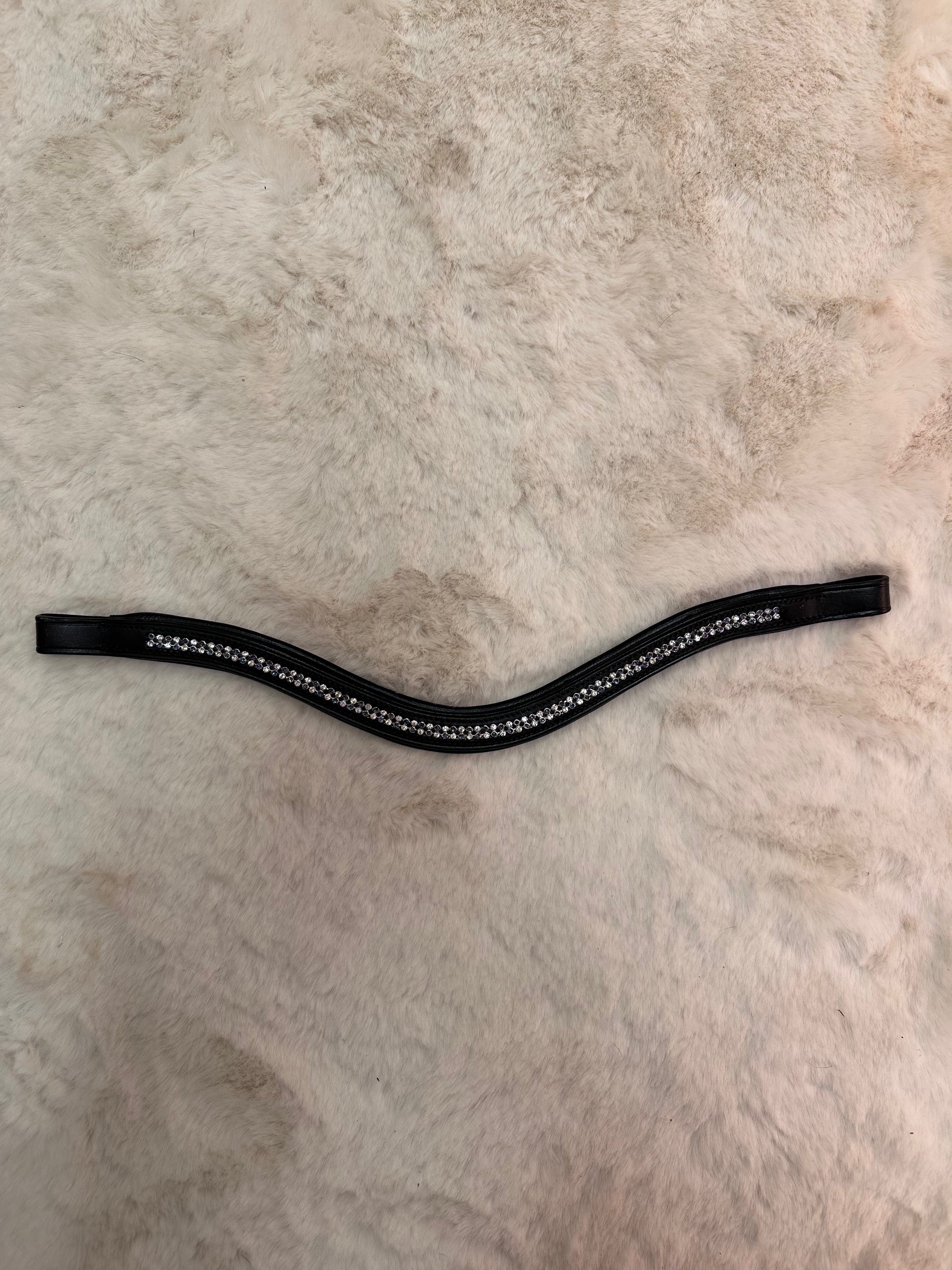 Deze stijlvolle frontriem is versierd met schitterende bling steentjes in een elegante golfvorm. Het voegt een vleugje glamour en verfijning toe aan het hoofdstel, terwijl het een subtiele, maar opvallende uitstraling heeft. Perfect voor paardenliefhebbers die hun rijuitrusting willen verfraaien met een luxueuze, moderne touch.