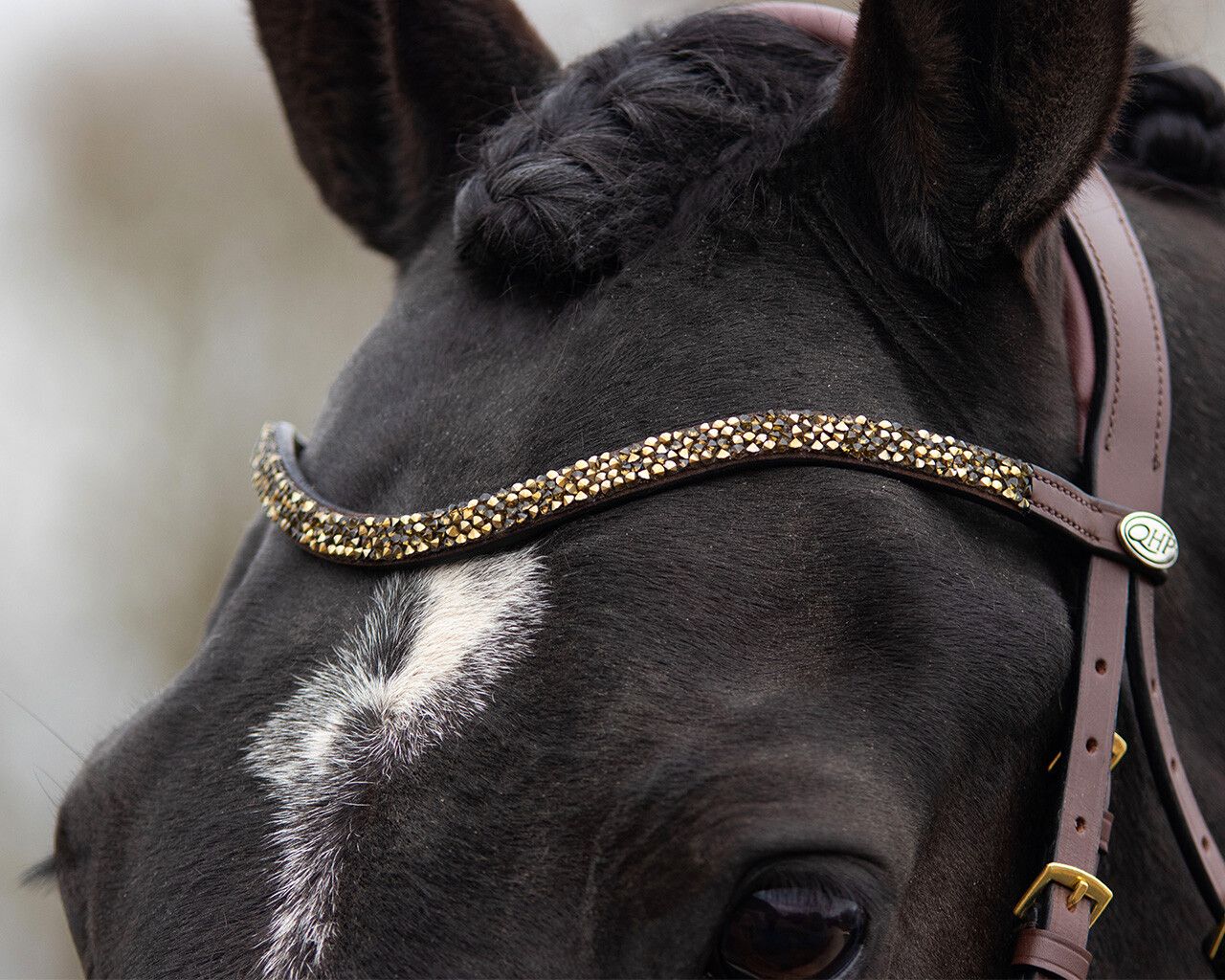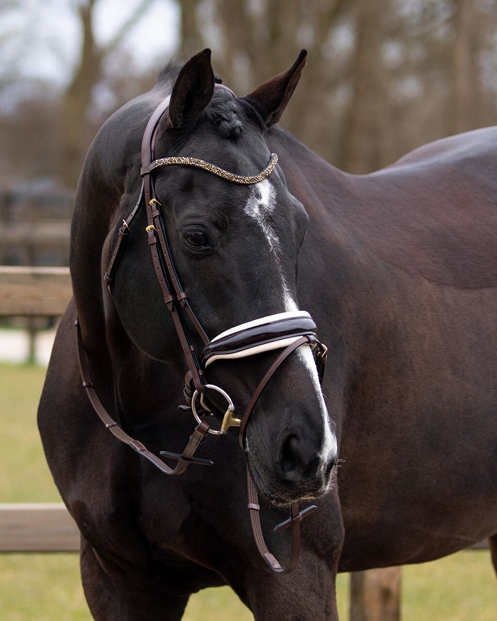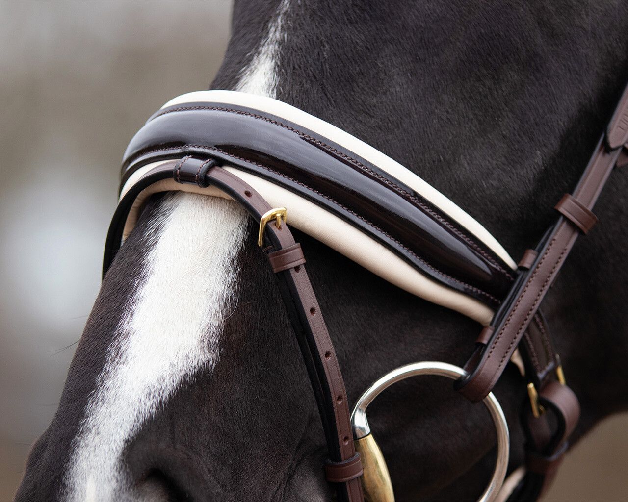 Elegant bridle with patent leather noseband by QHP . Thanks to the anatomically shaped headpiece and the anatomically shaped noseband with soft padding, the bridle is extra comfortable. This bridle has a soft chin pad and blind closures on the cheek pieces. The throat strap is adjustable on both sides. The bridle is finished with a browband with diamond-shaped rhinestones.