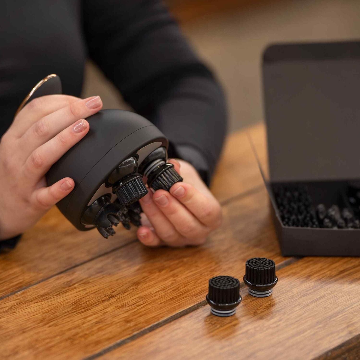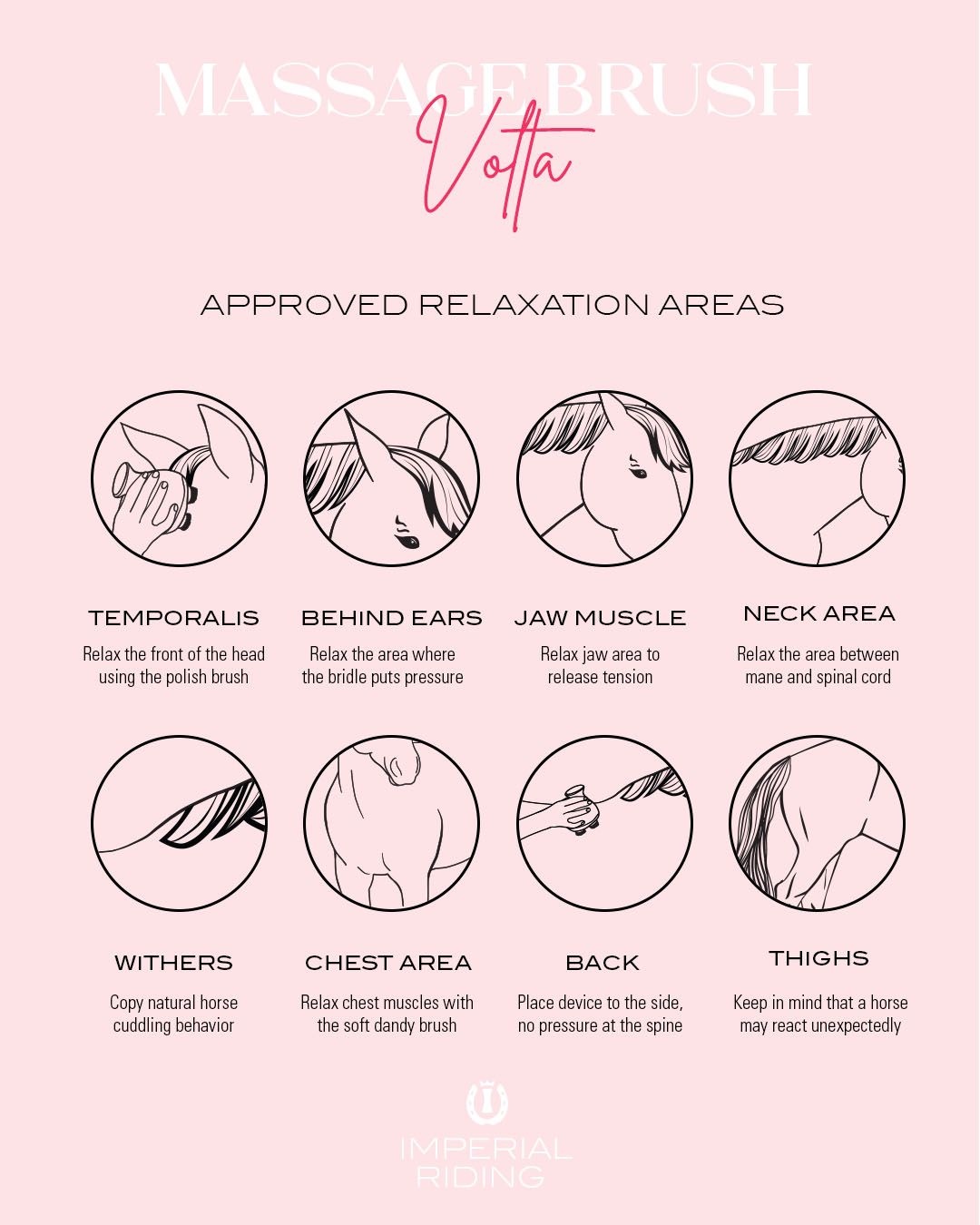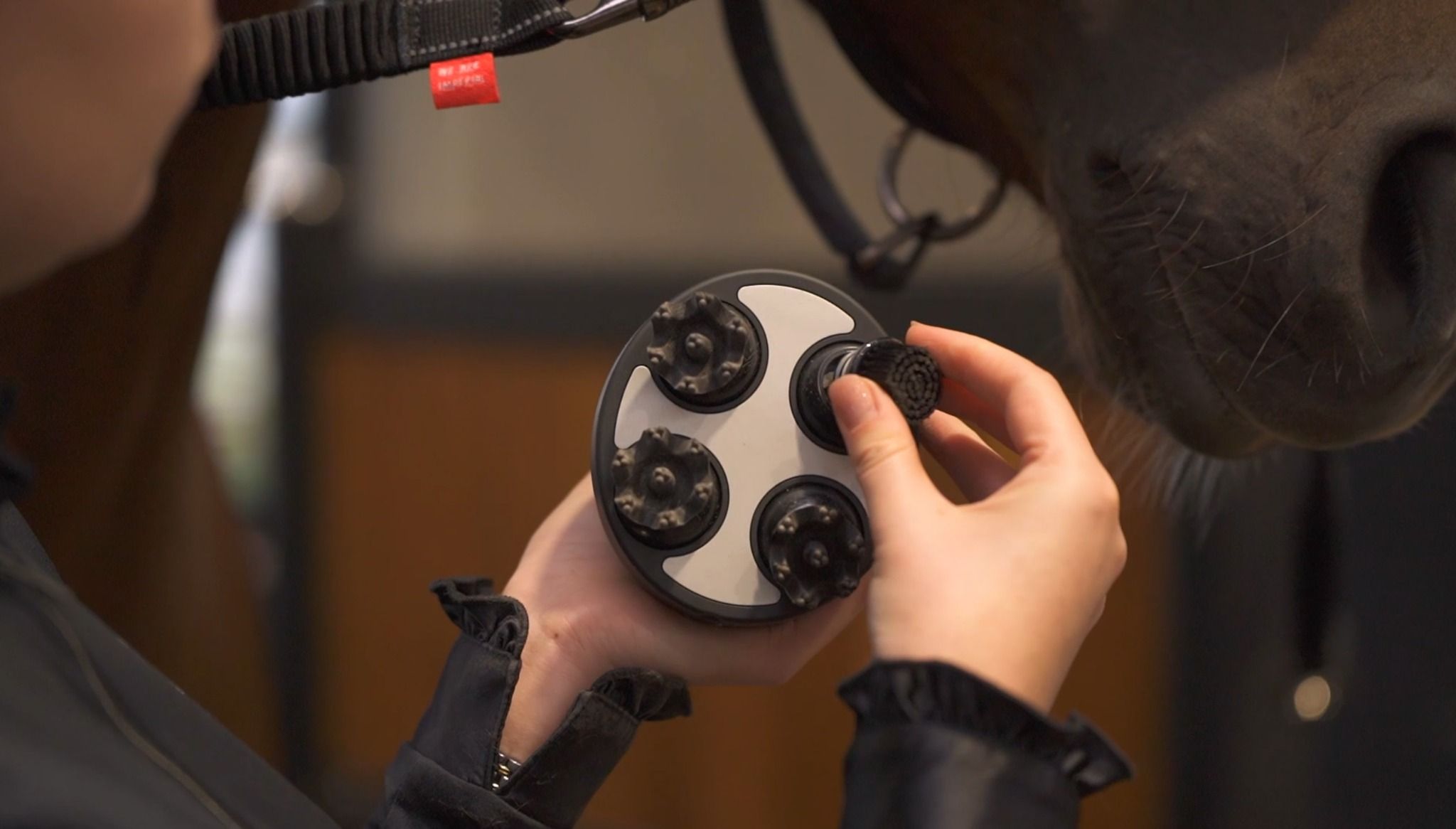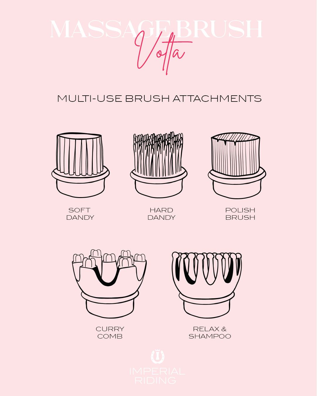 Fine massage brush from Imperial Riding. The Grooming & Relaxation brush Volta comes with 5 different attachments that relax the horse. The rubber attachments can be used to rub shampoo into the mane, coat and tail.