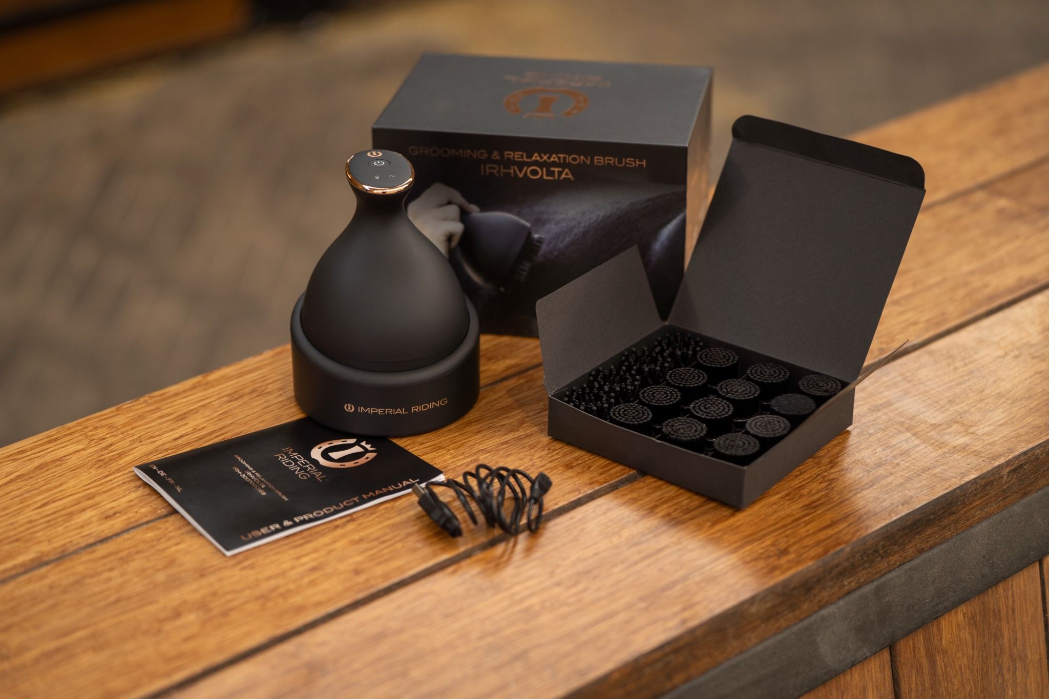 The Volta massage brush is portable, waterproof, and cordless. This massage brush is charged in the base station. This product has been tested and approved by various horse physiotherapists for gentle relaxation.