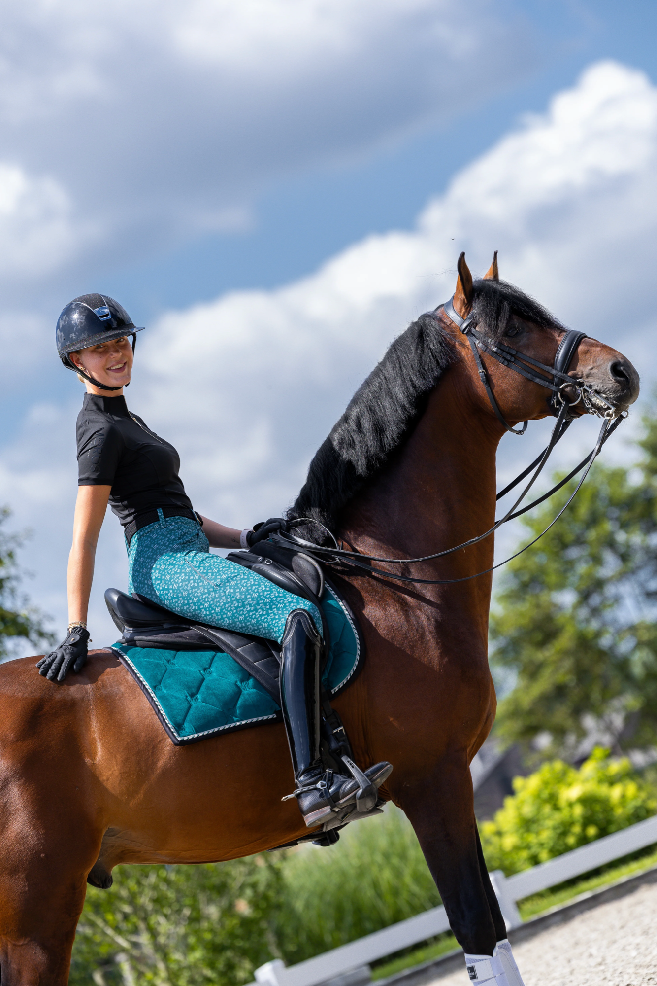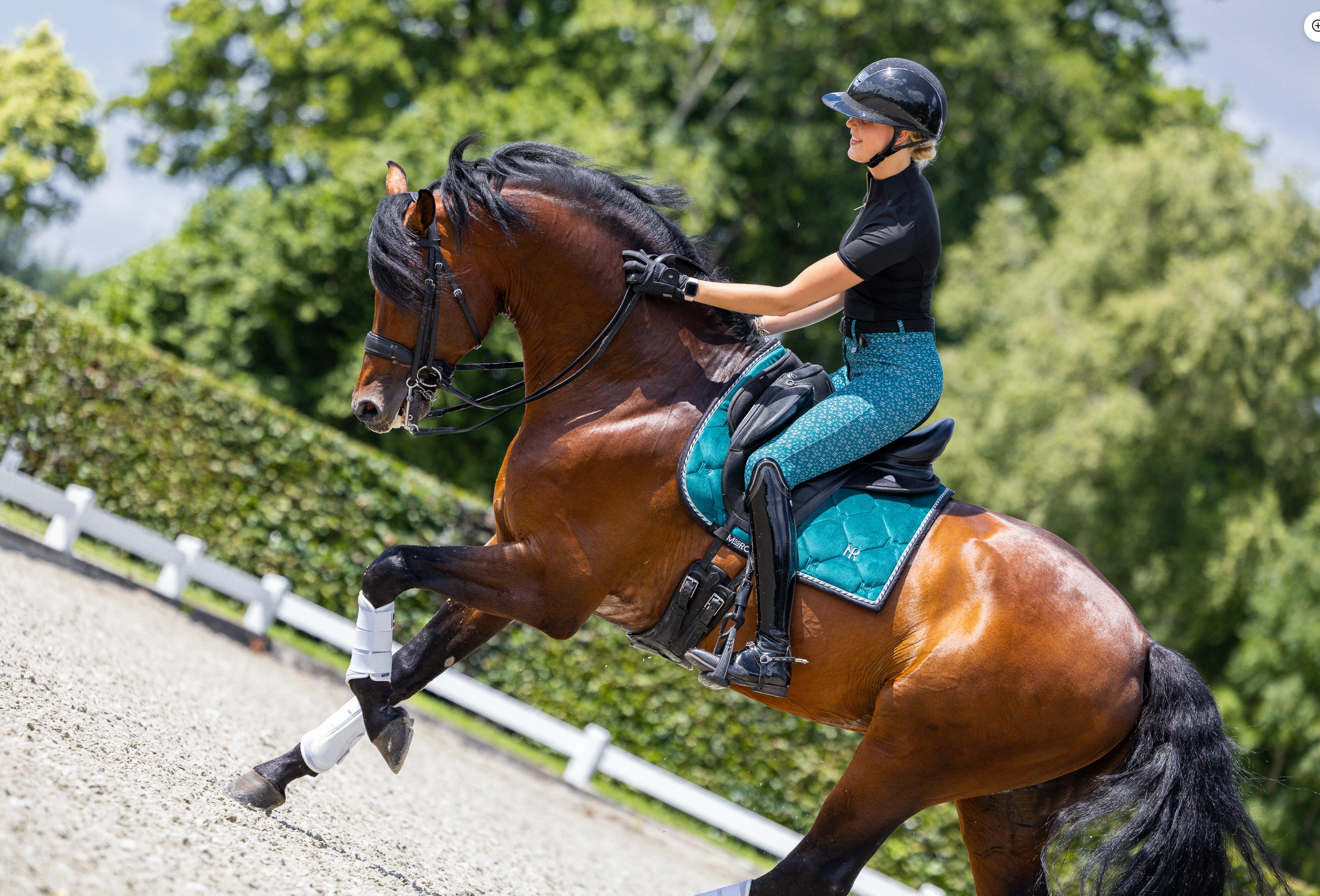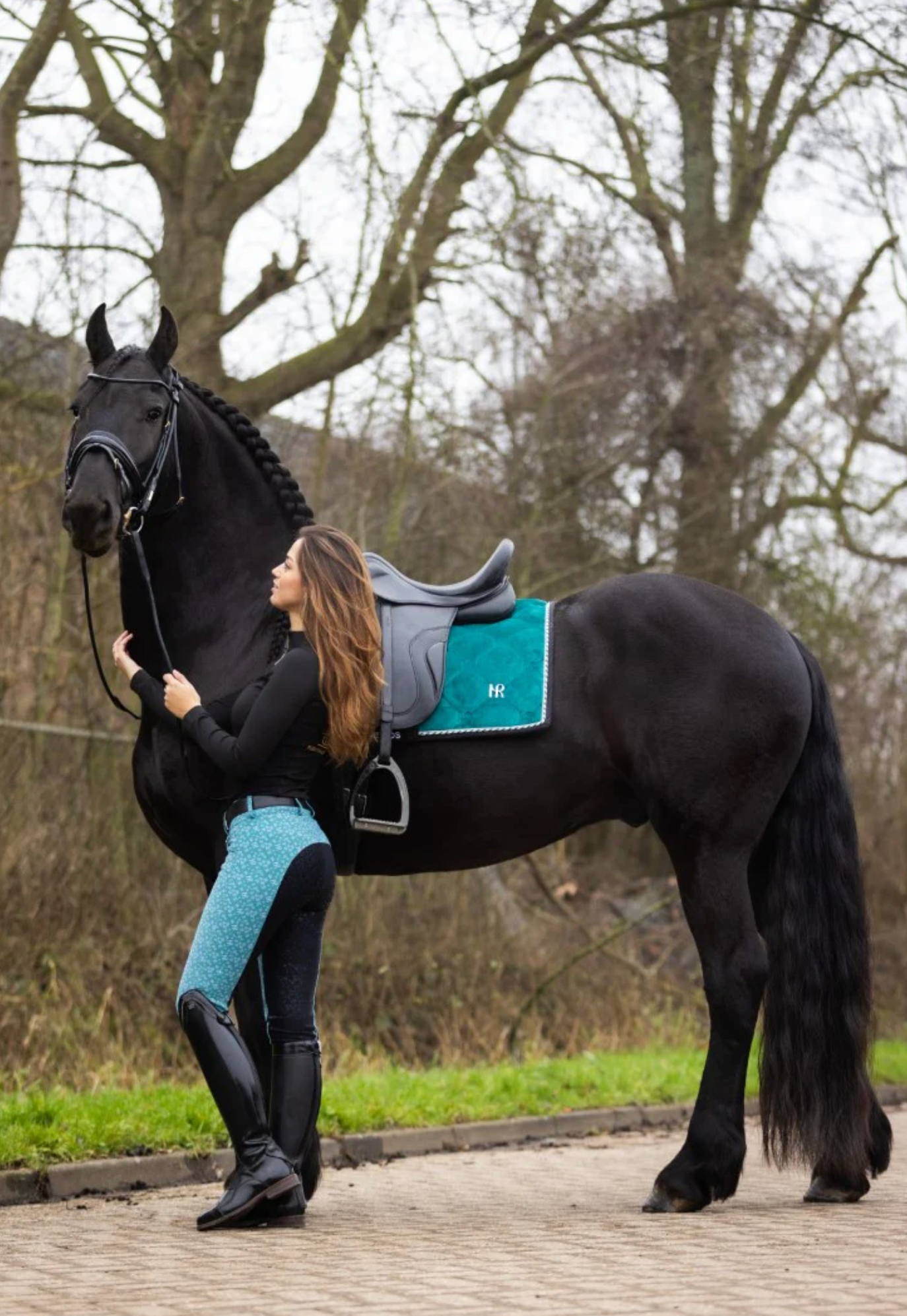 Het patroon is voorzien van het MR-logo en je zult wegblazen in de arena! De rijbroek is perfect afgestemd op basic zwart en het Deep Lake fluwelen zadelpad.