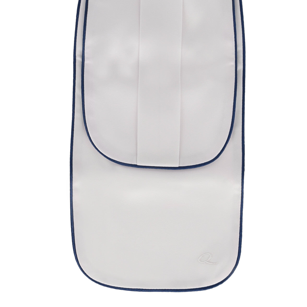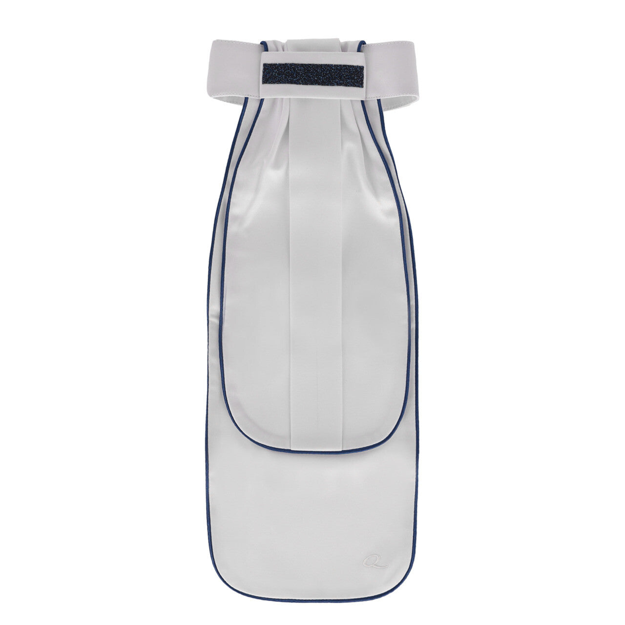 Deze satijnen plastron heeft een mooie glitterafwerking, een bies en een geborduurde 'Q' onderaan. Hij is eenvoudig te bevestigen met een klittenbandsluiting.