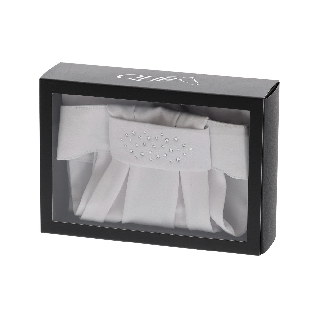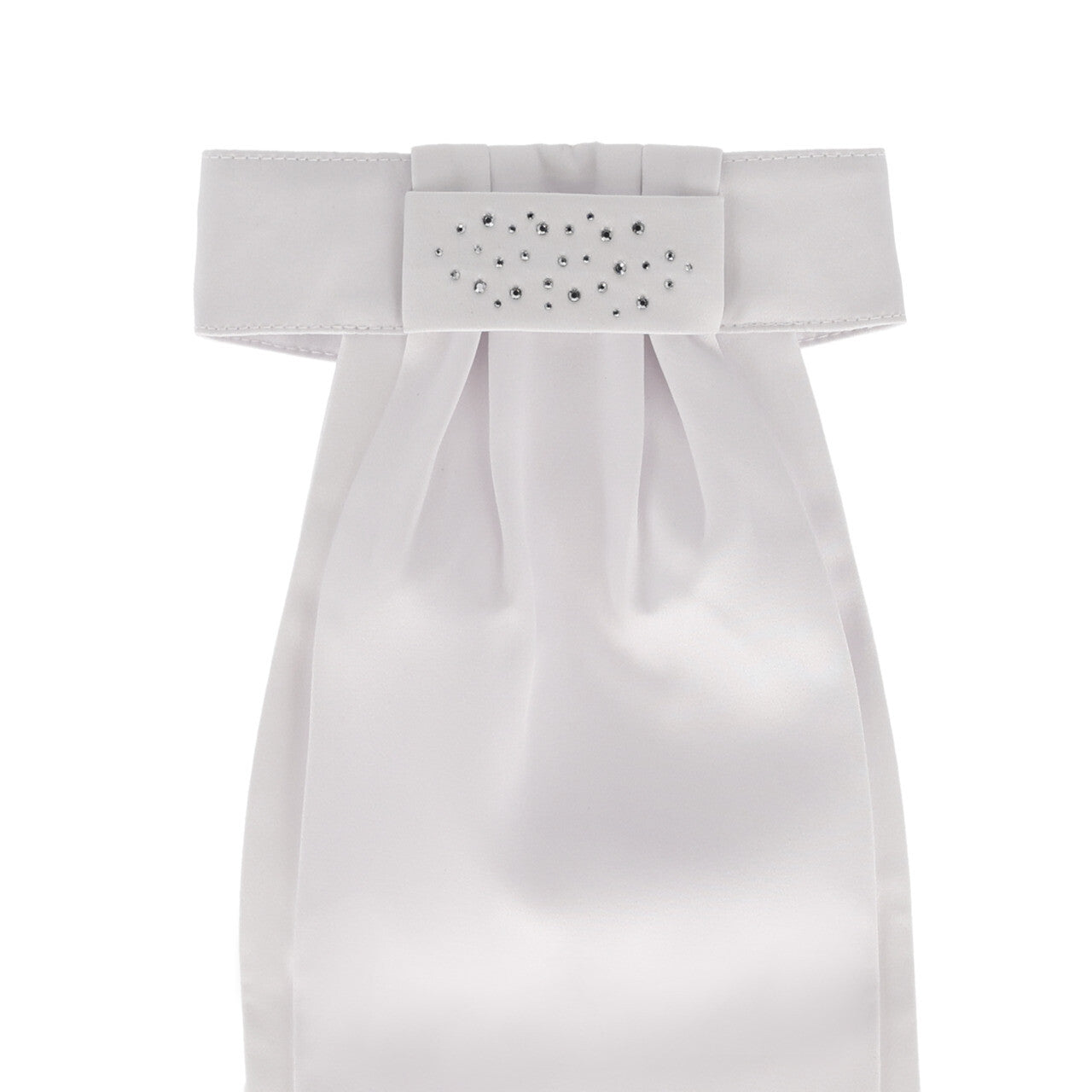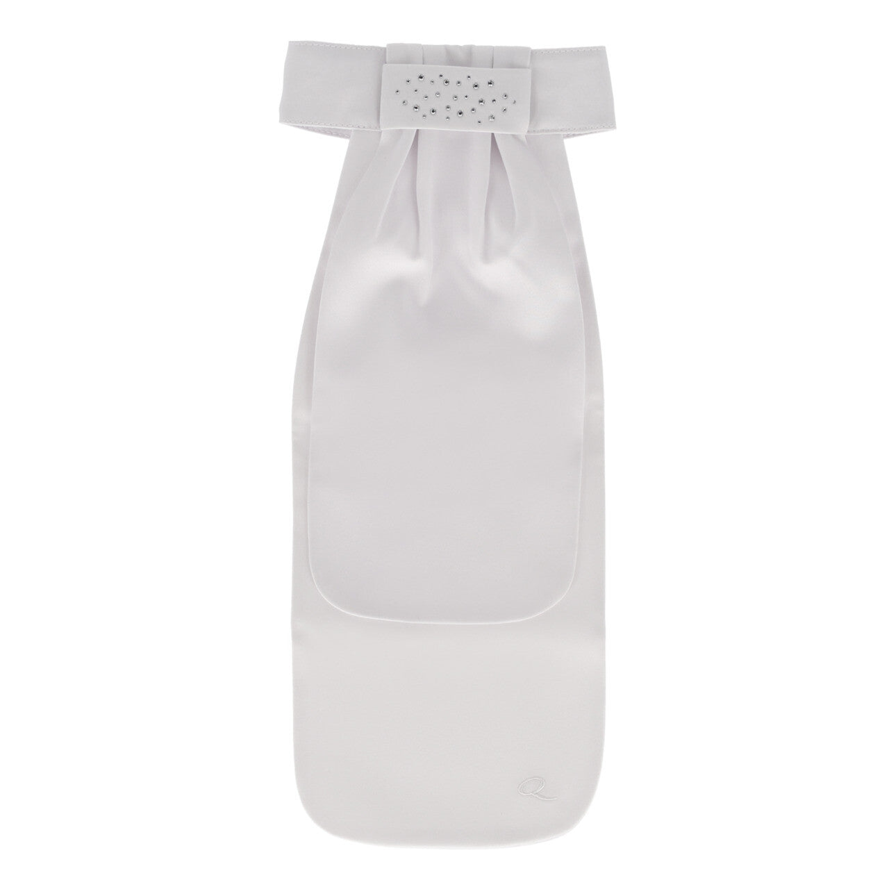 Deze satijnen plastron is afgewerkt met kleine strass-steentjes en heeft een geborduurde 'Q' aan de onderkant. Hij kan eenvoudig worden bevestigd met de klittenbandsluiting.