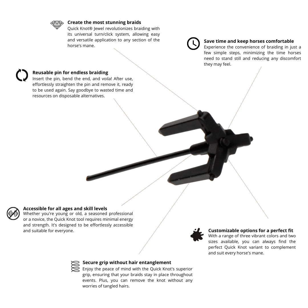 The handy mane clips have a special top for a good grip of the knots and are easy to use with a professional result. The 3 arms keep the pins in the mane even better. In addition, the Quick Knot® Deluxe is made of plastic and metal so that it can be used more often.
