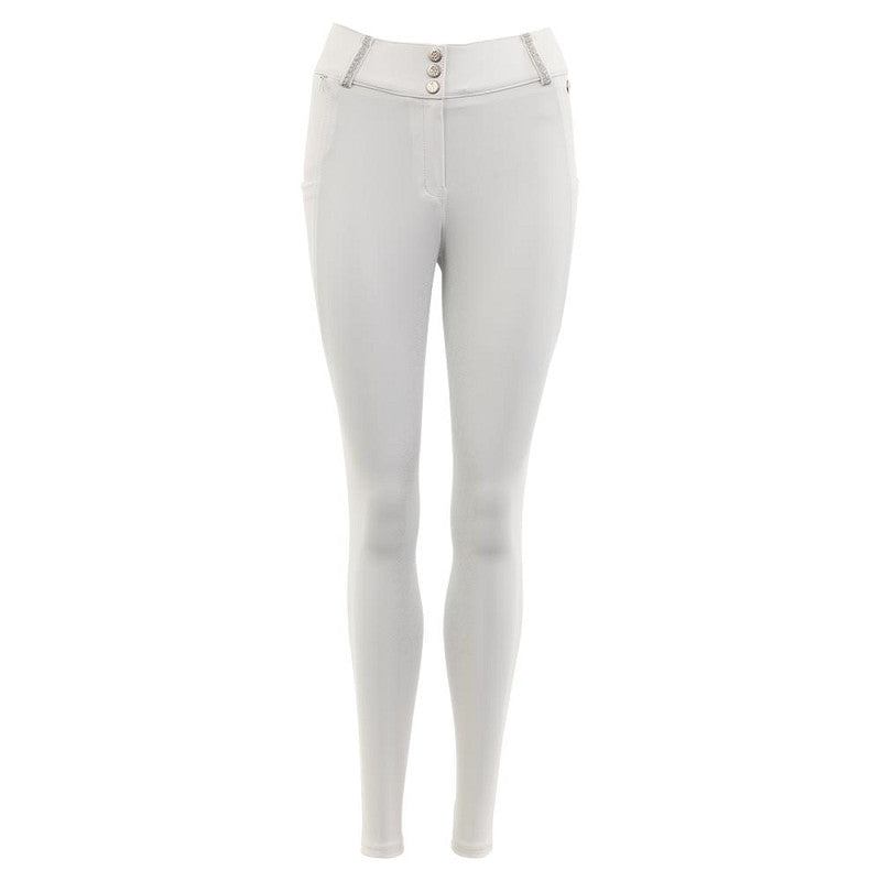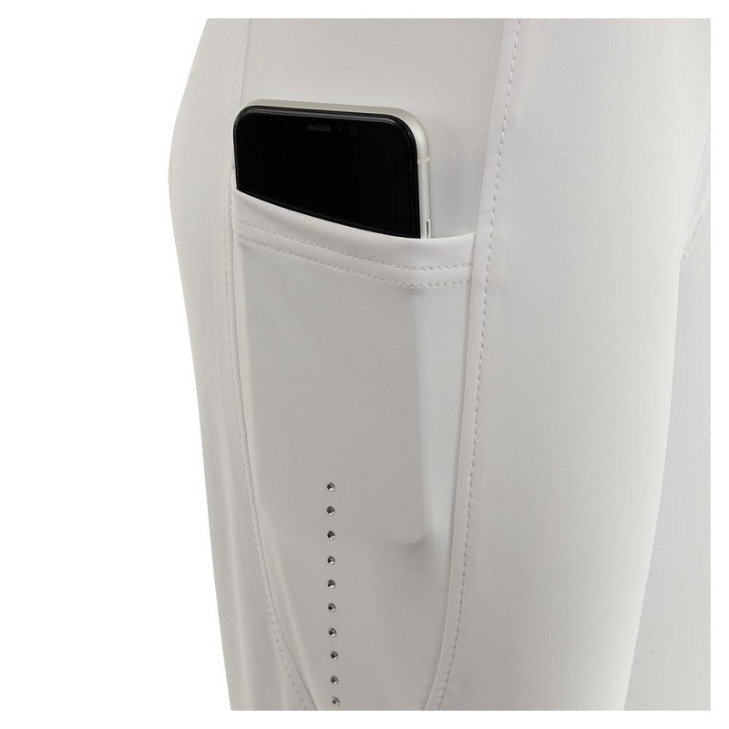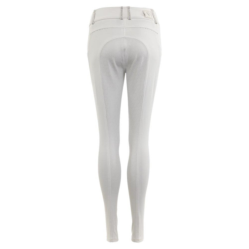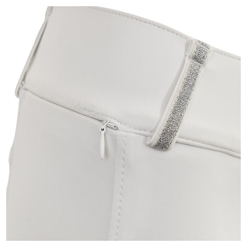 Riding breeches Cancun have a high waistband with three hook and eye closures and silver glitter bands on the belt loops. The breeches are equipped with two deep side pockets suitable for storing a mobile phone and a hidden zip pocket on the right front. The silicone seat maximizes stability on the saddle. The elegant finish with imitation diamonds on the front and back gives the breeches a luxurious look.