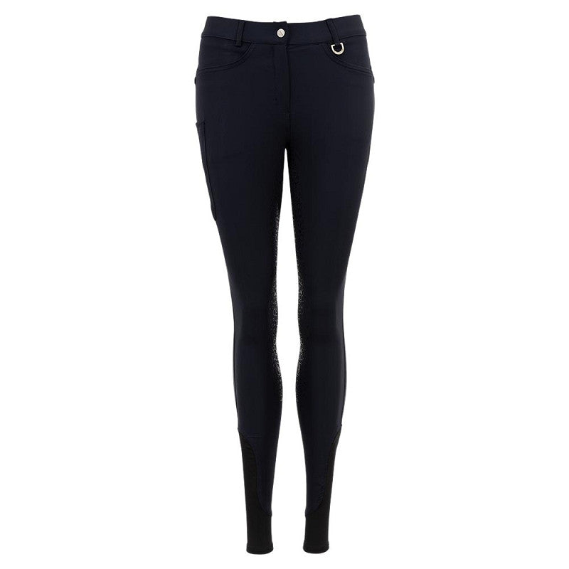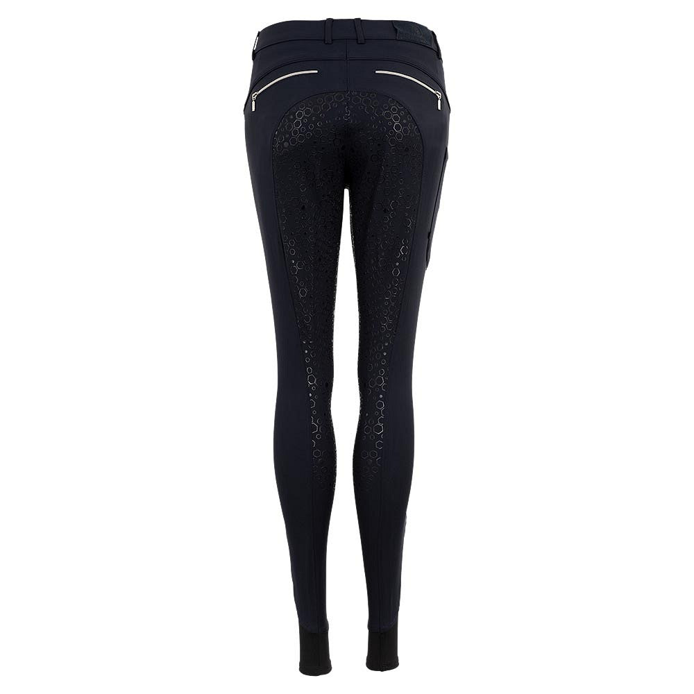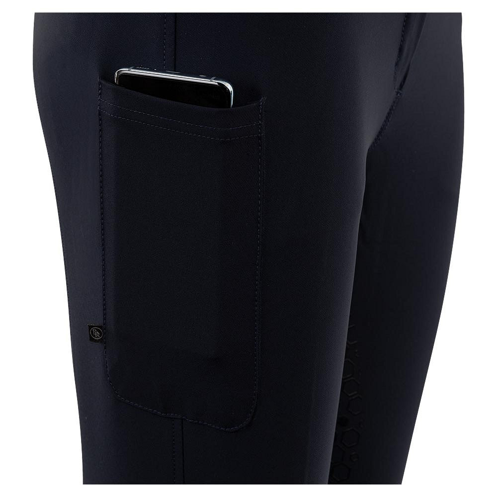 On the right leg there is a deep pocket that is perfect for putting a mobile phone in. In addition, the riding breeches have two jeans pockets on the front and two zip pockets on the back. The stretch waistband with belt loops and elastic leg closure ensure a nice, close fit. The silicone seat with graphic pattern ensures a stable seat.