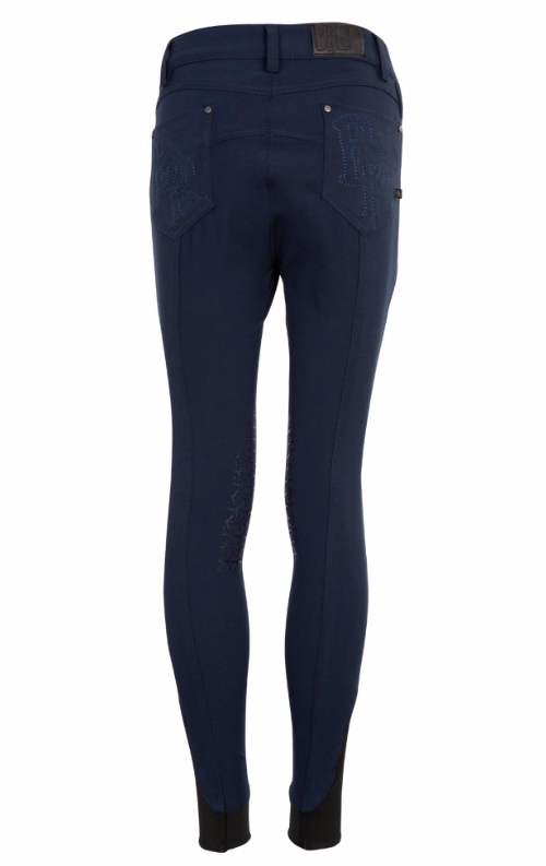 Comfortable, trendy riding breeches with anti-slip patches and Stretch leg closure. The anti-slip consists of silicone patches on the inside of the knee. These patches are rough and flexible and provide extra grip and therefore a more stable seat while riding. The Nico is equipped with jeans pockets at the front and back. Above the left pocket at the front and on the jeans pocket at the back, the riding breeches have an embroidered BR logo and on the waistband at the back there is a BR badge. The Stretch leg closure fits optimally at the ankle and guarantees the best possible wearing comfort in riding boots. Made of 68% polyester, 22% cotton and 10% elastane. Machine washable. Available in the colour navy blazer.