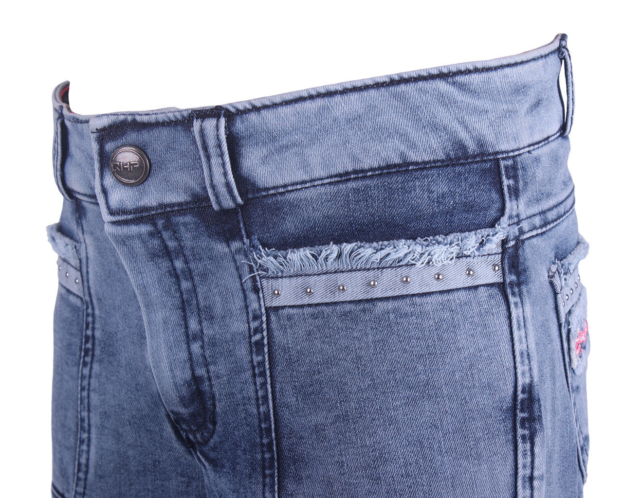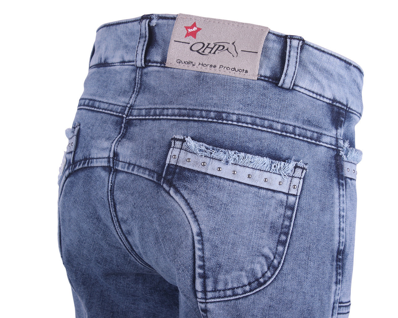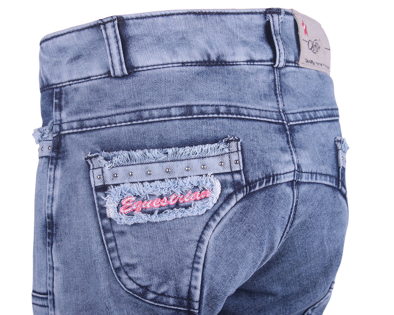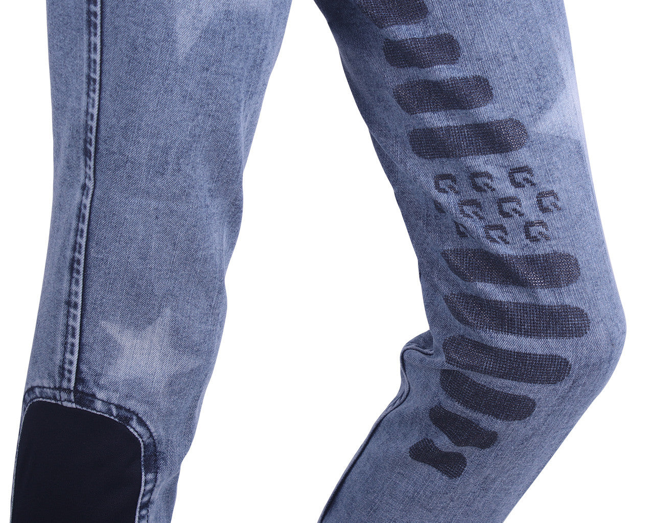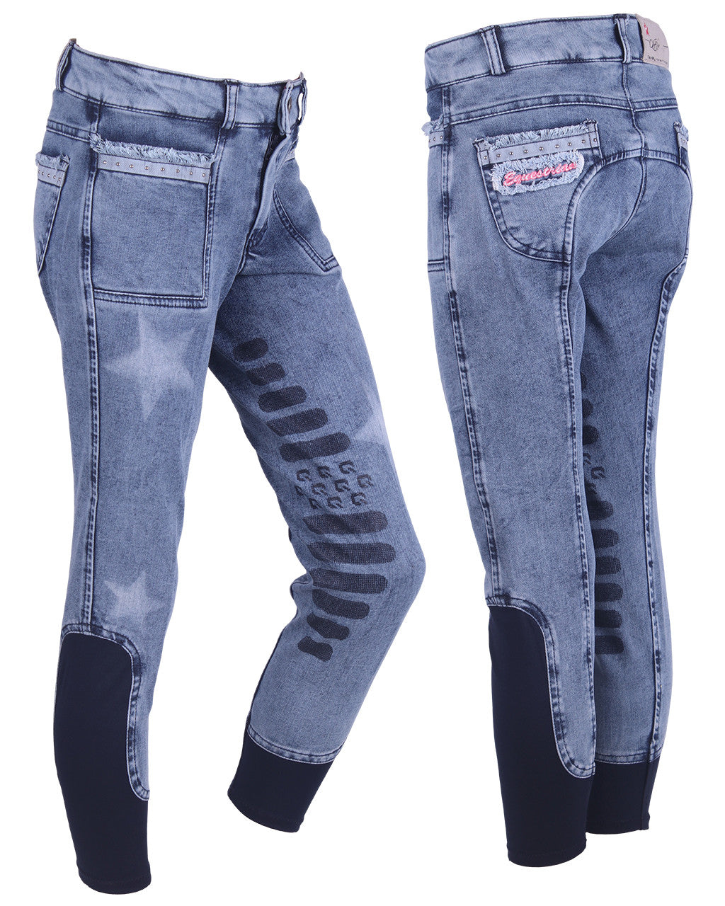 Cool denim riding breeches with star print on the front and sporty silicone print on the legs. The handy pockets are decorated with studs and a frayed edge. The left back pocket has an extra patch with a frayed edge and "Equestrian" embroidery.