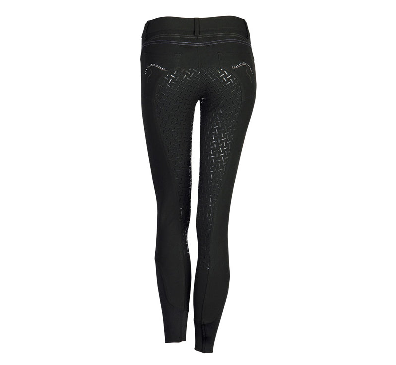 Riding breeches with contrast stitching and crystals, two side pockets and two back pockets, round-stitched seat with silicone print for extra grip in the saddle, lycra flex legs