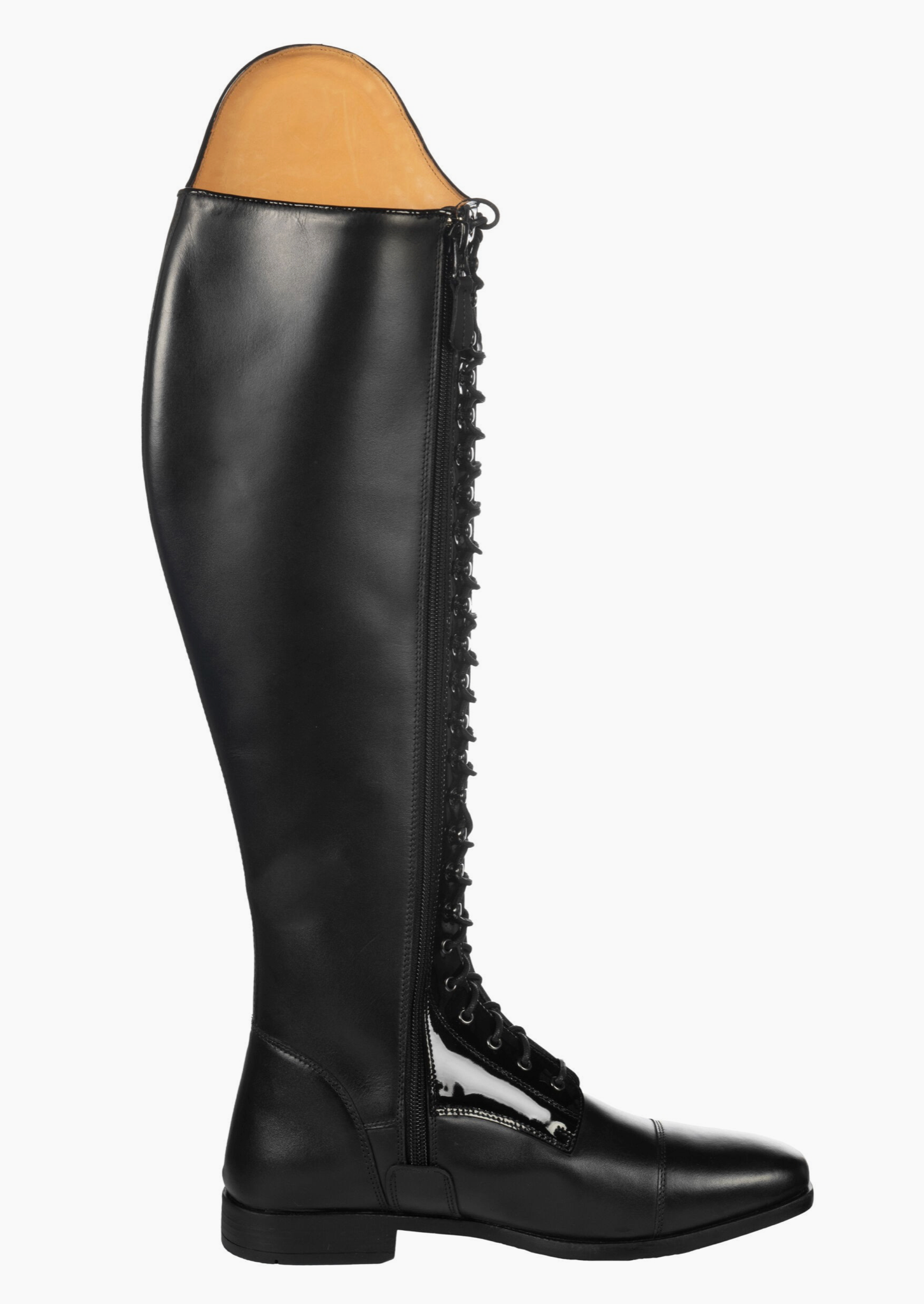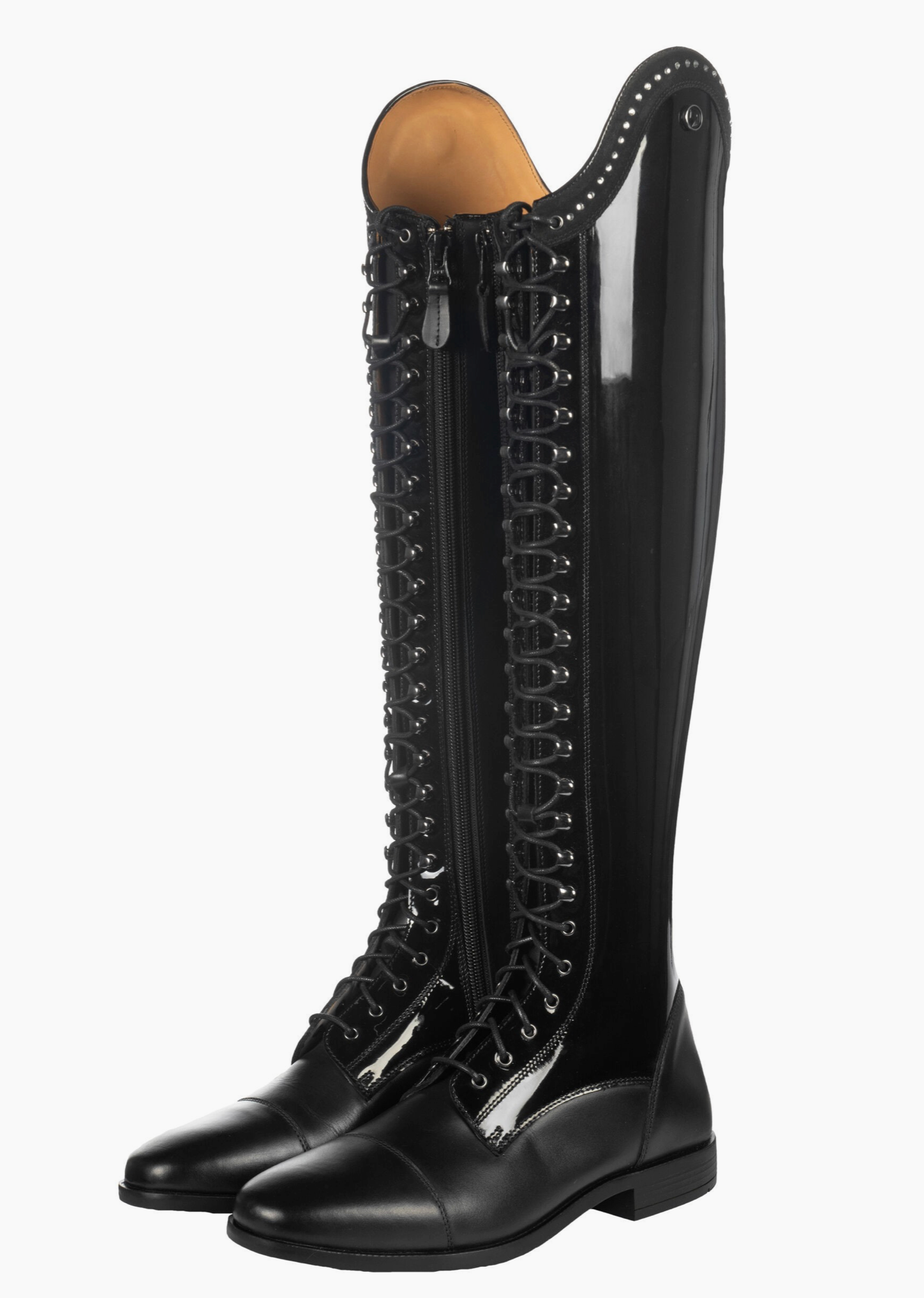 De Amalfi lak rijlaarzen van Lauria Garrelli combineren exclusief design met de hoogste kwaliteit en functionaliteit. Gemaakt van het fijnste leer met elegante lakleren details. Ze zien er niet alleen elegant uit, maar bieden ook maximaal comfort. De voering van echt leer zorgt voor een aangenaam draagcomfort, terwijl de binnenzool van traagschuim voor perfecte ondersteuning en demping zorgt. De slanke voetvorm en de geraffineerde vetersluiting geven de laars een stijlvol silhouet. Dankzij de hoogwaardige rits aan de zijkant is een gemakkelijke instap gegarandeerd. De licht verstevigde buitenkant zorgt voor een stabiele beenligging, terwijl de hoge dressuurstrik met fonkelende strass-steentjes een verfijnde touch toevoegt - een must-have voor veeleisende ruiters met stijl.