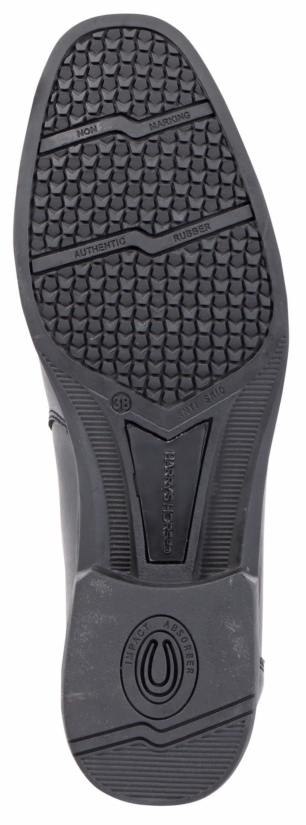 Synthetic leather riding boot with front zip including protective flap that is easy to open and close. With elastic insert at the back.