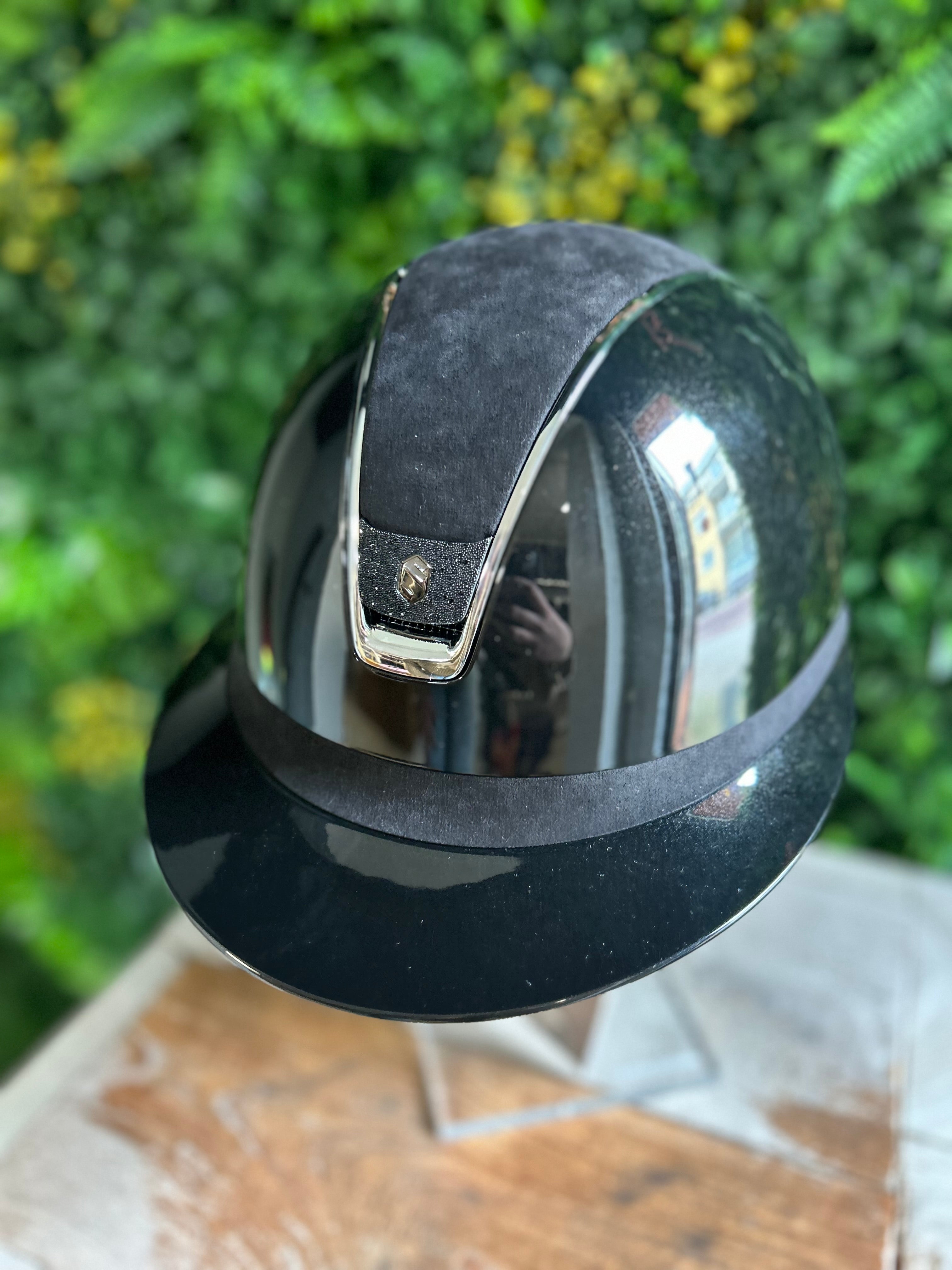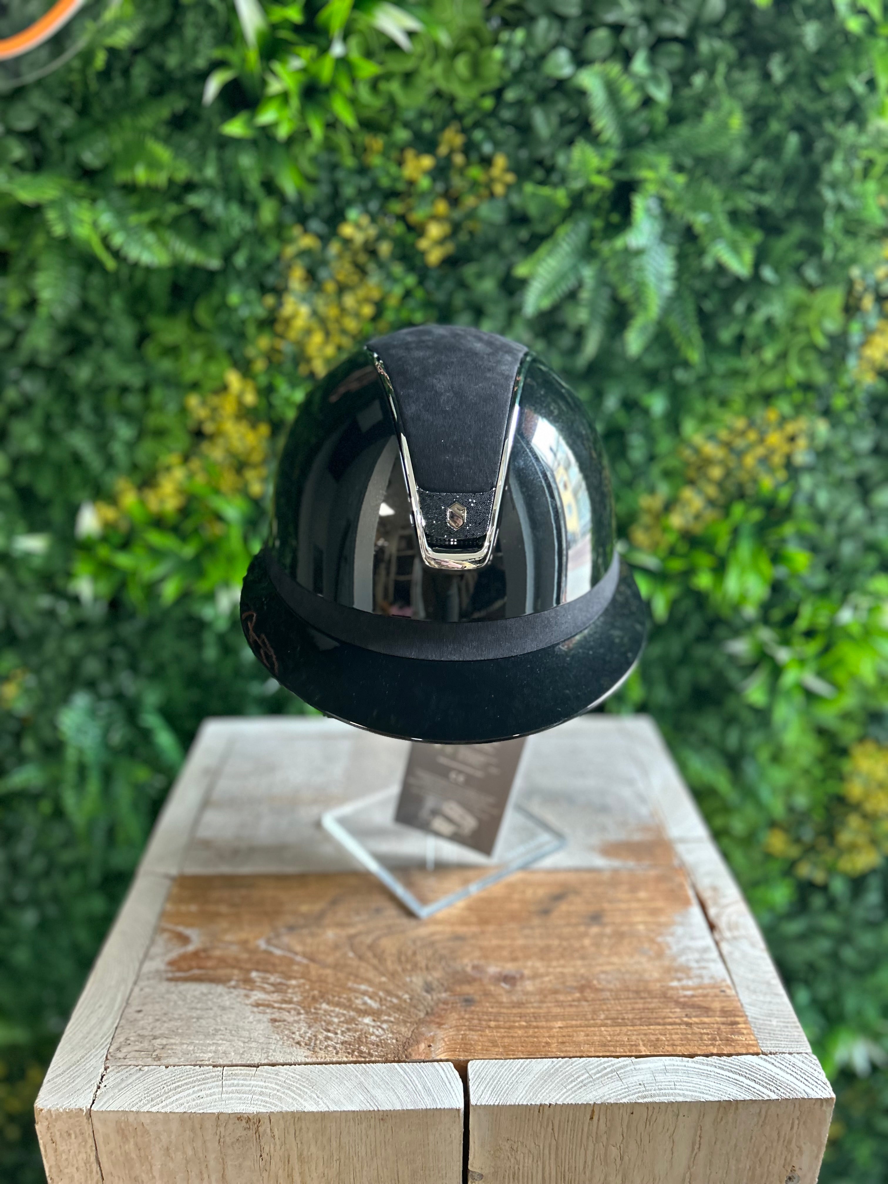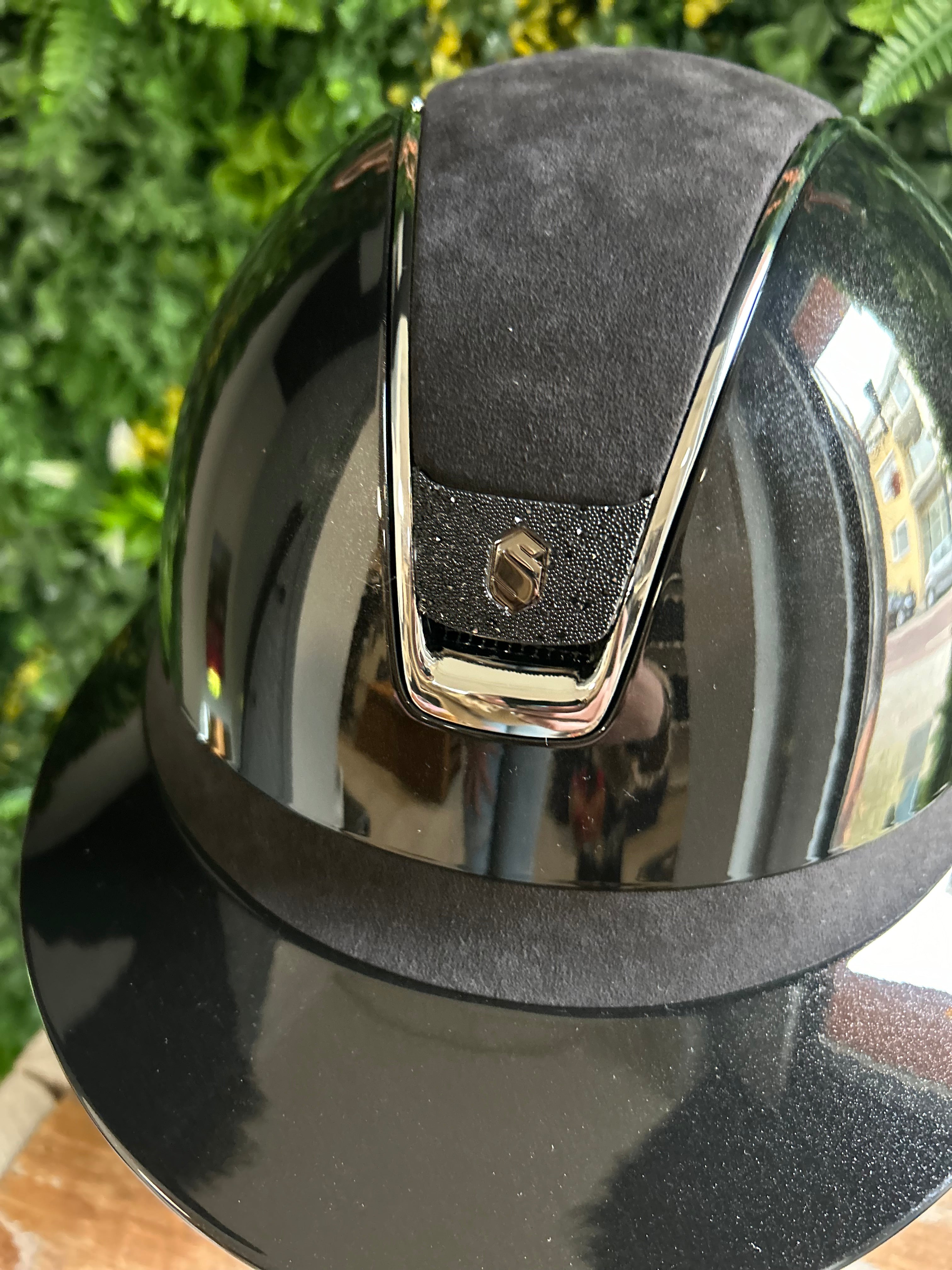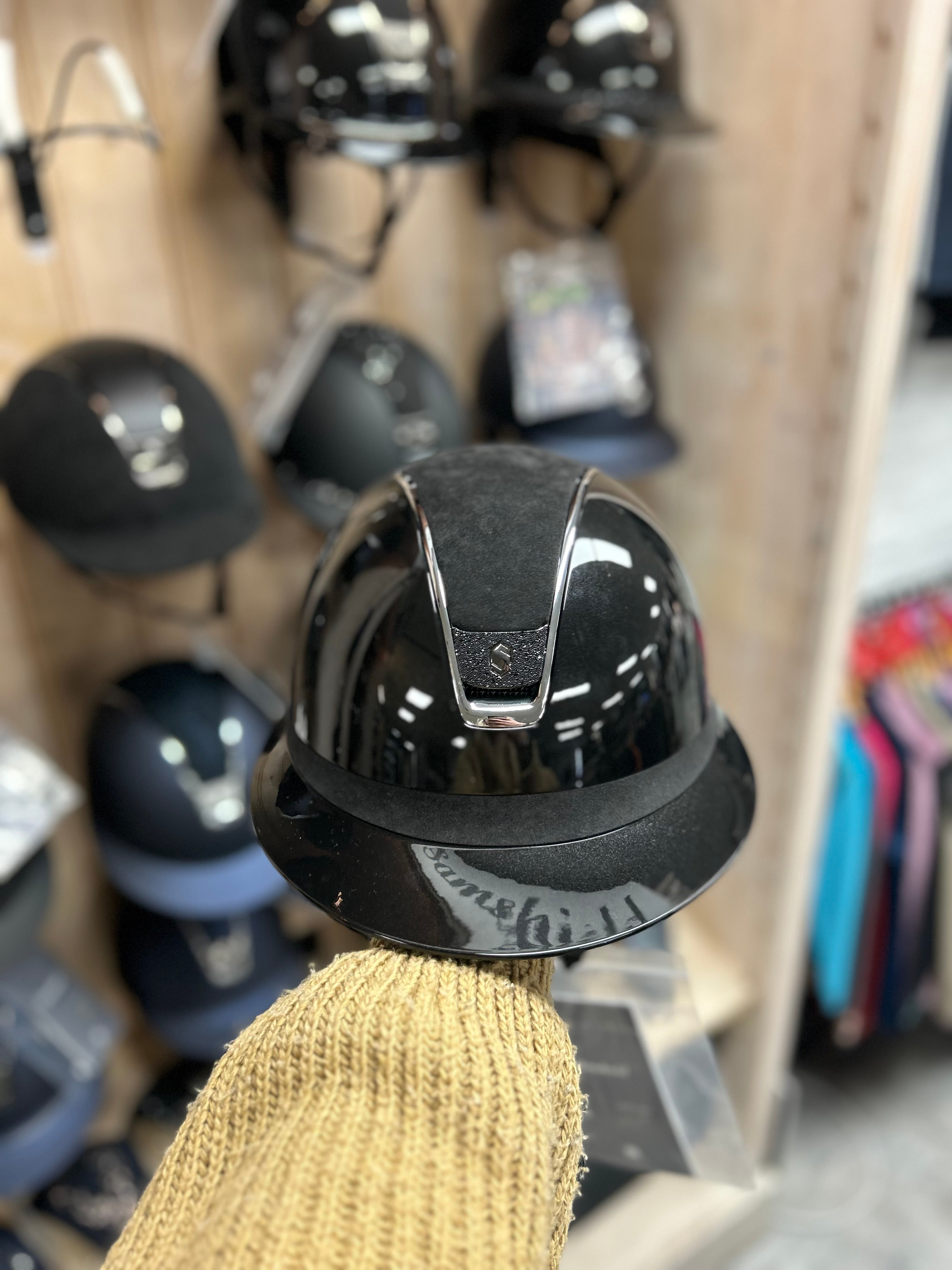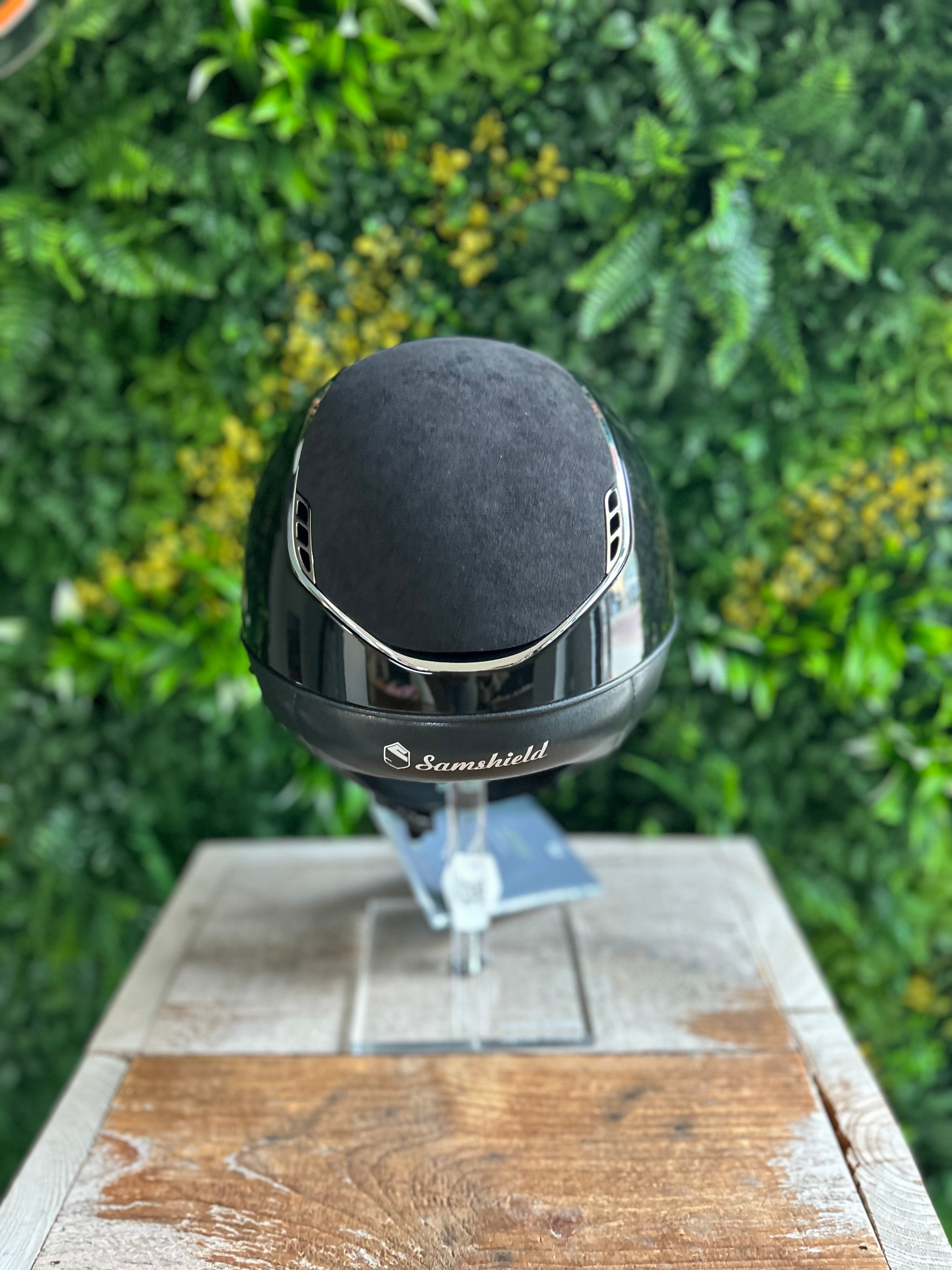 This Samshield 2.0 Miss Shield Shadowglossy Alcantara top and Crystal Fabric blazon is finished with a shadowglossy outer shell and is available in 2 basic colors, black and blue. The helmet is equipped with the popular Miss Shield peak and is equipped with a chrome trim and silver crystal fabric blazon. The top is equipped with Alcantara. The straps on the helmet are made of artificial leather. This helmet is supplied including liner and a protection backpack. Inquire about the possibilities and the associated price/stock of this Samshield 2.0 Miss Shield Shadowglossy. This is due to a possible delivery time of several weeks. Would you prefer something different on this helmet? Please send us an email.