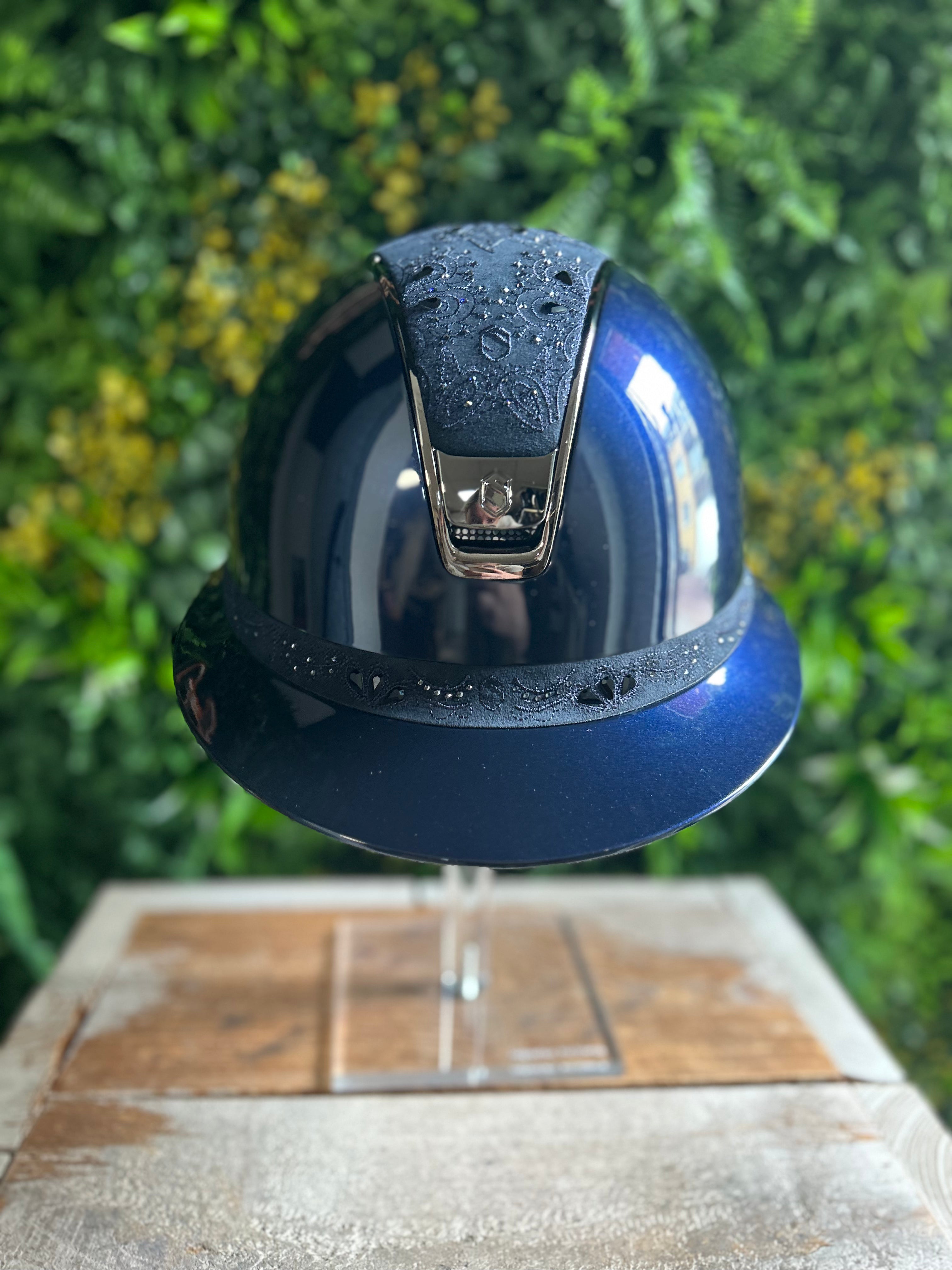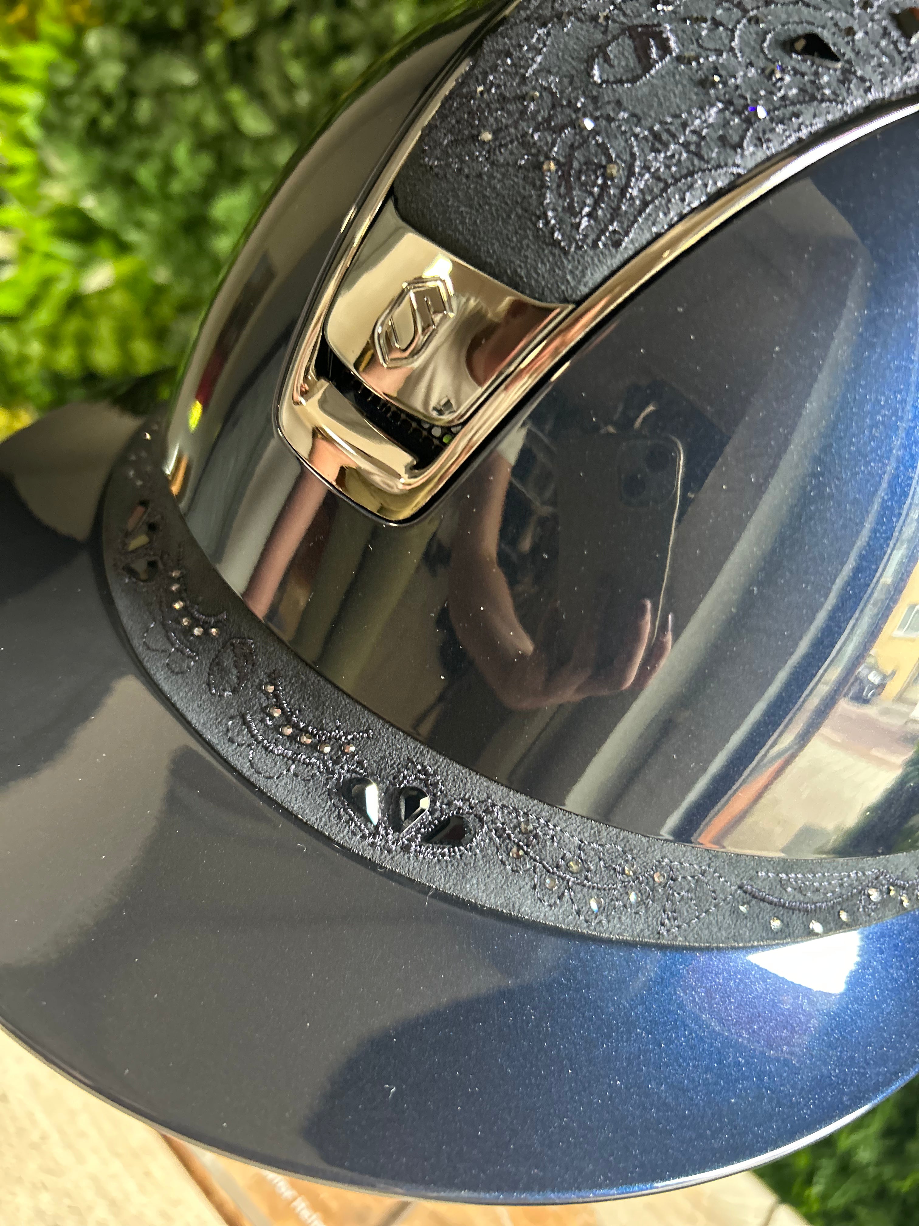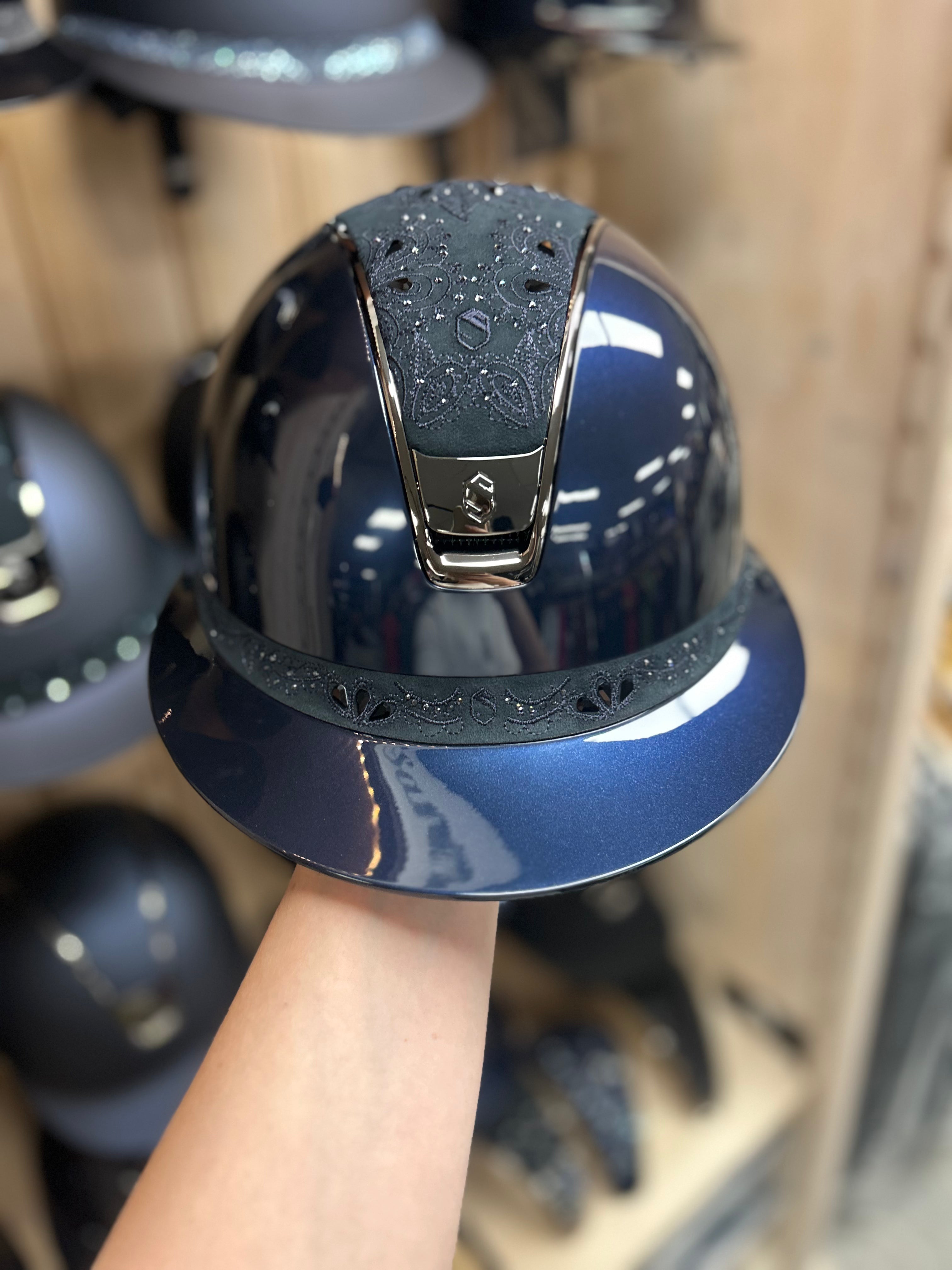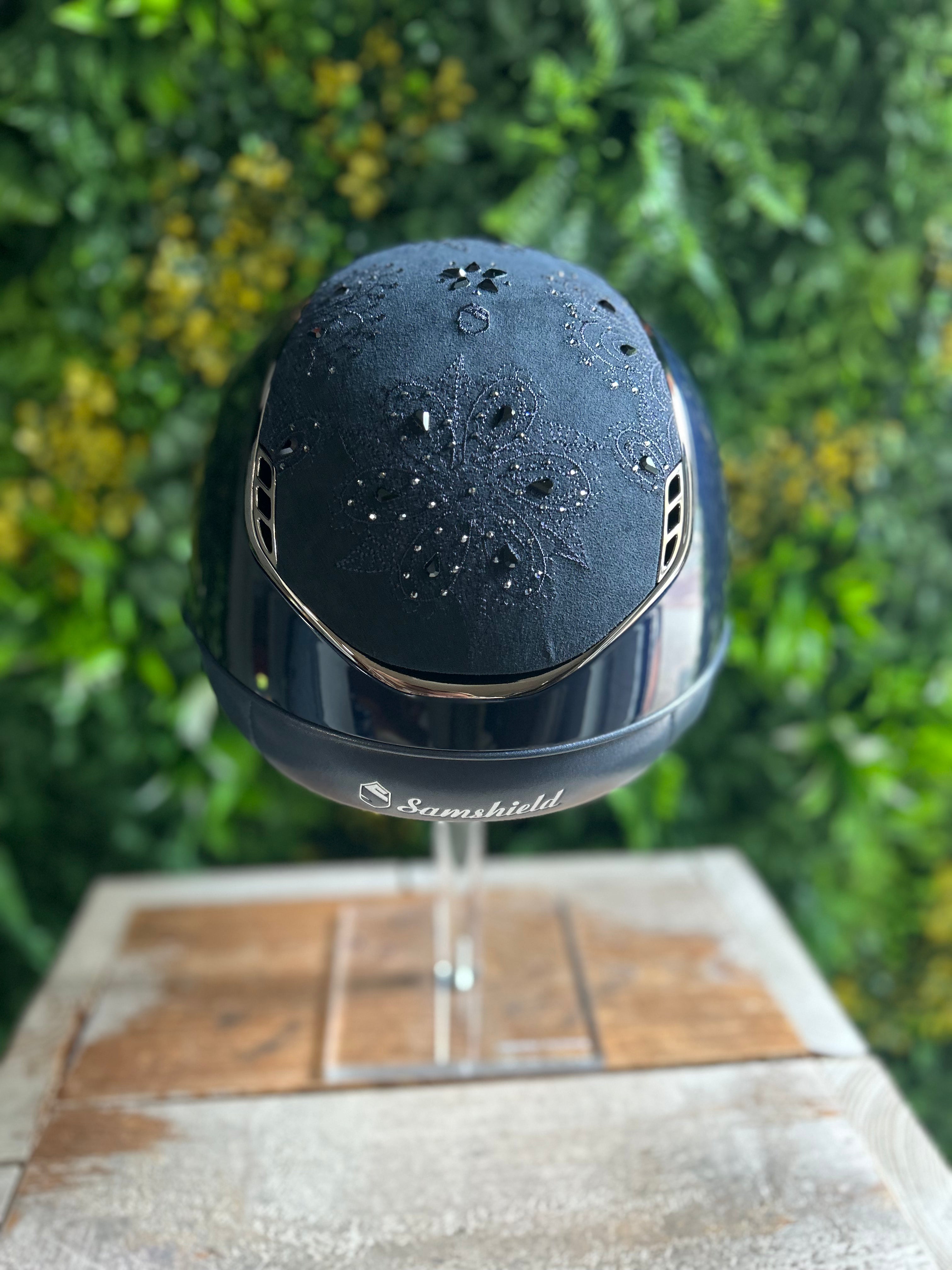 Luxe Miss Shield Samshield cap in een shadowglossy uitvoering met een crystalboom top en band en een chrome zwarte trim en blazon voor een chique uitstraling.