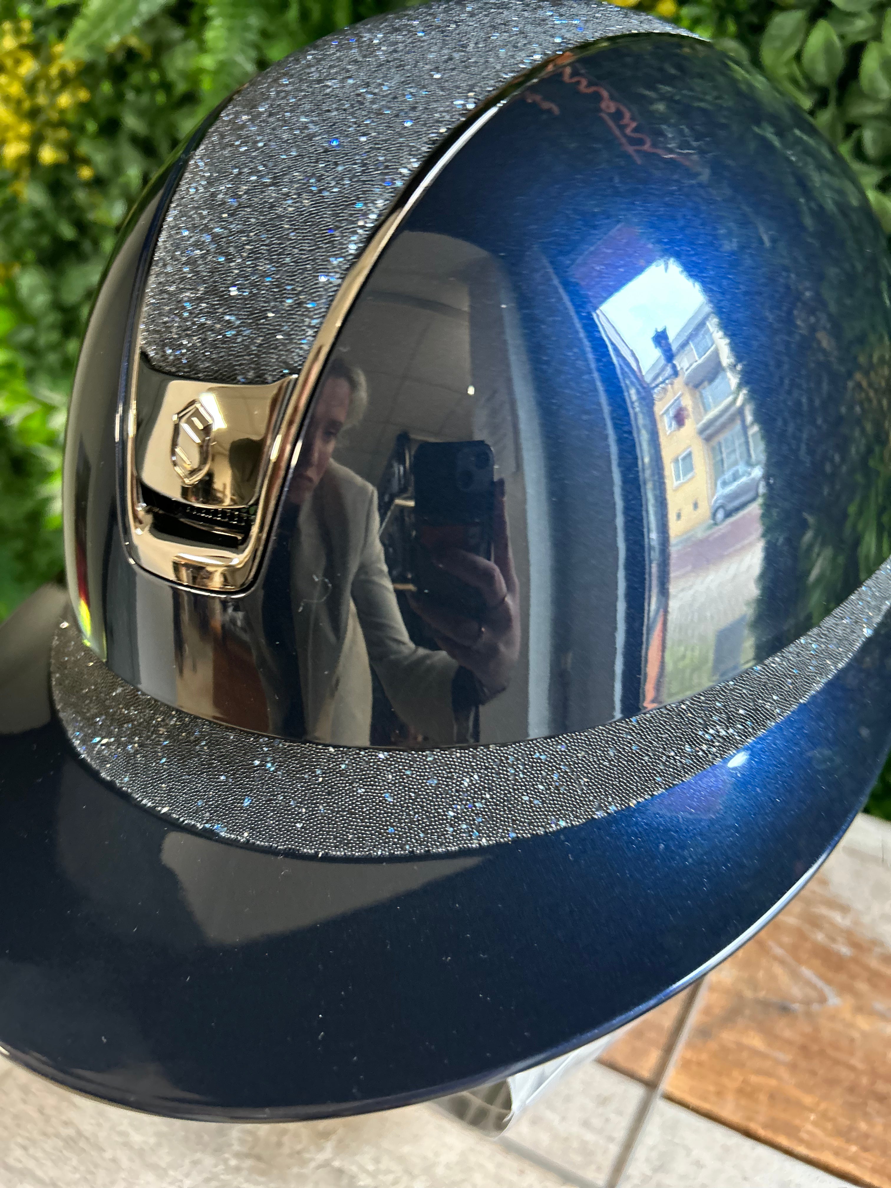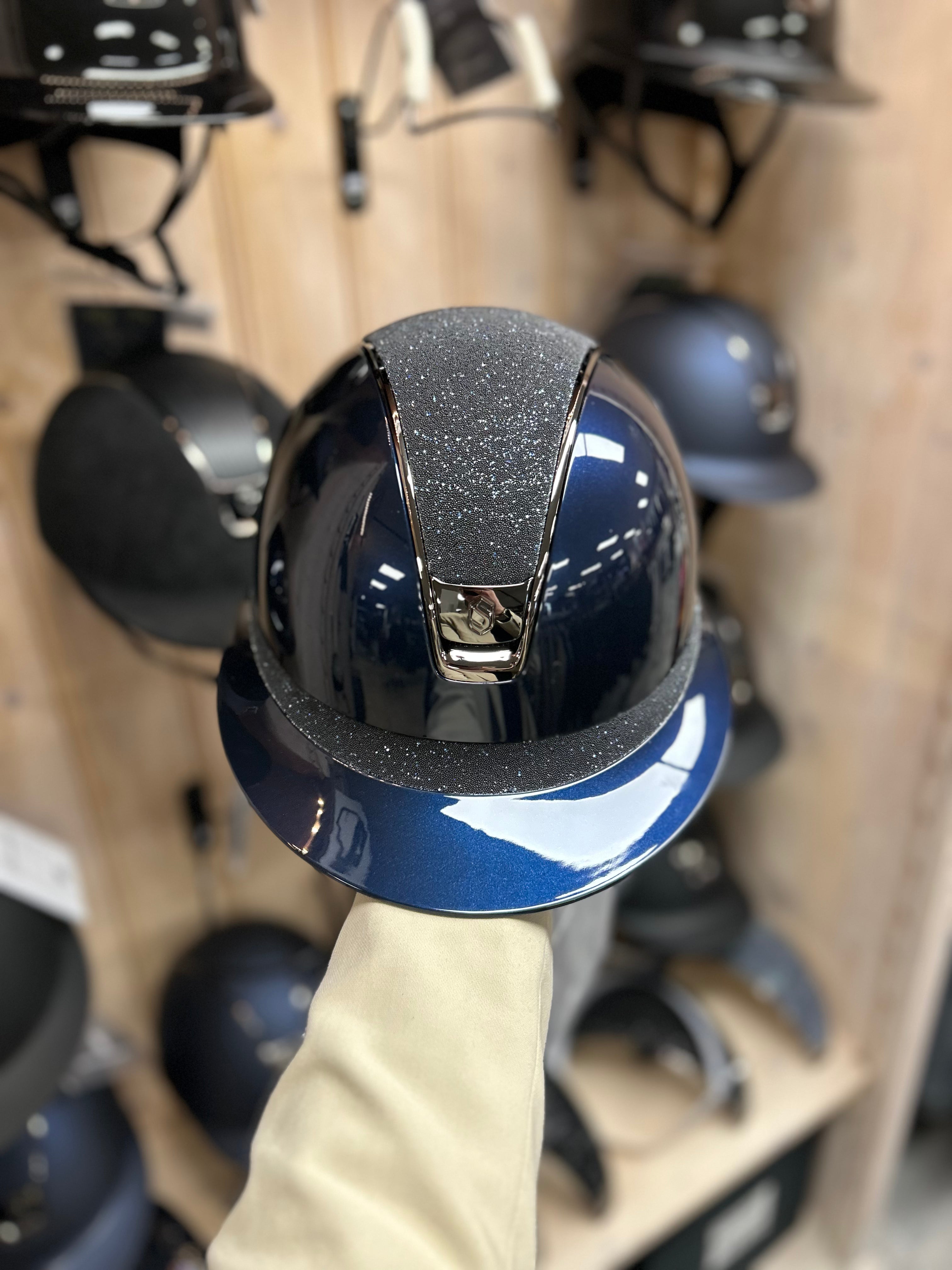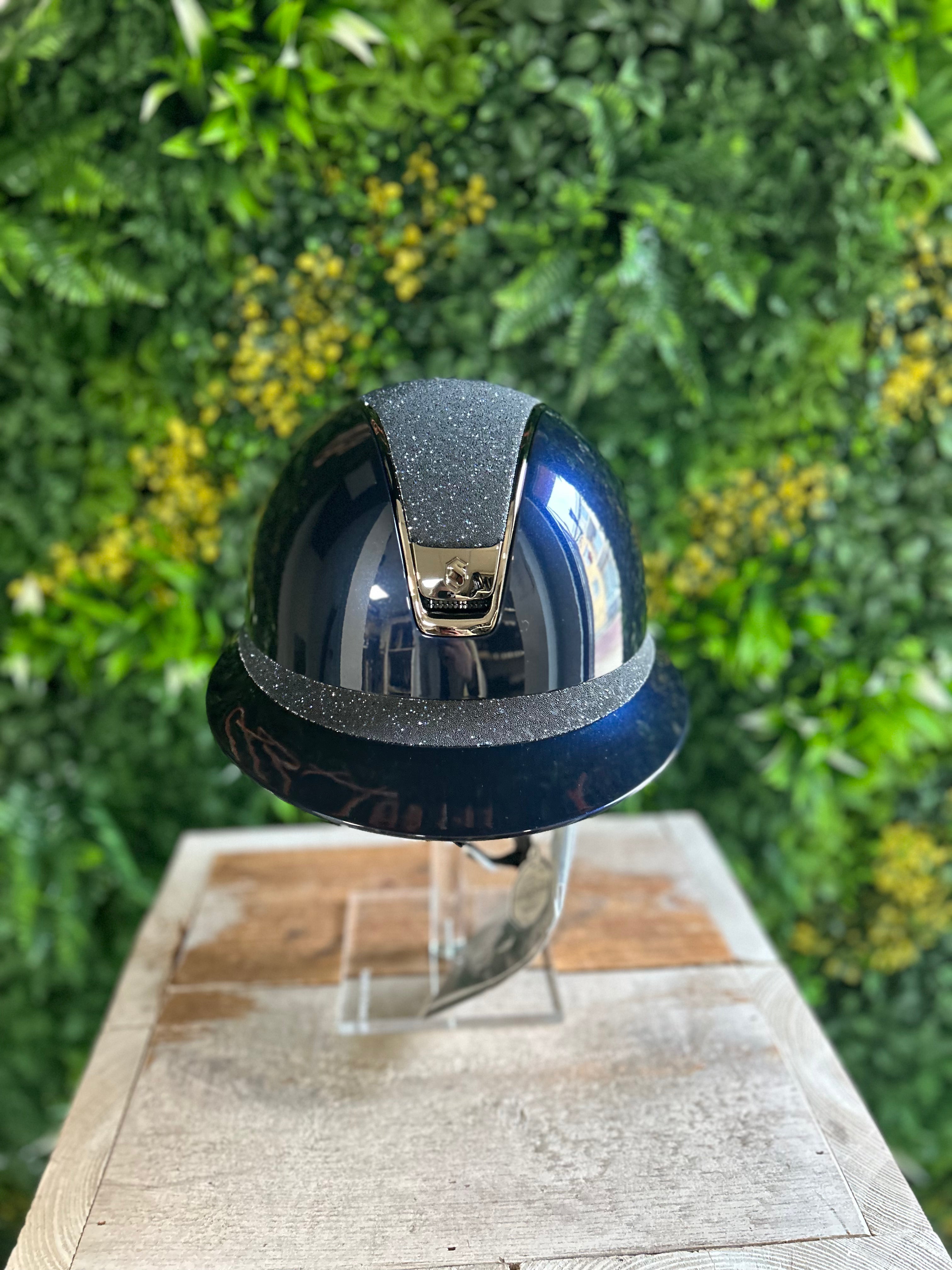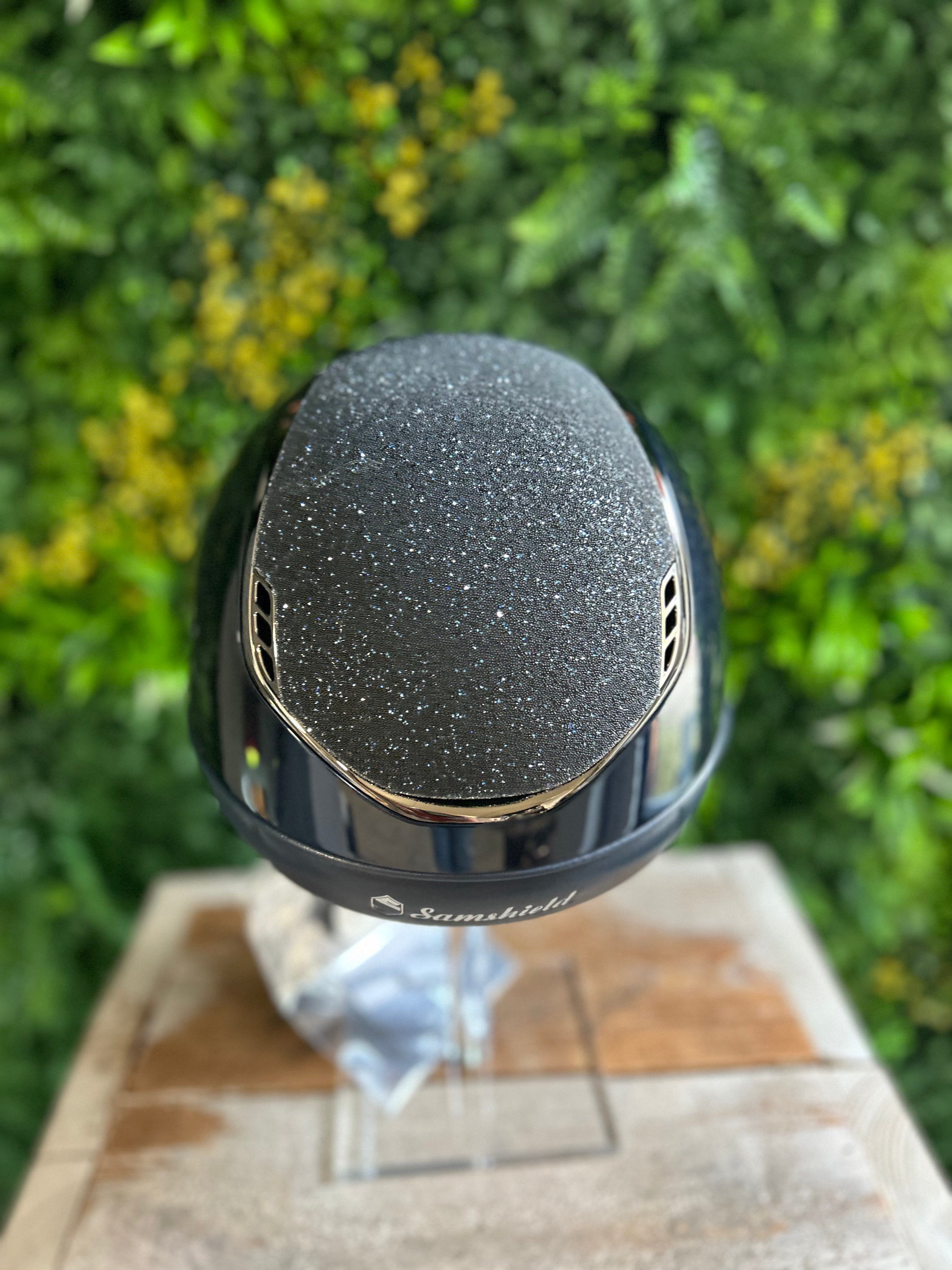 This Samshield 2.0 Miss Shield Shadowglossy Crystal Fabric Swarovski Summer Night top and frontal band is finished with a shadowglossy outer shell. The helmet is equipped with the popular Miss Shield peak and is equipped with a chrome black trim and blazon. The top and frontal band are equipped with