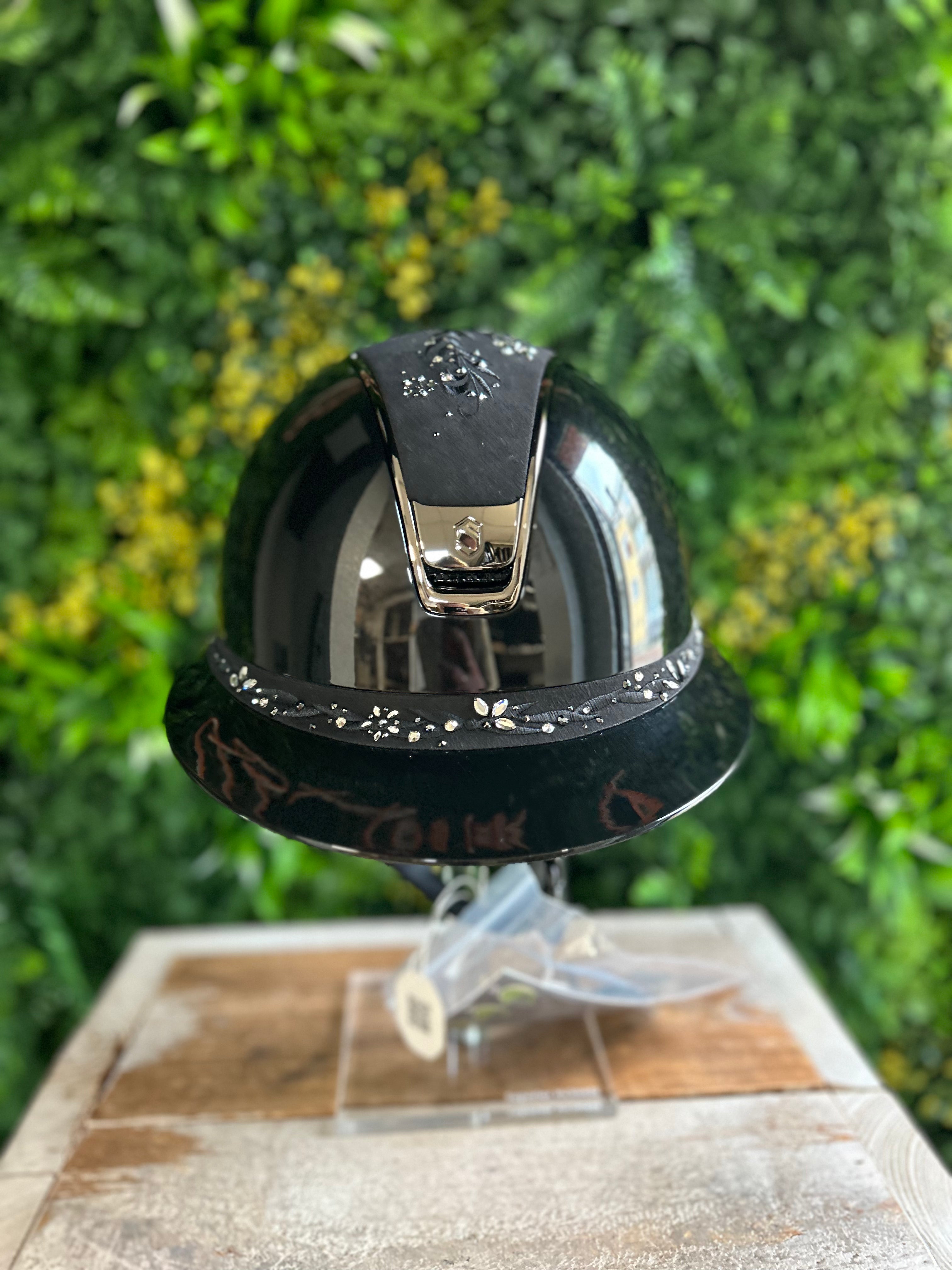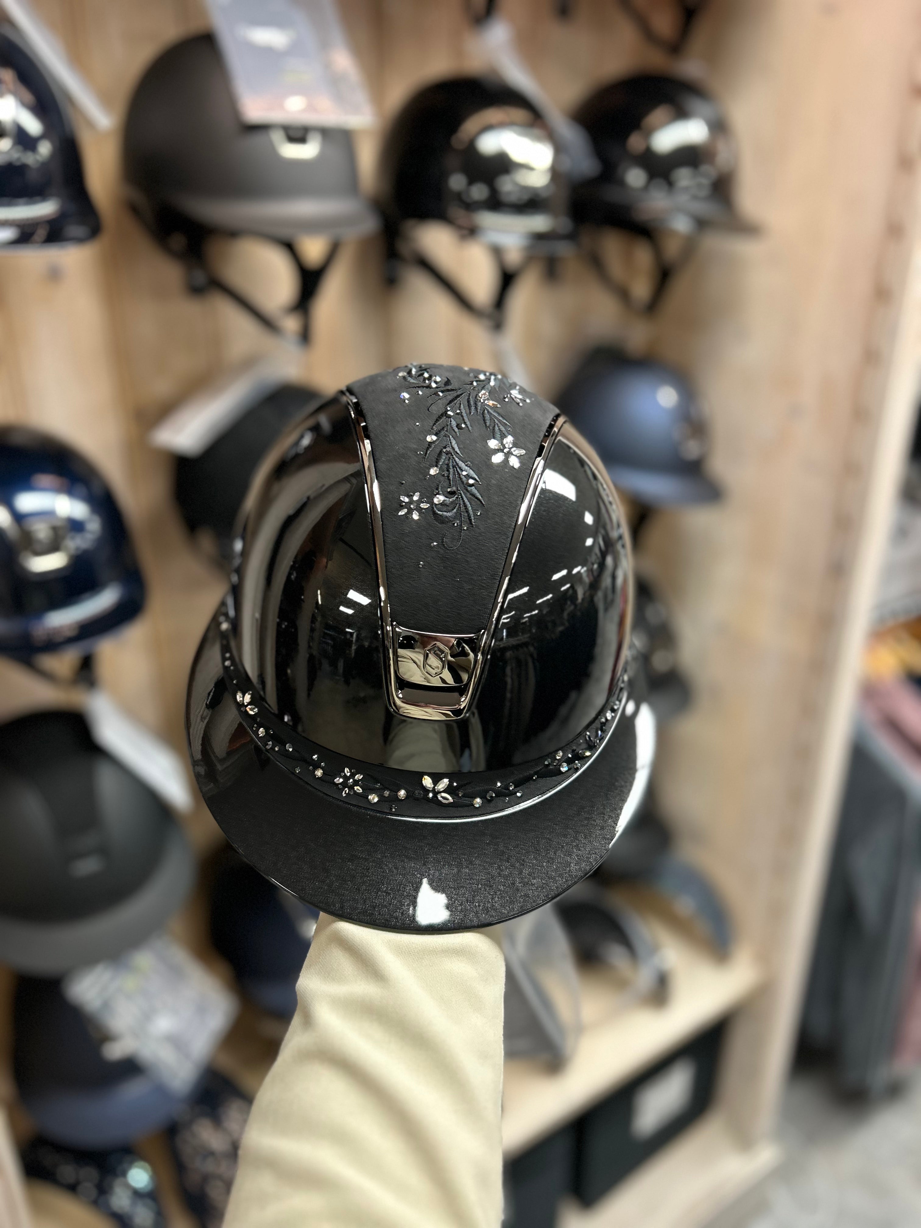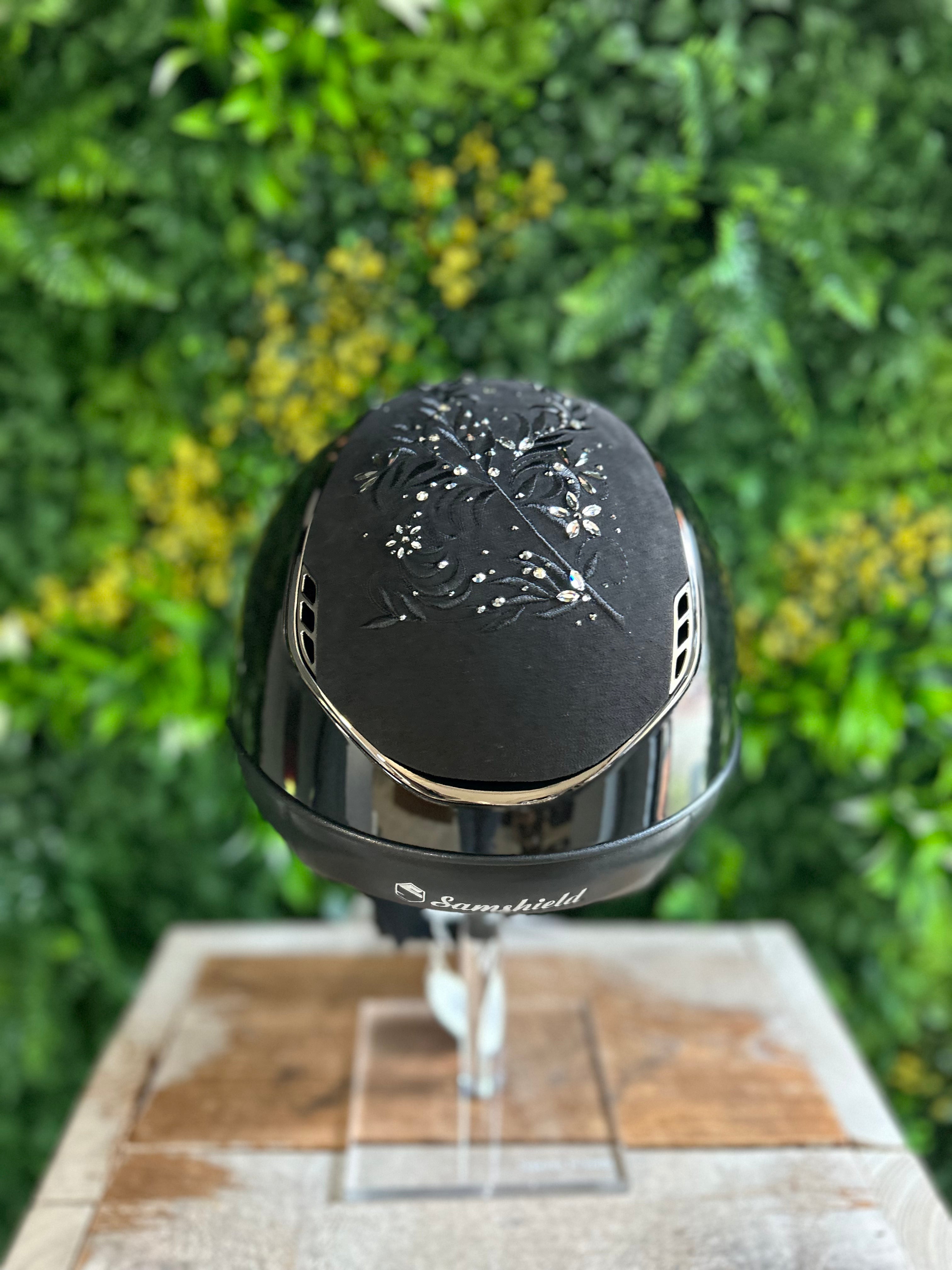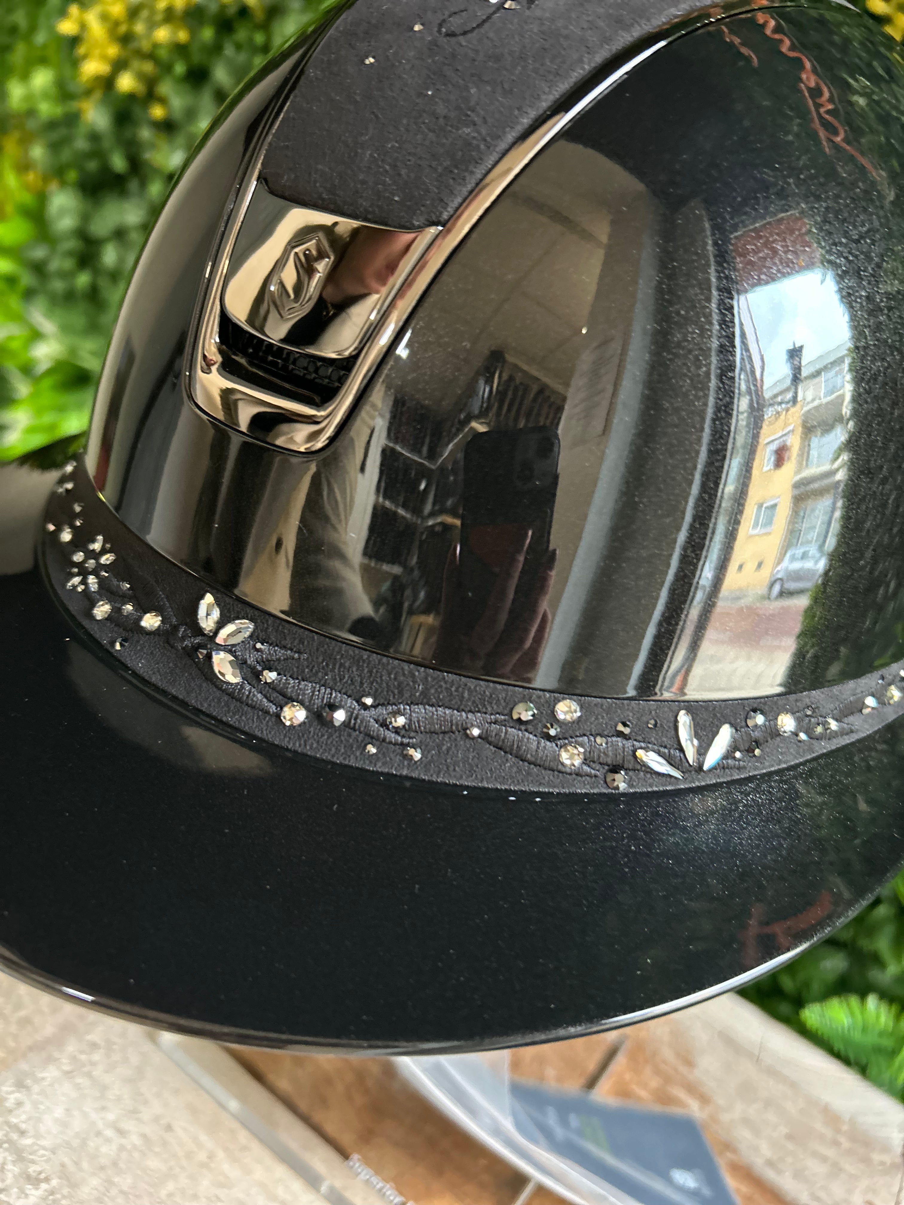 This Samshield 2.0 Miss Shield Shadowglossy Flower Swarovski Jewelry black top and frontal band and chrome black blazon is finished with a shadowglossy outer shell and is available in 2 basic colors, black & blue. The helmet is equipped with the popular Miss Shield peak and is equipped with a matt black trim and chrome black blazon. The top and frontal band are equipped with Flower Swarovski Jewelry. The straps on the helmet are made of artificial leather. This helmet comes with a liner and a protection backpack.