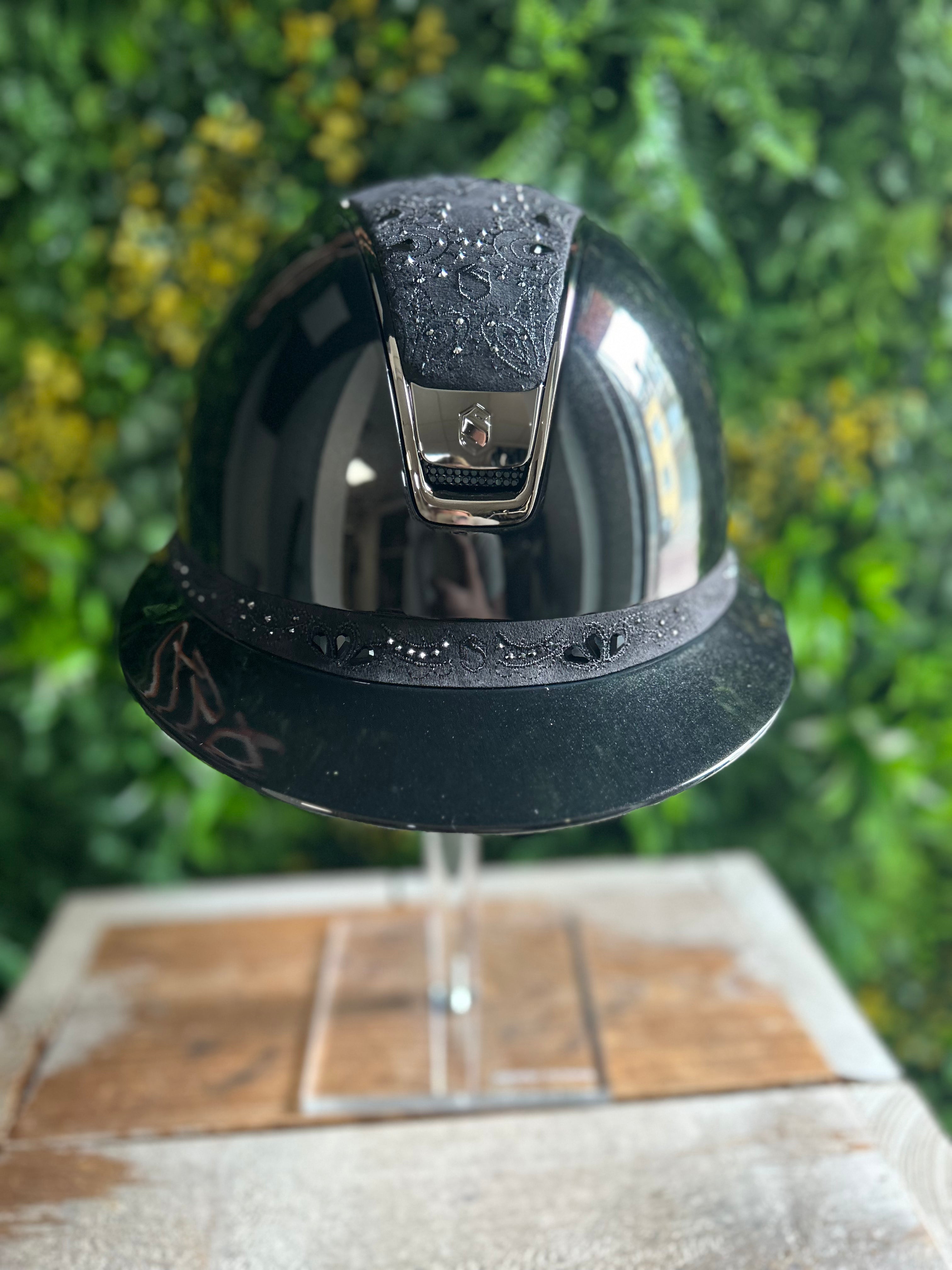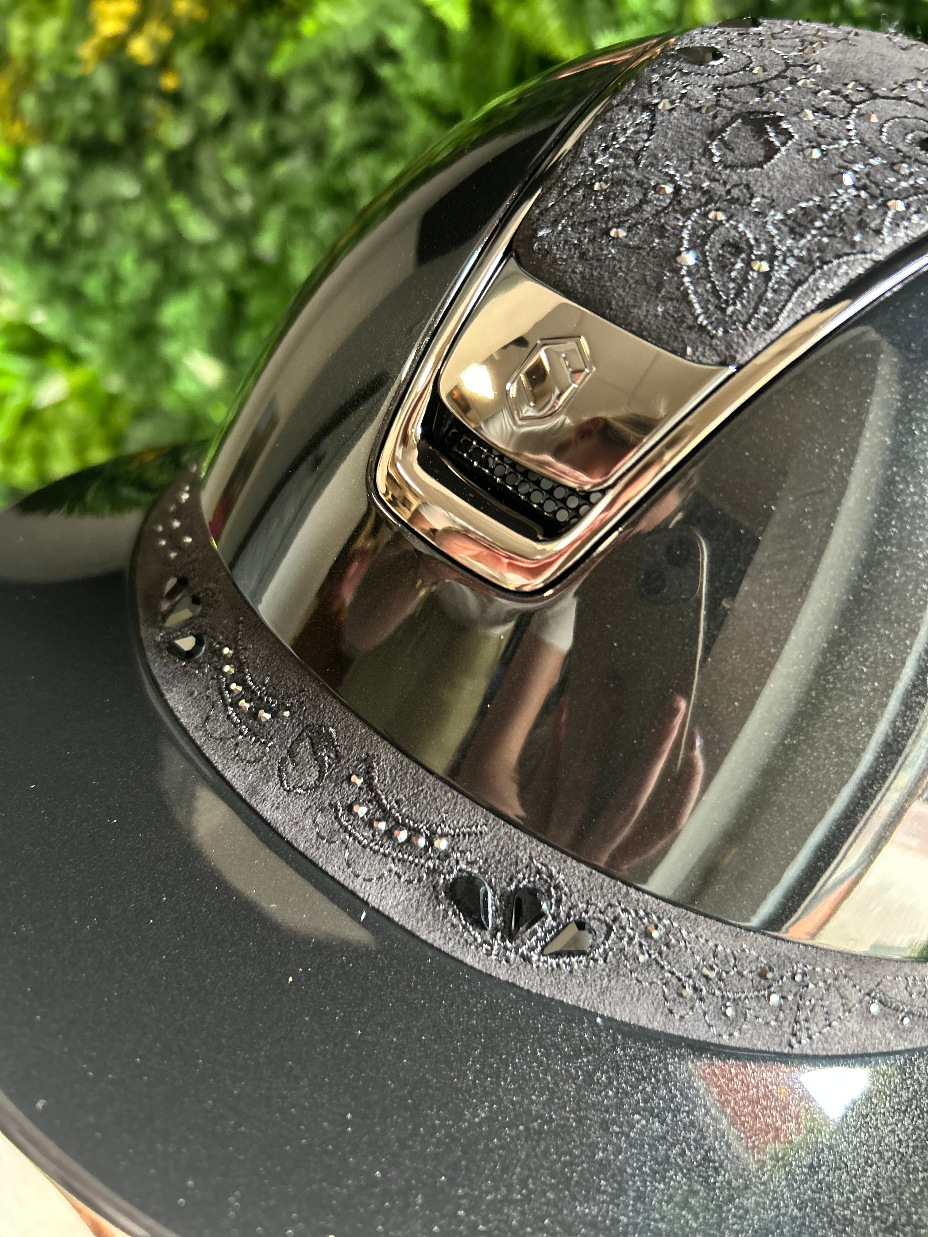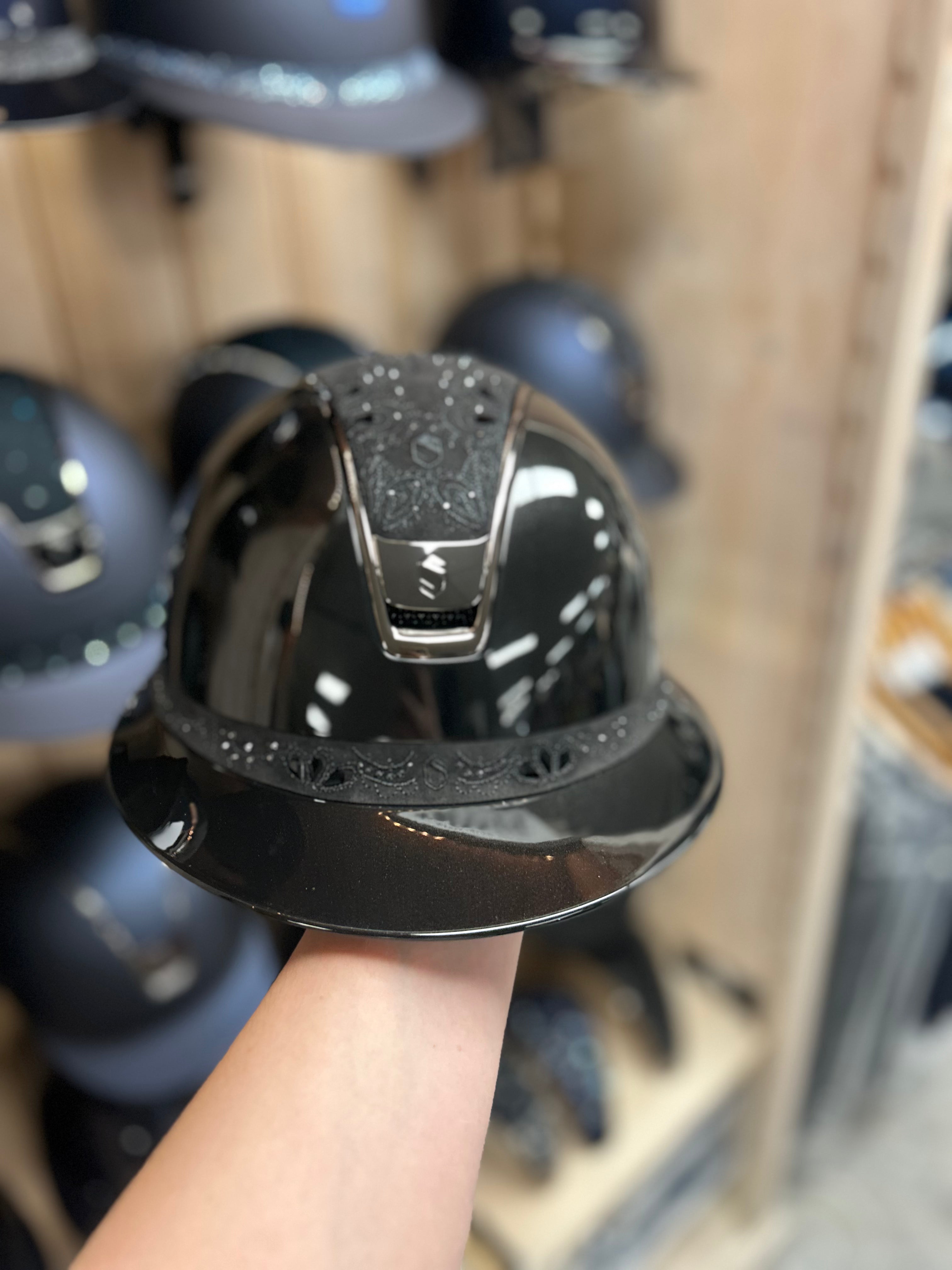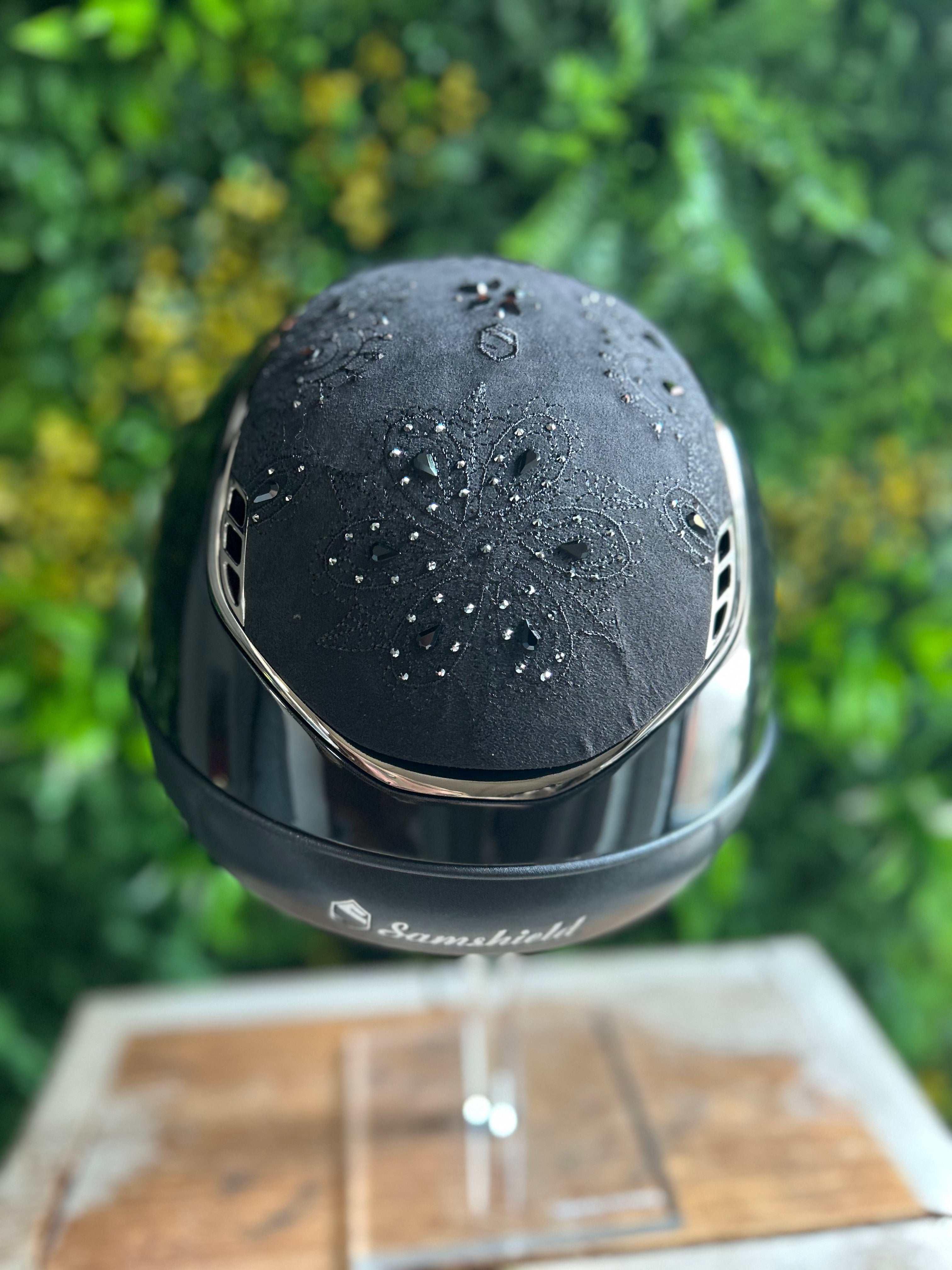 Luxe Miss Shield Samshield cap in een shadowglossy uitvoering met een crystalbloom top en band en een chrome zwarte trim en blazon voor een chique uitstraling.