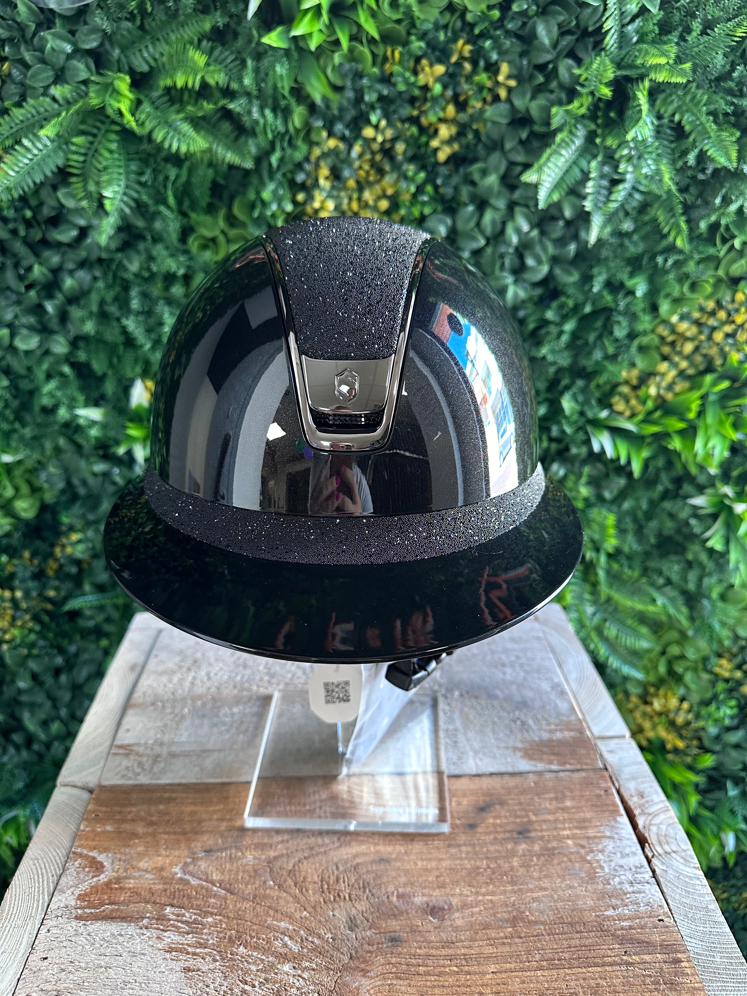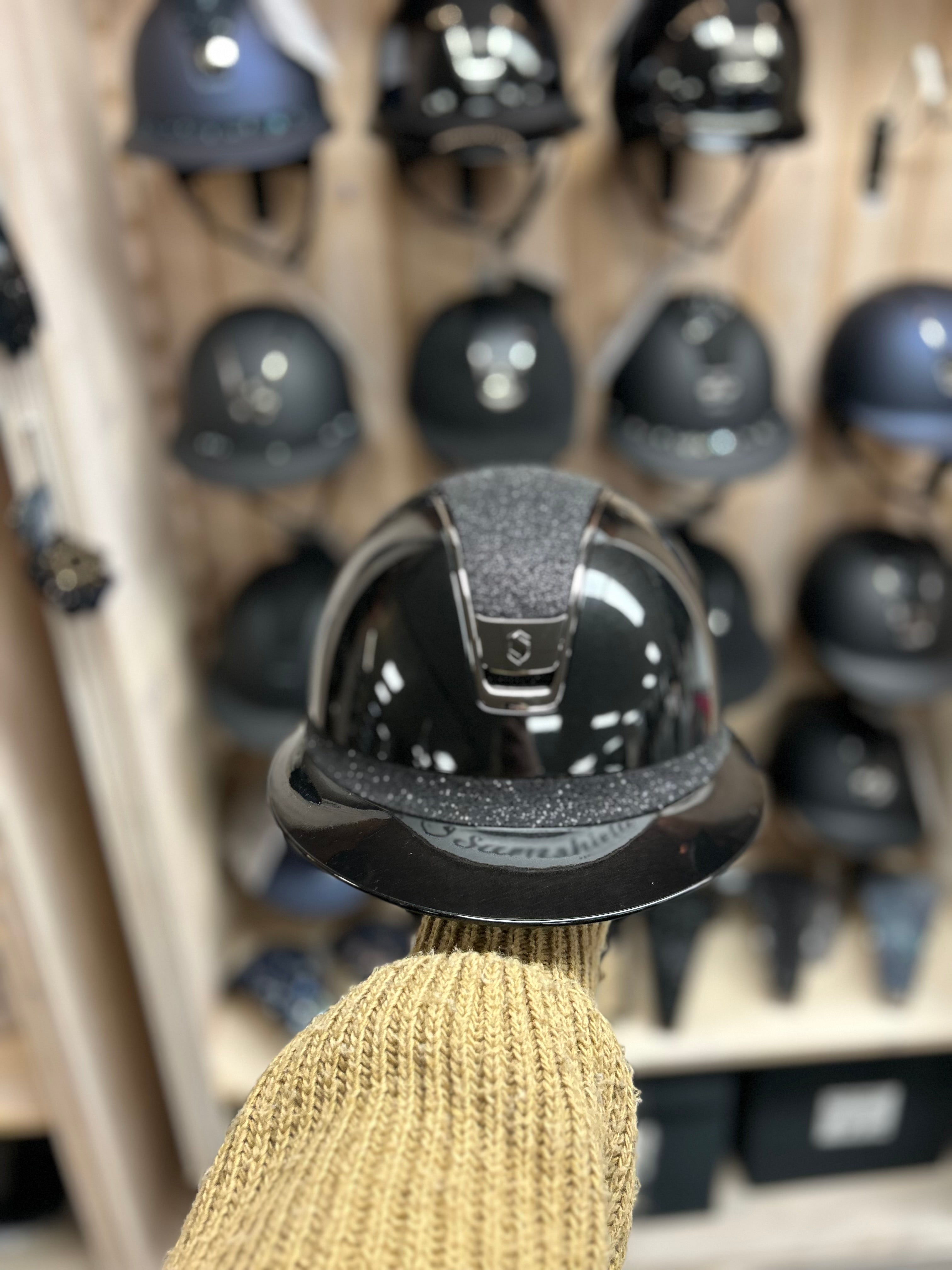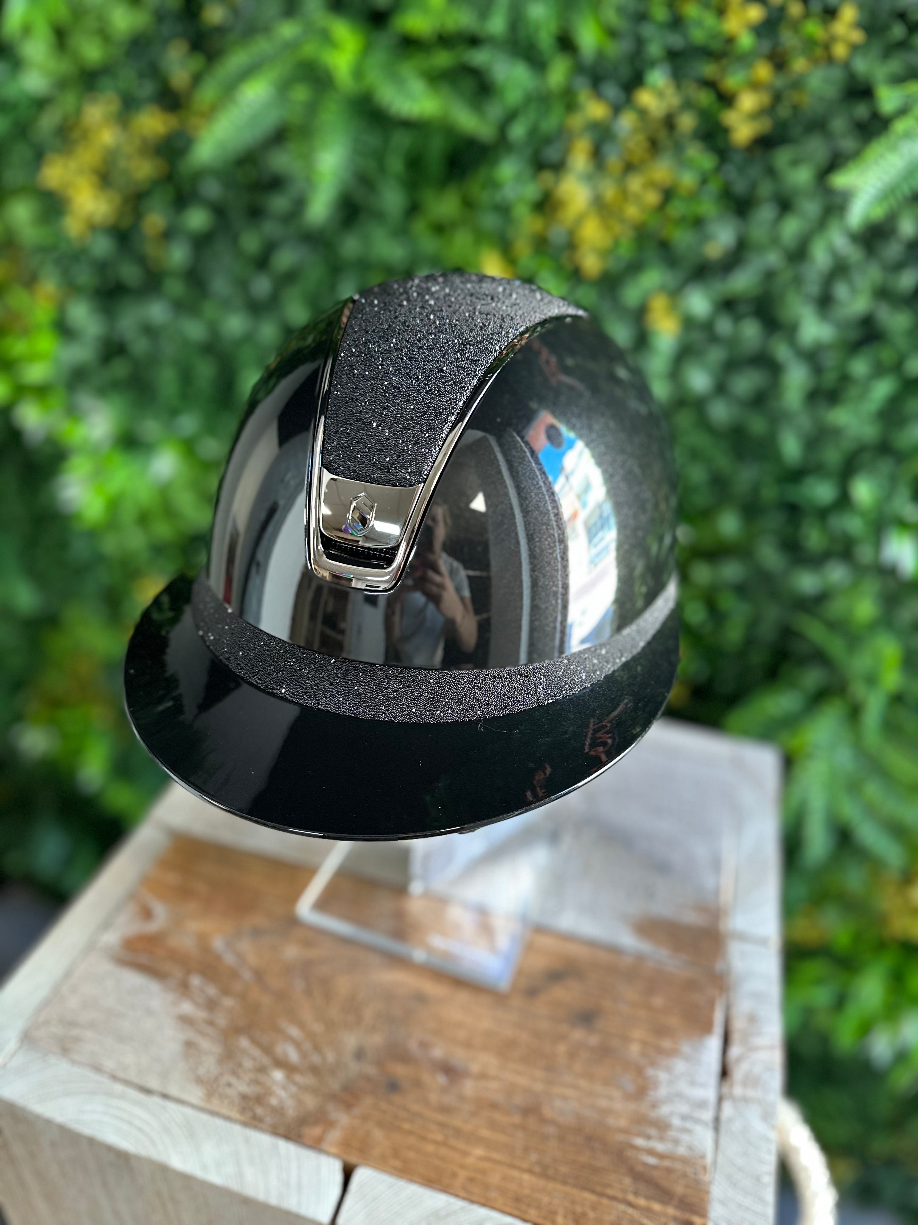 This Samshield 2.0 Miss Shield Shadowglossy Crystal Fabric Swarovski top and frontal band is finished with a shadowglossy outer shell. The helmet is equipped with the popular Miss Shield peak and is equipped with a chrome black trim and blazon. The top and frontal band are equipped with
