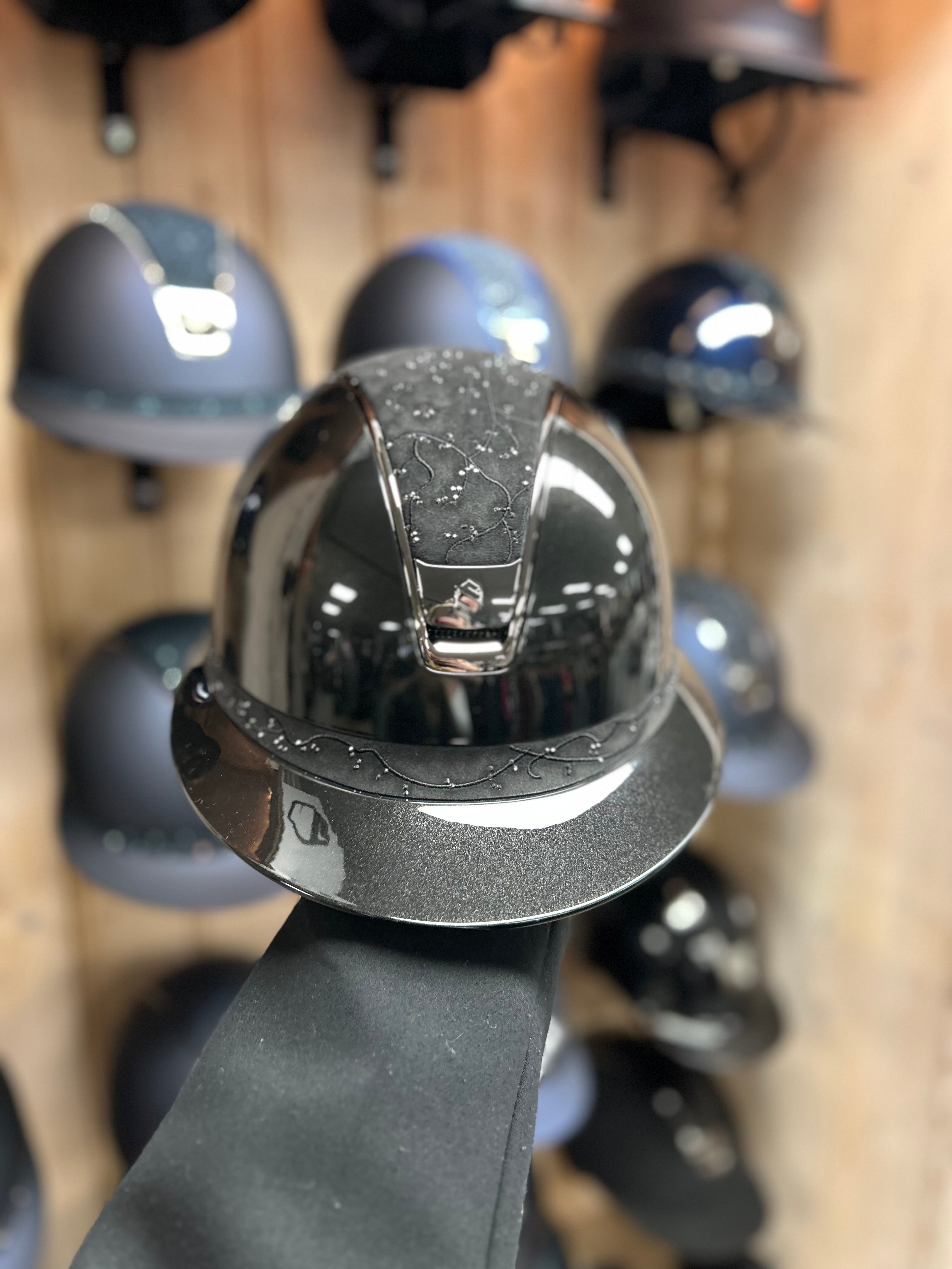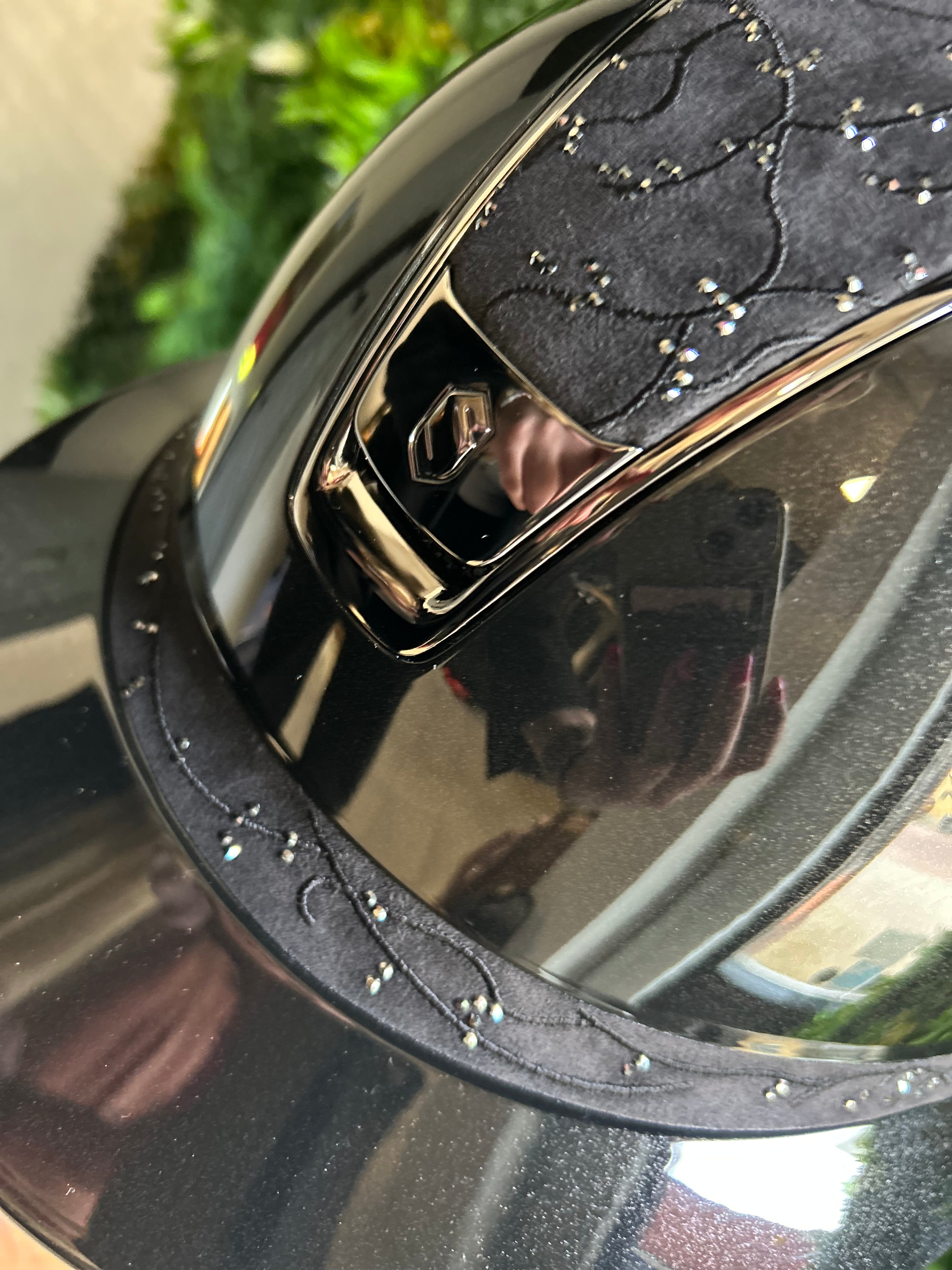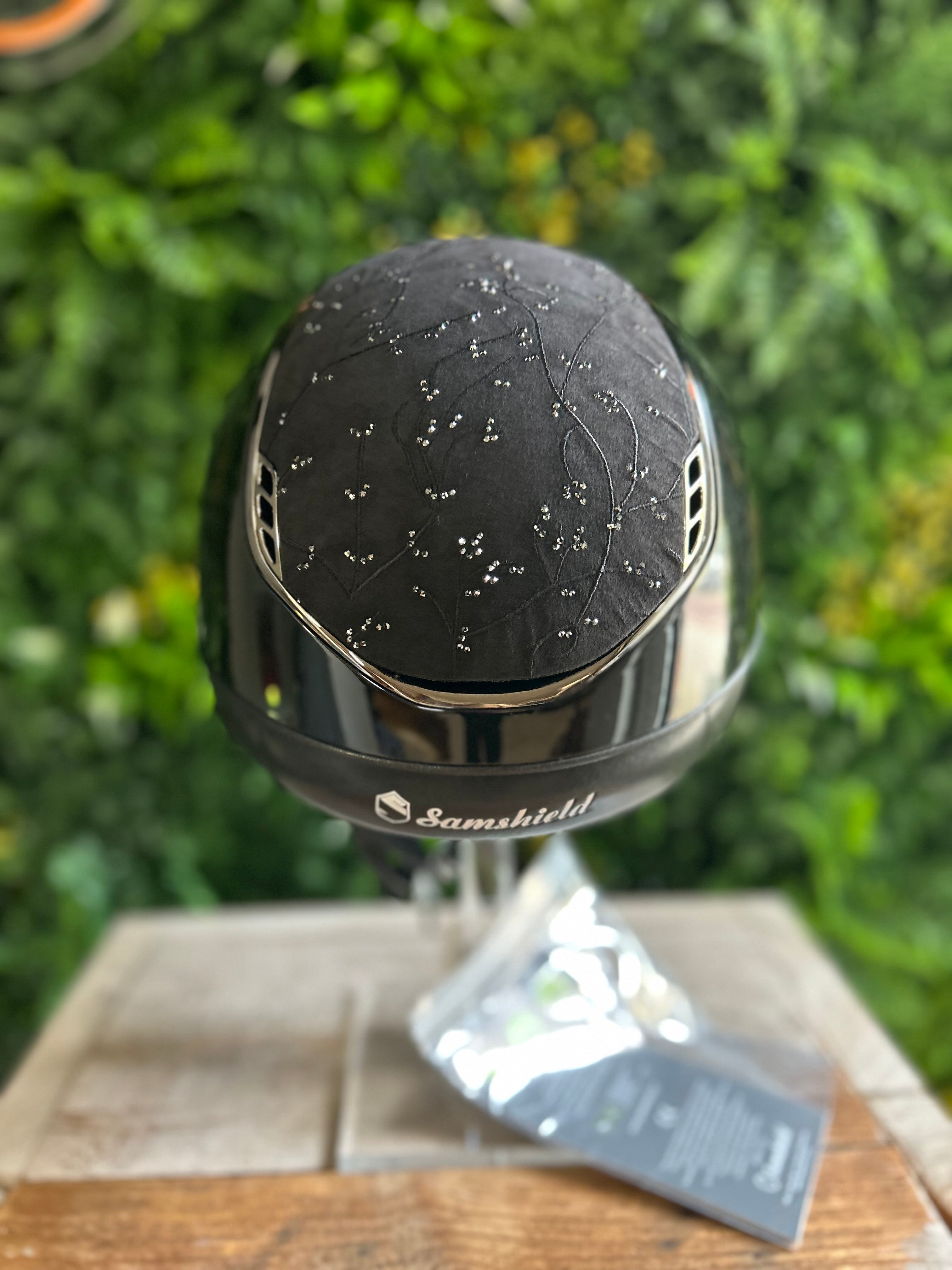 This Samshield 2.0 Miss Shield Shadowmatt Crystal Leaf top and frontal band 5 swarovski is finished with a shadowmatt outer shell and is available in 3 basic colors, black, blue and brown. The helmet is equipped with the popular Miss Shield peak and is finished with a matte trim with 5 swarovski stones and a chrome black blazon. The top and frontal band are equipped with Crystal Leaf. The straps on the helmet are made of artificial leather. This helmet comes with a liner and a luxury carrying bag. Inquire about the possibilities and the associated price/stock of this Samshield 2.0 Miss Shield Shadowmatt Crystal Leaf top and frontal band 5 swarovski. This is due to a possible delivery time of a few weeks. Would you prefer something different about this helmet? Please send us an email.