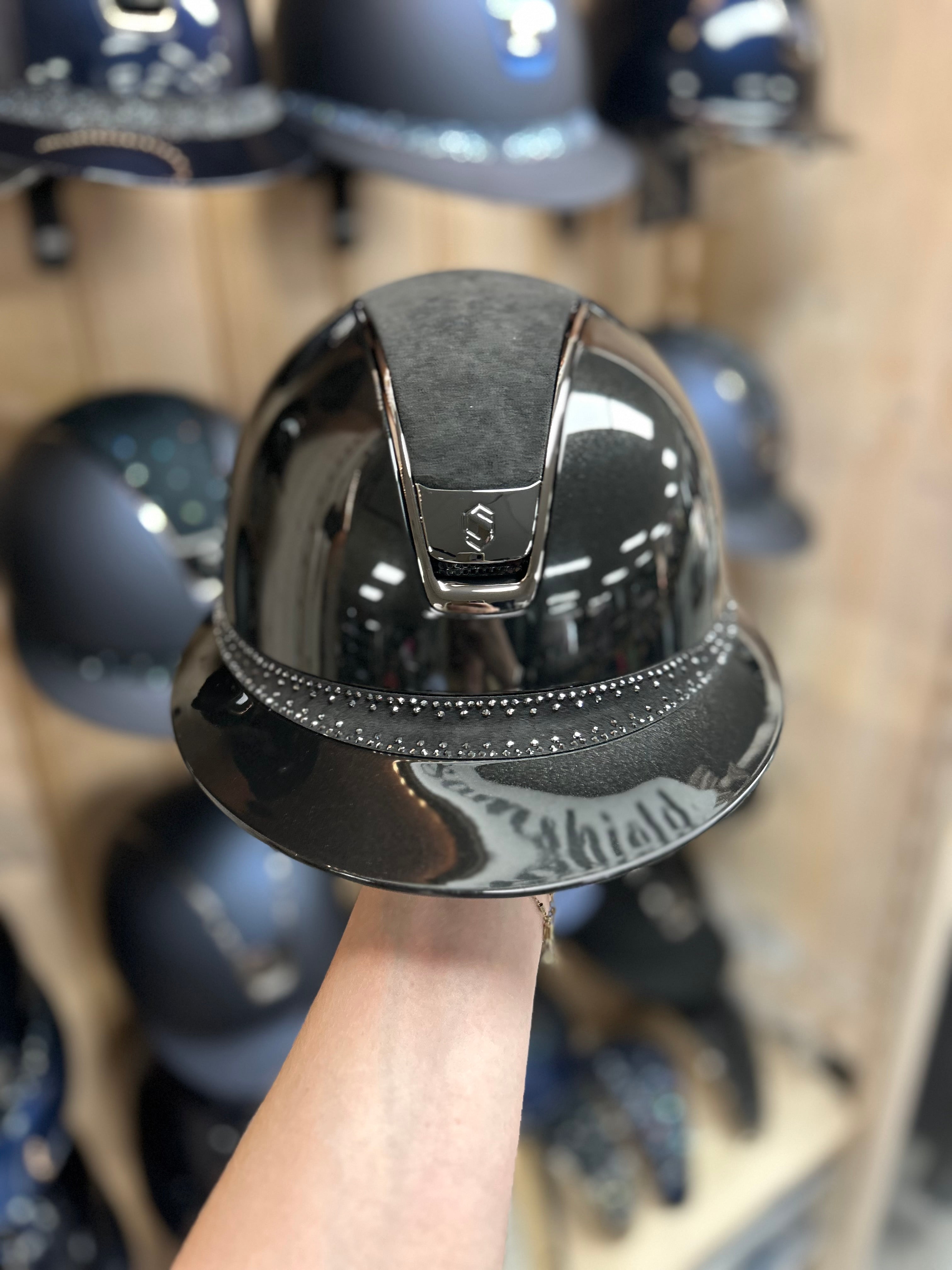 Luxe Miss Shield Samshield cap in een shadowmatt uitvoering met een alcantara top, tiara band en een chrome zwarte trim en blazon voor een chique uitstraling.