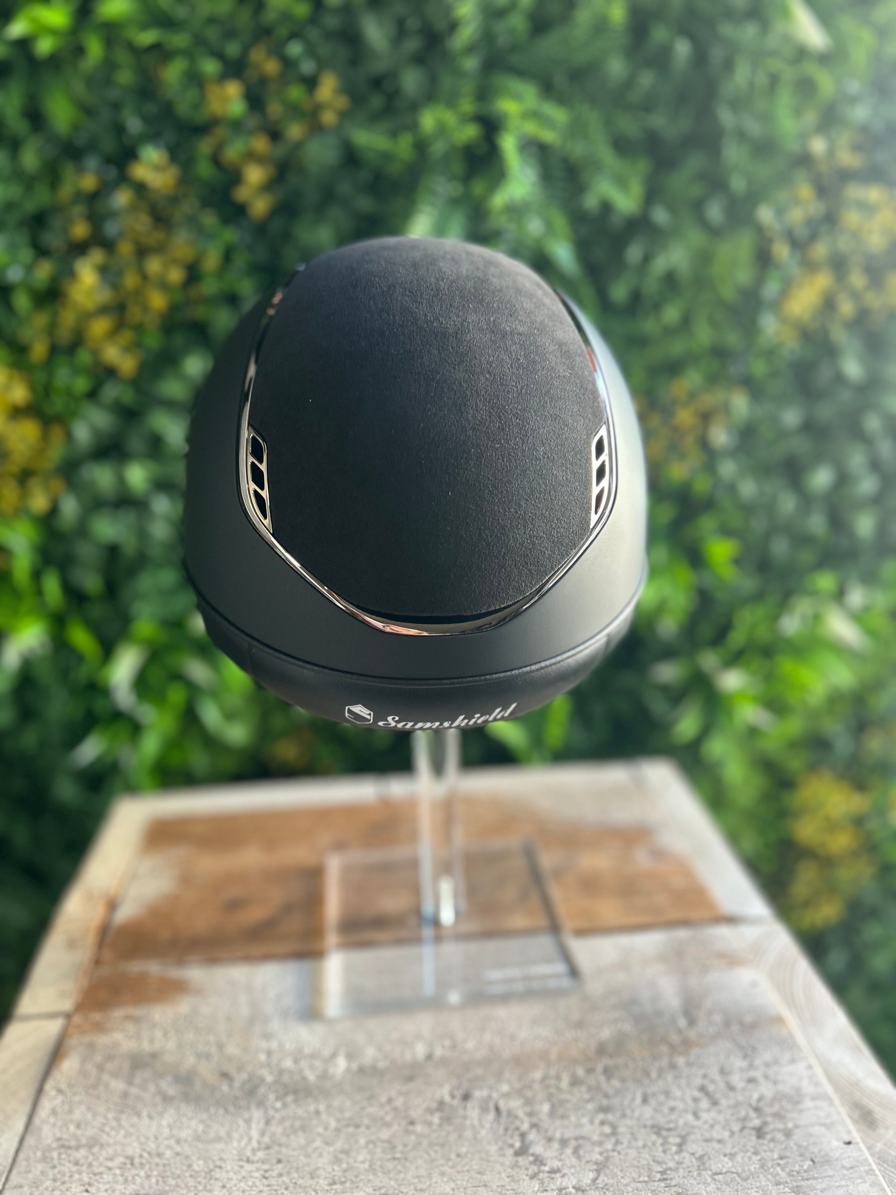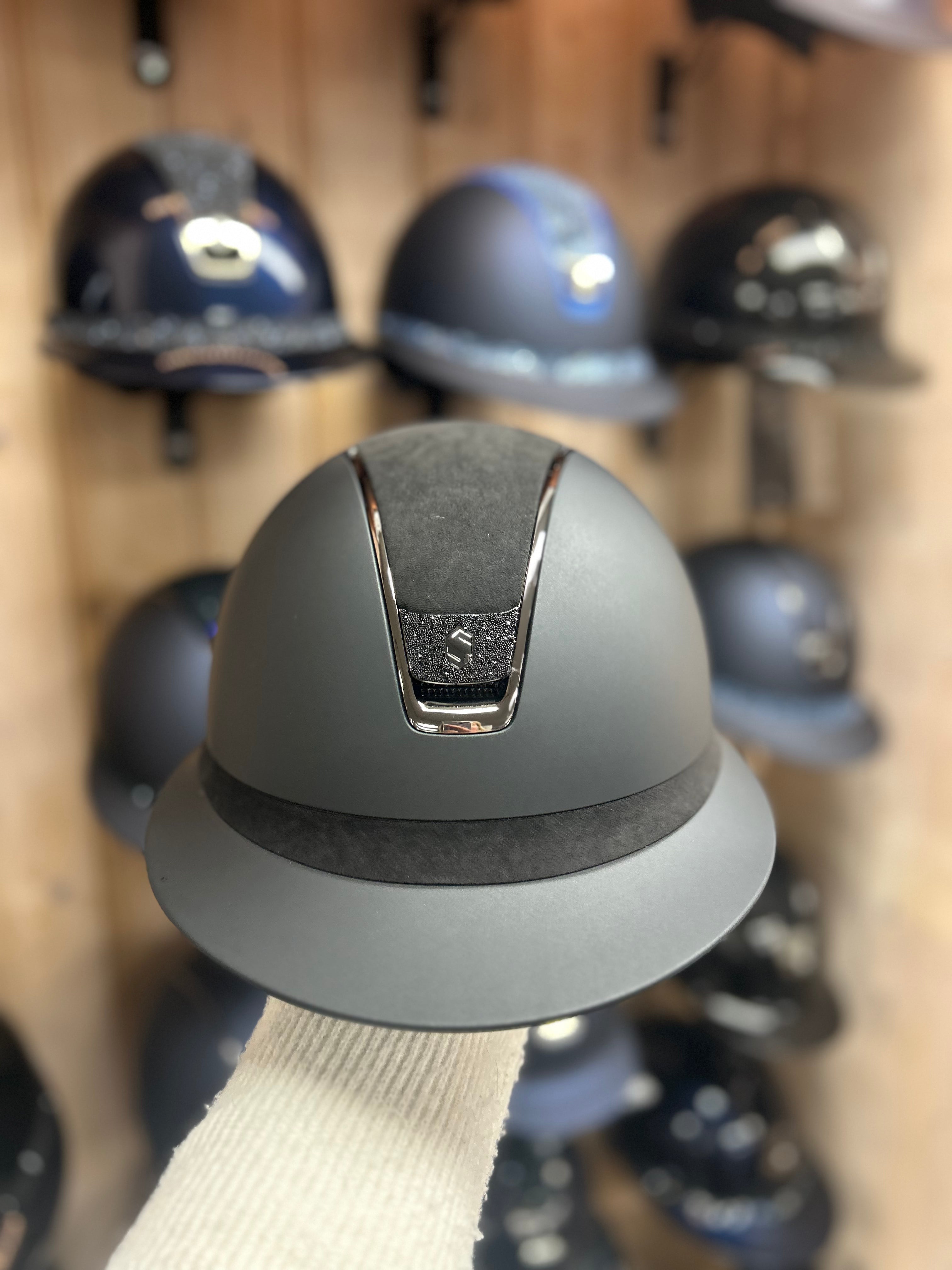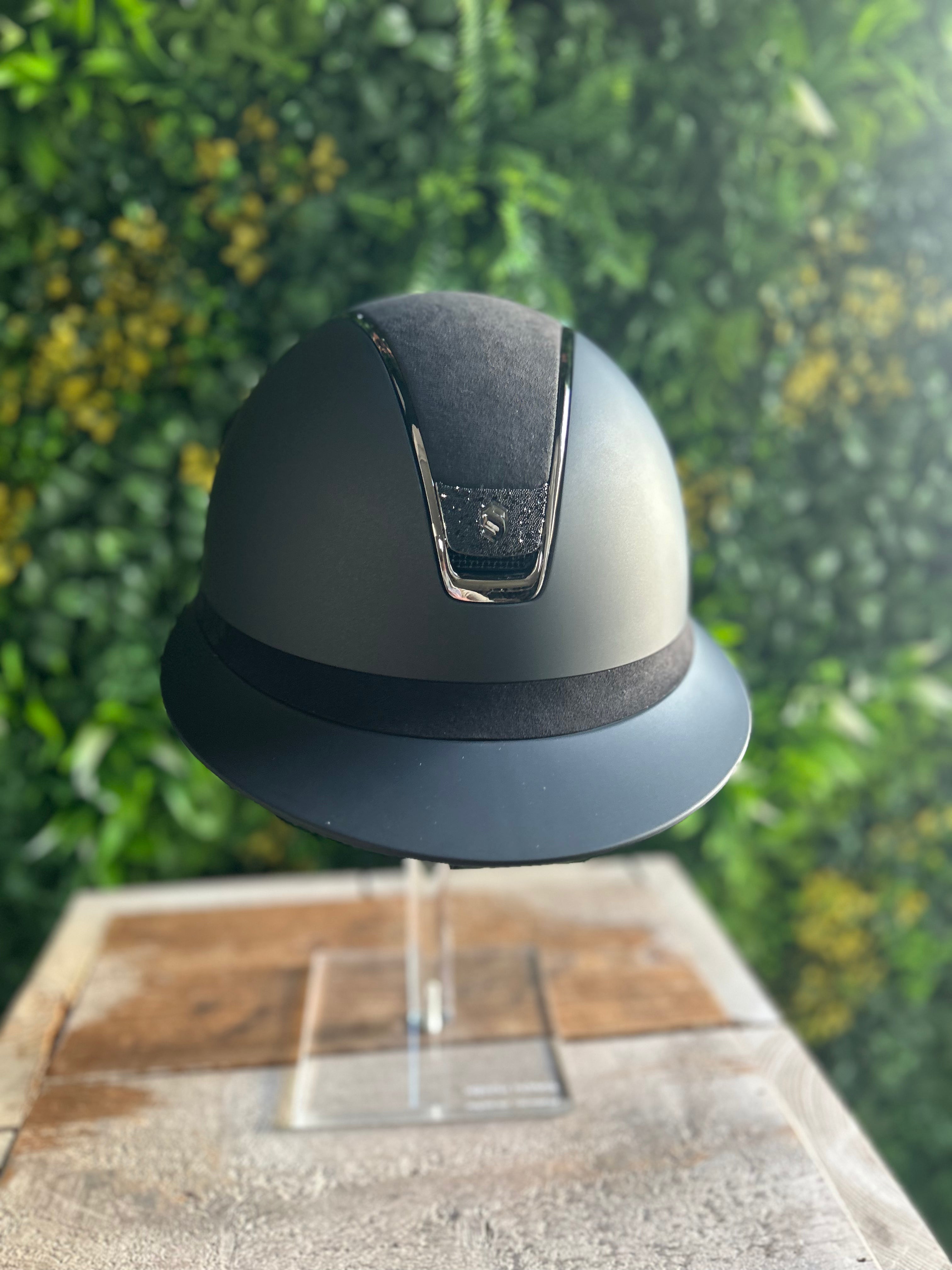 Luxe Miss Shield Samshield cap in een shadowmatt uitvoering met een alcantara top, tiara band en een chrome zwarte trim en blazon voor een chique uitstraling.
