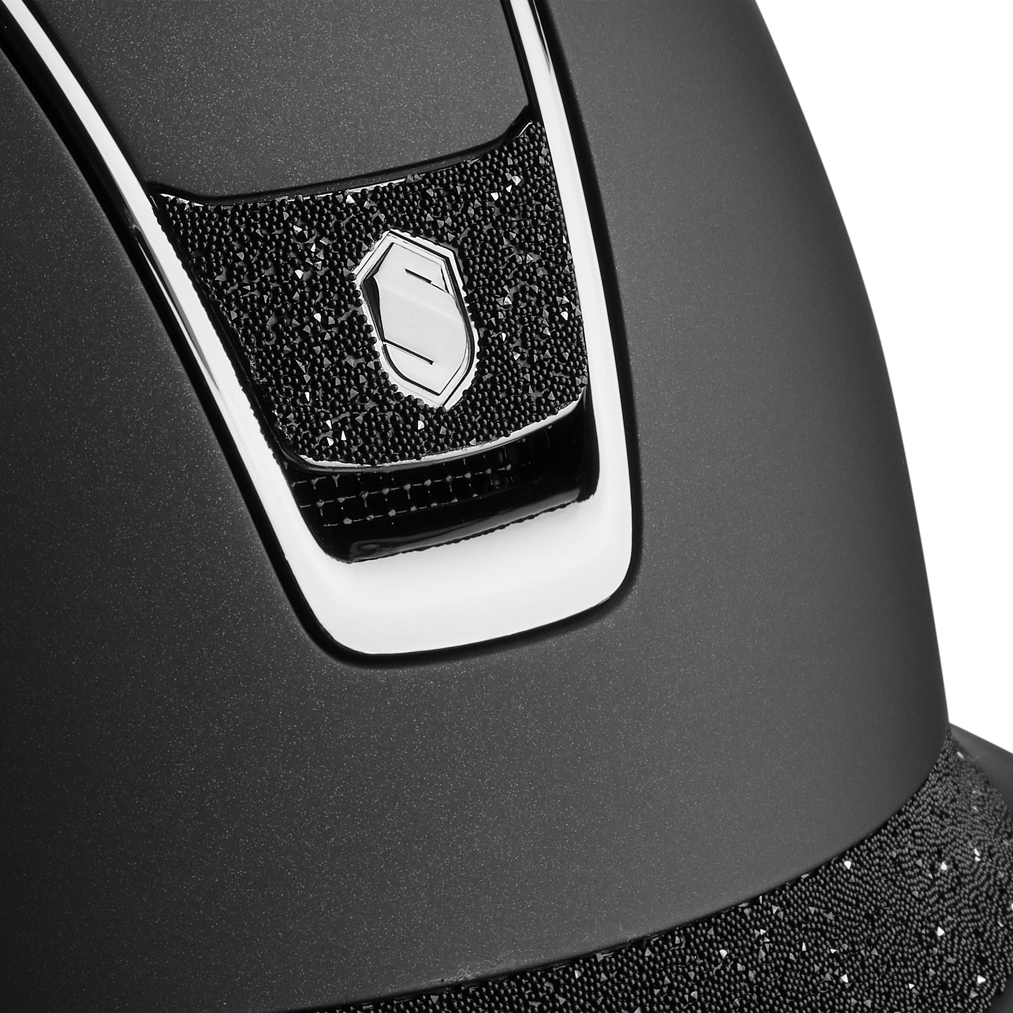 The outer part of this Samshield 2.0 Miss Shield Shadowmatt Crystal Fabric frontal band and blazon is made of polycarbonate, which is a material that is used for motorcycle helmets, among other things. The helmet is covered with a scratch-resistant layer. Various shells are available (S, M, L and XL). Each shell is suitable for 4 to 5 sizes of liners, with a view to an optimal fit for the head. The liners are available from size 52 to 64. With this system it is also possible to let the helmet grow with younger riders. The interchangeable inner liners are equipped with a clip system so that they can be easily removed and put in for washing (max. 30° C).