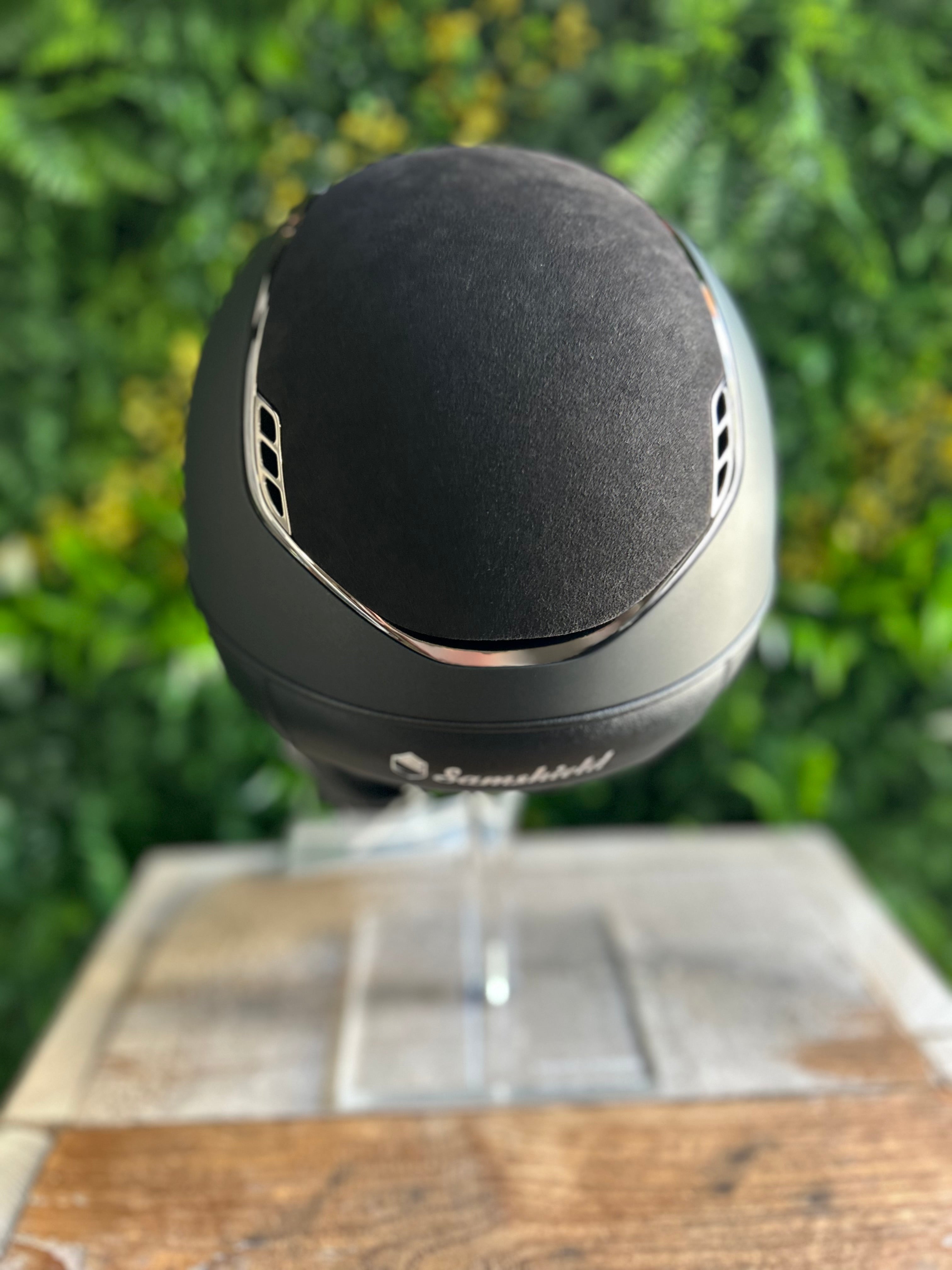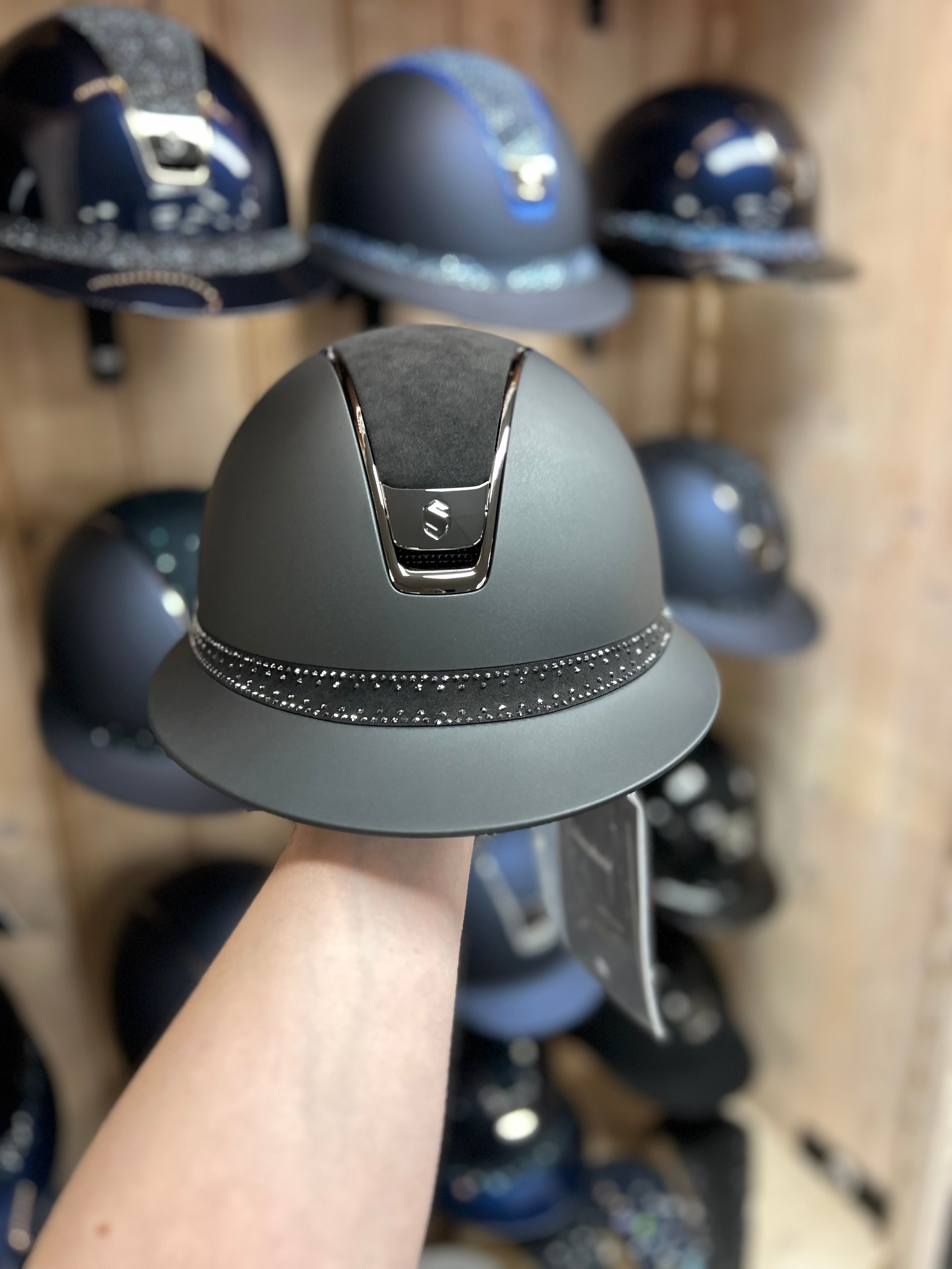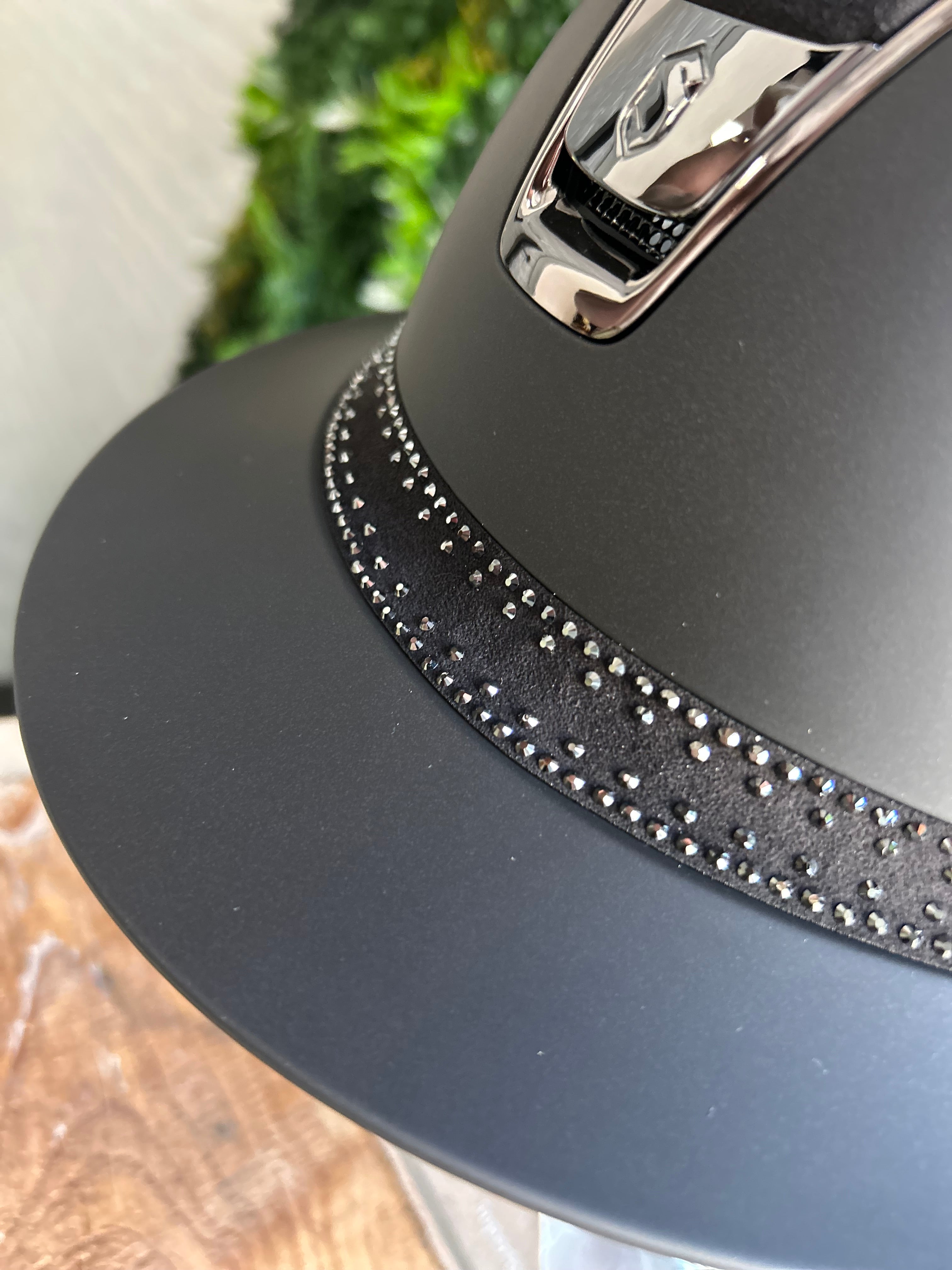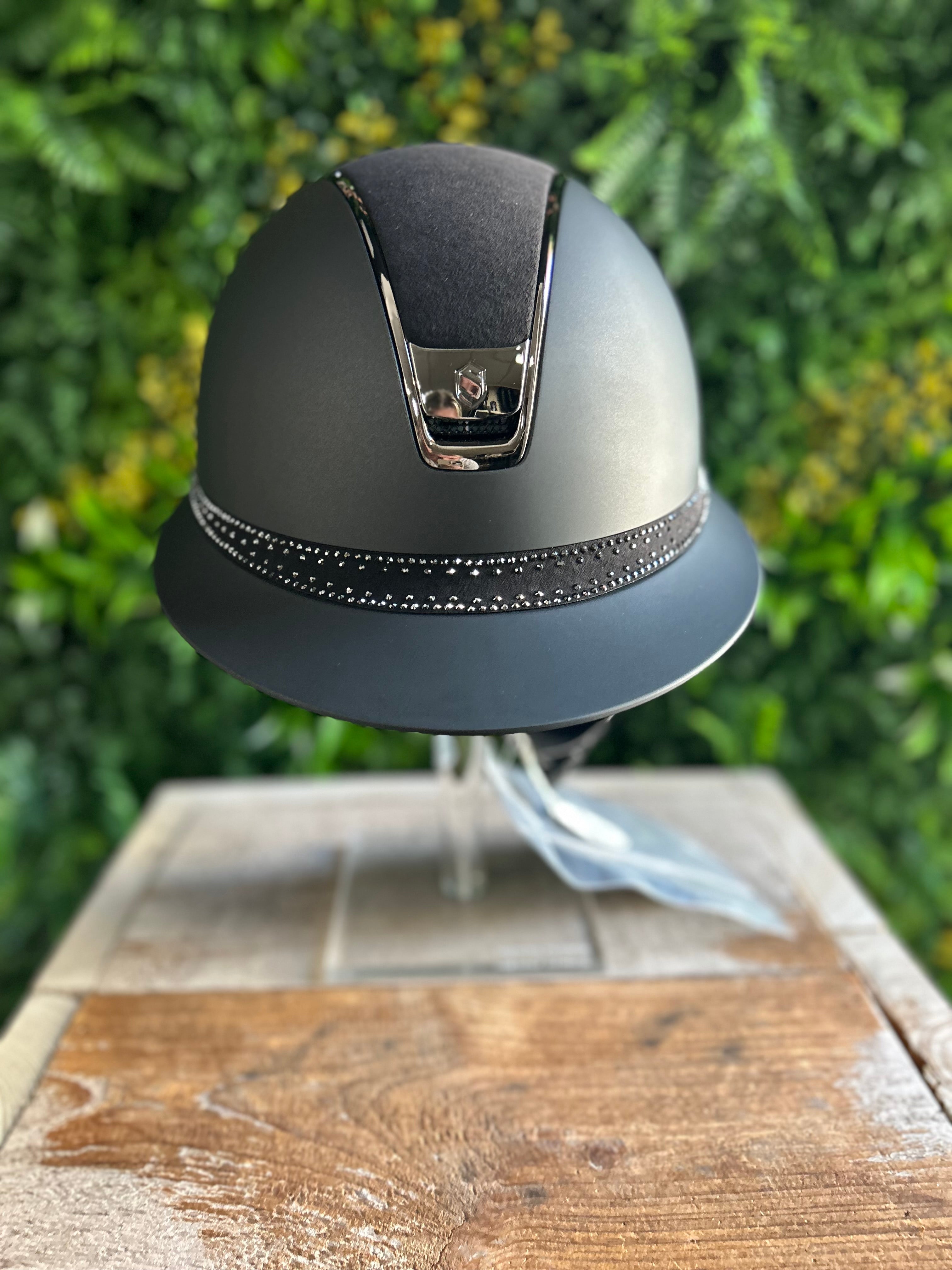 Luxe Miss Shield Samshield cap in een shadowmatt uitvoering met een alcantara top, tiara band en een chrome zwarte trim en blazon voor een chique uitstraling.