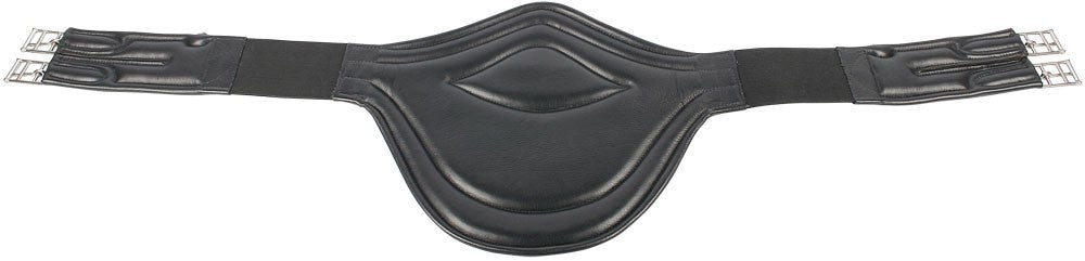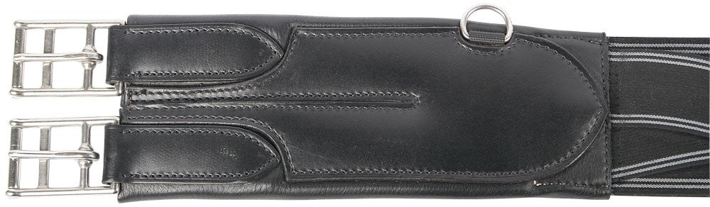 Lederen buikflapsingel met rundlederen voering. Beide zijden met elastiek aan het begin van de singelstoten voor extra bewegingsvrijheid bij de buik. Met rvs rolgespen en D-ring op buikflap (voor hulpteugels).
