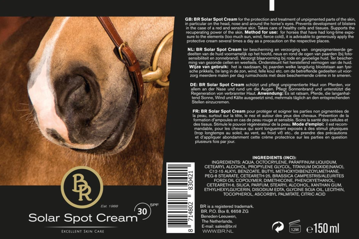 BR Solar Spot Cream protects and cares for the unpigmented areas of the skin, mainly on the head, nose and around the eyes of horses. The water-resistant cream supports the skin's ability to recover and also cares for healthy cells and tissues. In addition, the cream is perfect for use to prevent blistering of red and sensitive skin.