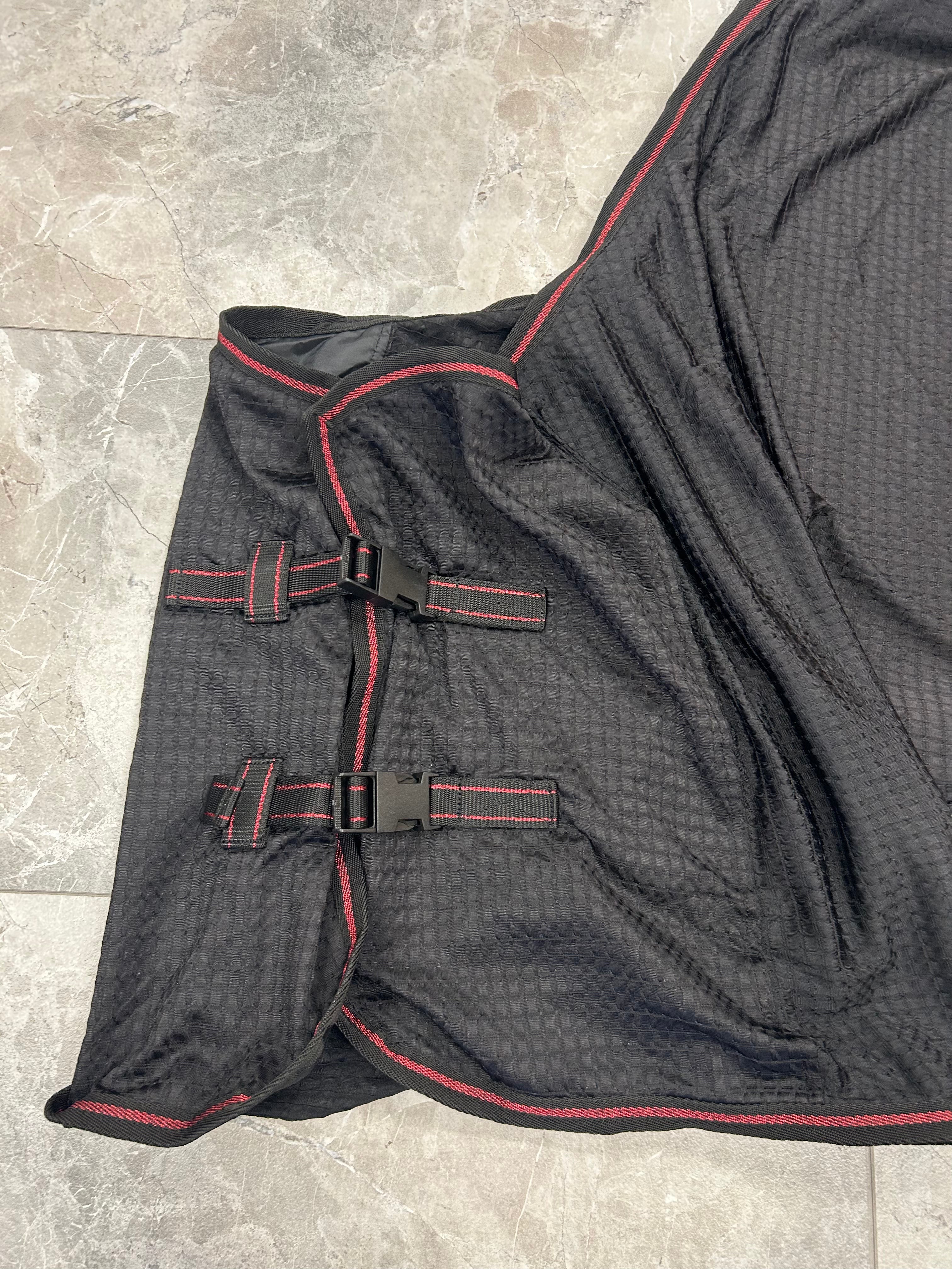 De deken is voorzien van een uitsparing voor het zadel, waardoor hij perfect over het zadel en onder de beugels past zonder te schuiven. Dankzij de stevige voorsluiting en staartriem blijft de deken goed op zijn plaats, ook tijdens beweging. Het lichte, ademende materiaal houdt vliegen, dazen en andere insecten op afstand, terwijl het je paard koel en comfortabel houdt tijdens buitenritten. Ideaal voor zomerse trainingssessies of ontspannen ritten in de natuur.