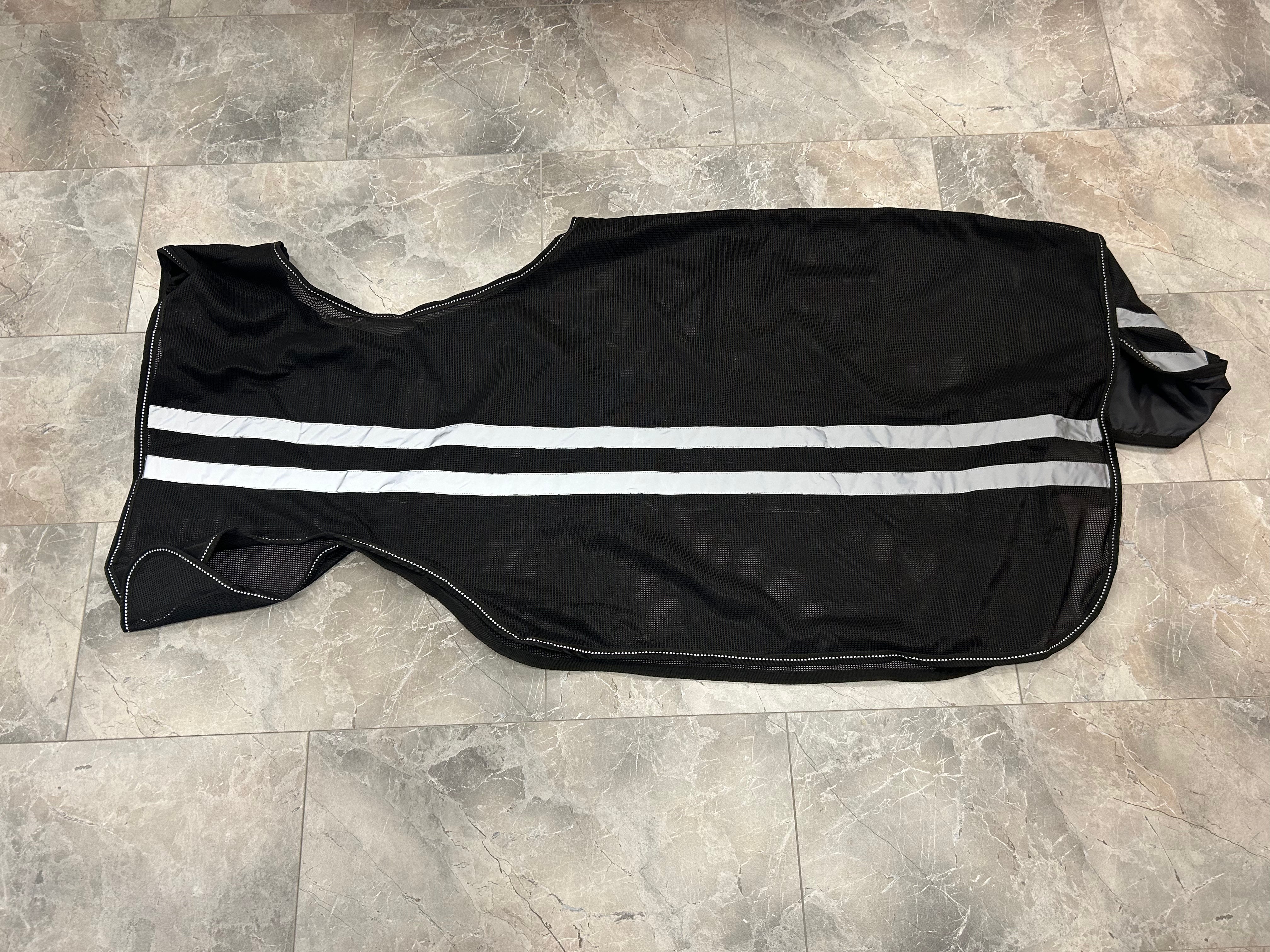 De deken is voorzien van een uitsparing voor het zadel, waardoor hij perfect over het zadel en onder de beugels past zonder te schuiven. Dankzij de stevige voorsluiting en staartriem blijft de deken goed op zijn plaats, ook tijdens beweging. Het lichte, ademende materiaal houdt vliegen, dazen en andere insecten op afstand, terwijl het je paard koel en comfortabel houdt tijdens buitenritten. Ideaal voor zomerse trainingssessies of ontspannen ritten in de natuur.