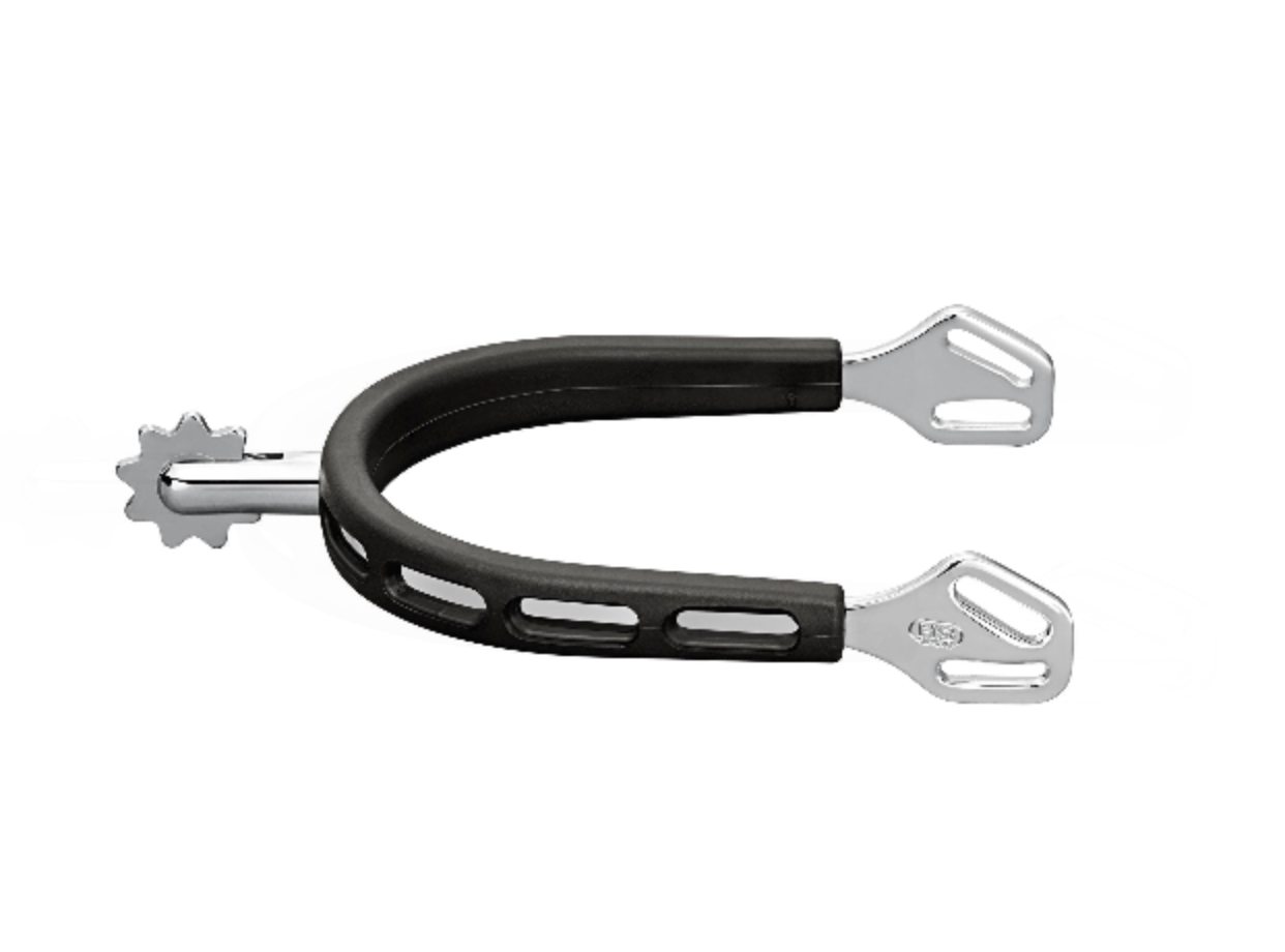 Ultra fit GRIP spurs with Balkenhol system and rubber around the spur for extra protection for the boot. Large coarse toothed wheel, 25mm. The Balkenhol system gives a unique fit and design. The spur straps are pulled through the spur at a 45 degree angle. Due to a special recess on the inside of the attachment, it excludes pressure on the ankle and foot of the rider and the spur always stays neatly in place.
