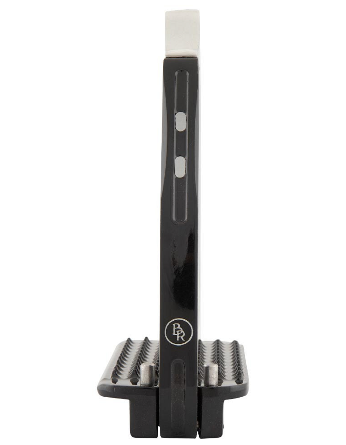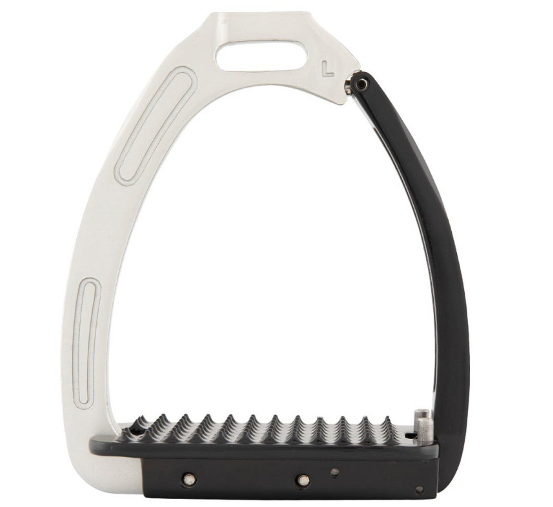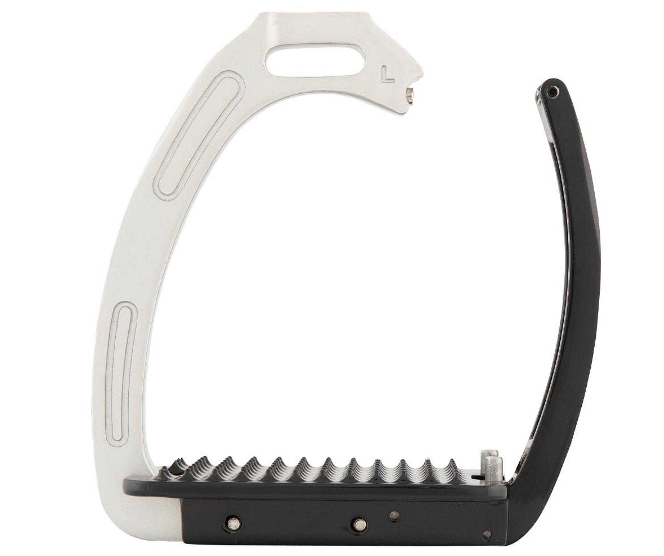 Deze stijgbeugel is gemaakt van gegalvaniseerd aluminium met een poedercoating en is aan de binnenkant versterkt met roestvrijstaal voor extra stevigheid. De beugel is uitgerust met een magnetisch veiligheidsmechanisme. Het gewicht van de ruiter zorgt ervoor dat de beugel opent bij een val. Op deze manier blijft de voet niet in de beugel hangen. Zodra de voet de beugel verlaat, sluit de beugel zich automatisch. De licht gebogen stijgbeugelriemophanging zorgt voor een goede beugelpositie, waardoor de voet in de juiste positie gehouden wordt. Dit geeft de ruiter meer stabiliteit en verbetert de beenligging.