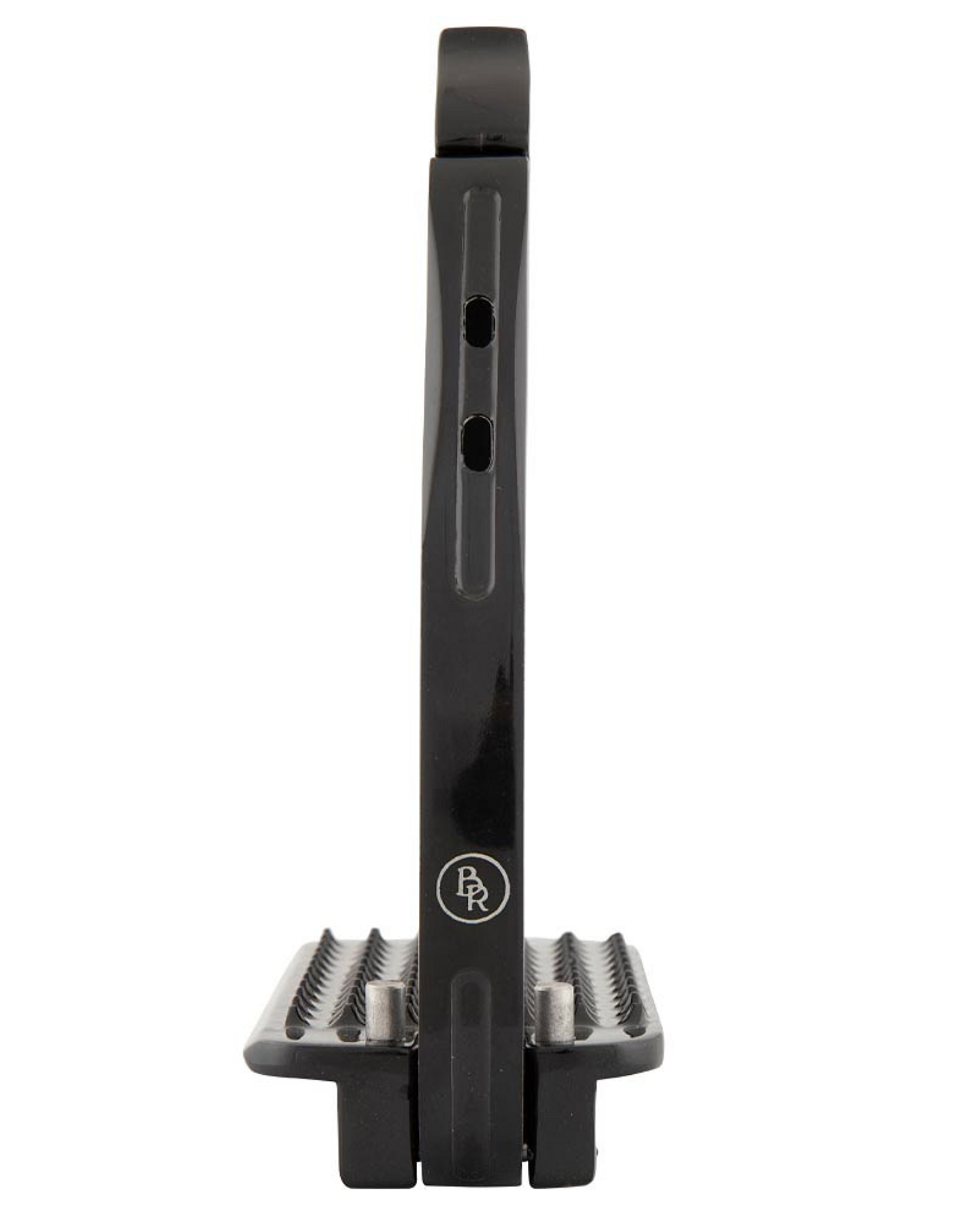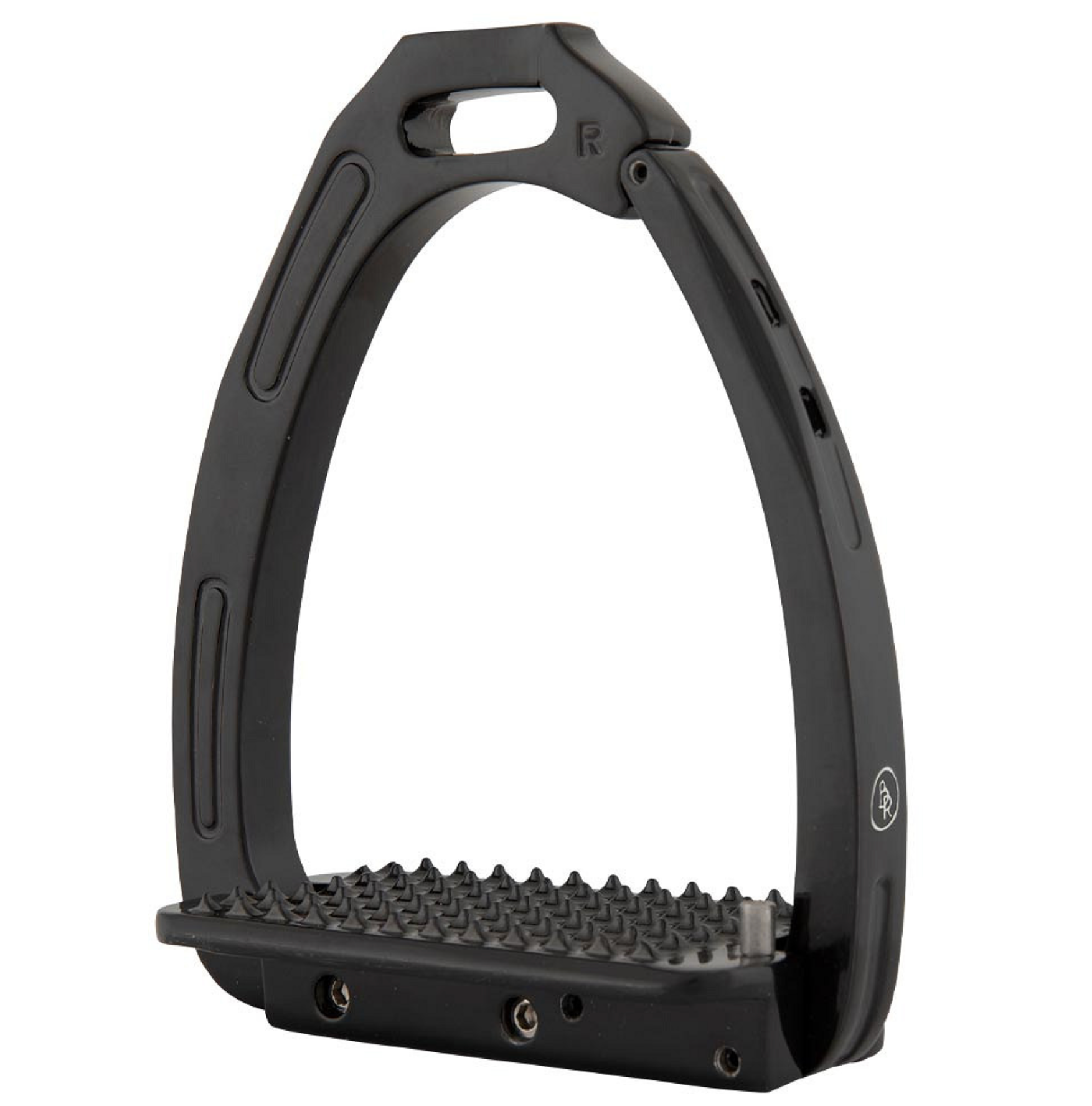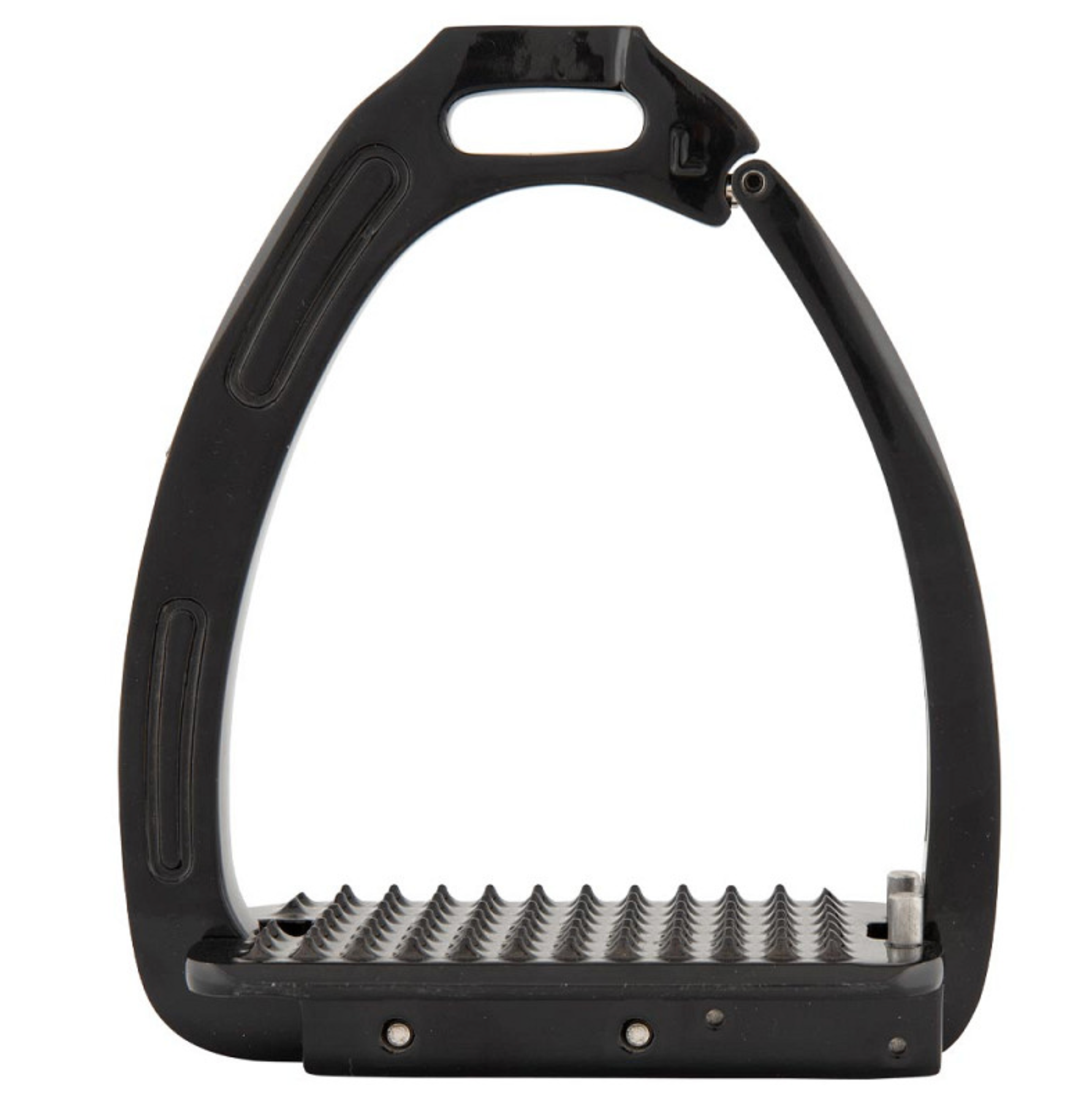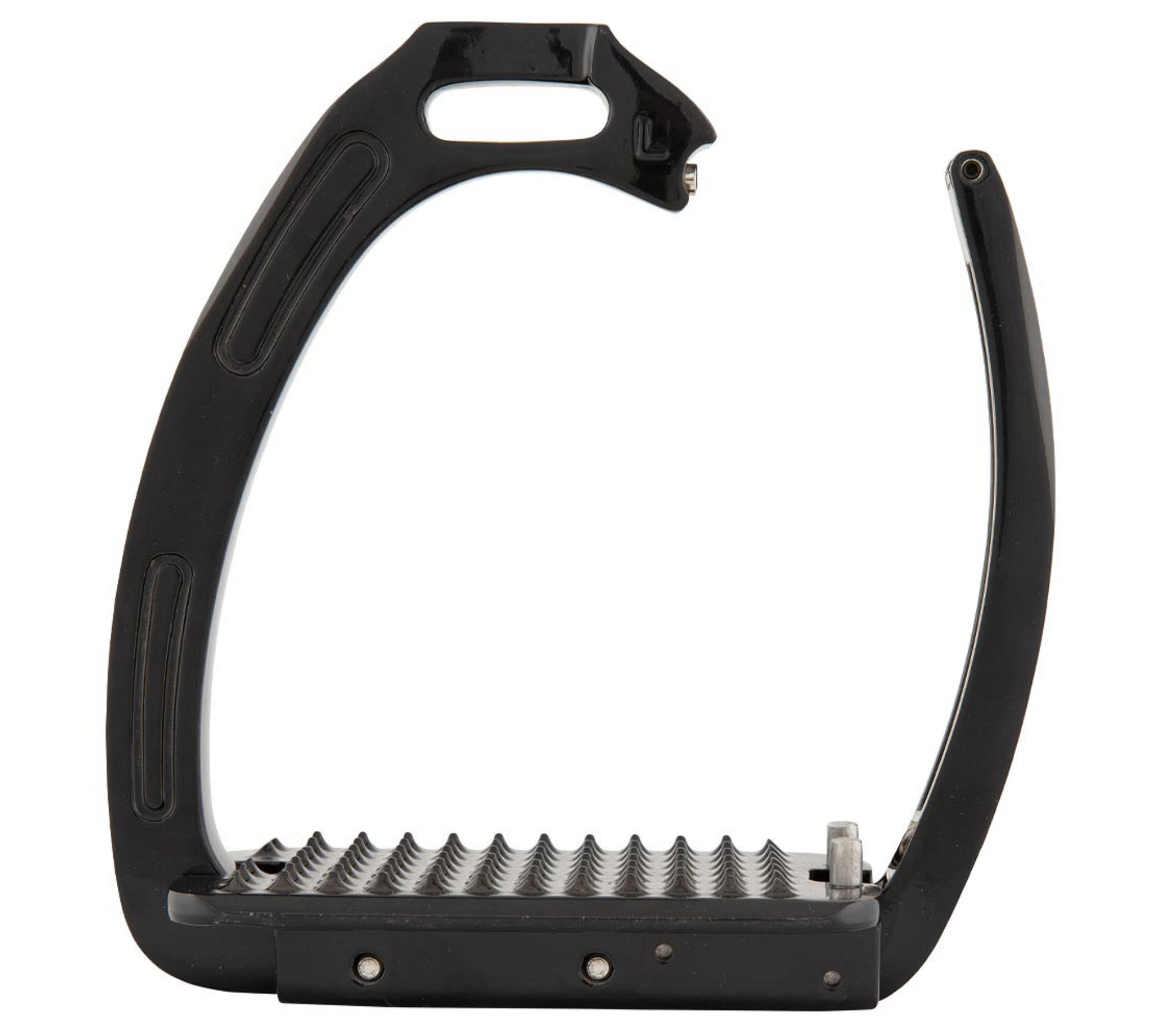 Deze stijgbeugel is gemaakt van gegalvaniseerd aluminium met een poedercoating en is aan de binnenkant versterkt met roestvrijstaal voor extra stevigheid. De beugel is uitgerust met een magnetisch veiligheidsmechanisme. Het gewicht van de ruiter zorgt ervoor dat de beugel opent bij een val. Op deze manier blijft de voet niet in de beugel hangen. Zodra de voet de beugel verlaat, sluit de beugel zich automatisch. De licht gebogen stijgbeugelriemophanging zorgt voor een goede beugelpositie, waardoor de voet in de juiste positie gehouden wordt. Dit geeft de ruiter meer stabiliteit en verbetert de beenligging.