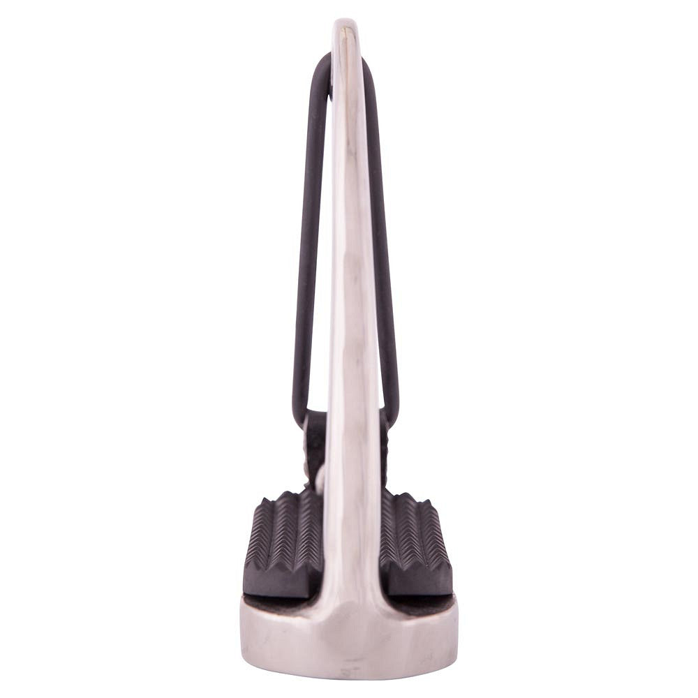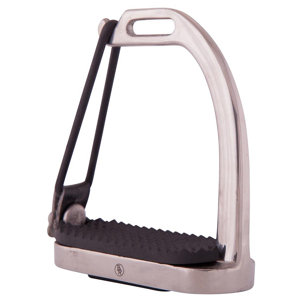 Fillisbeugels met elastiek en zwarte zooltjes, roestvrij staal. De rubberen sluiting zorgt ervoor dat de ruiter tijdens een val niet in de beugel blijft hangen.