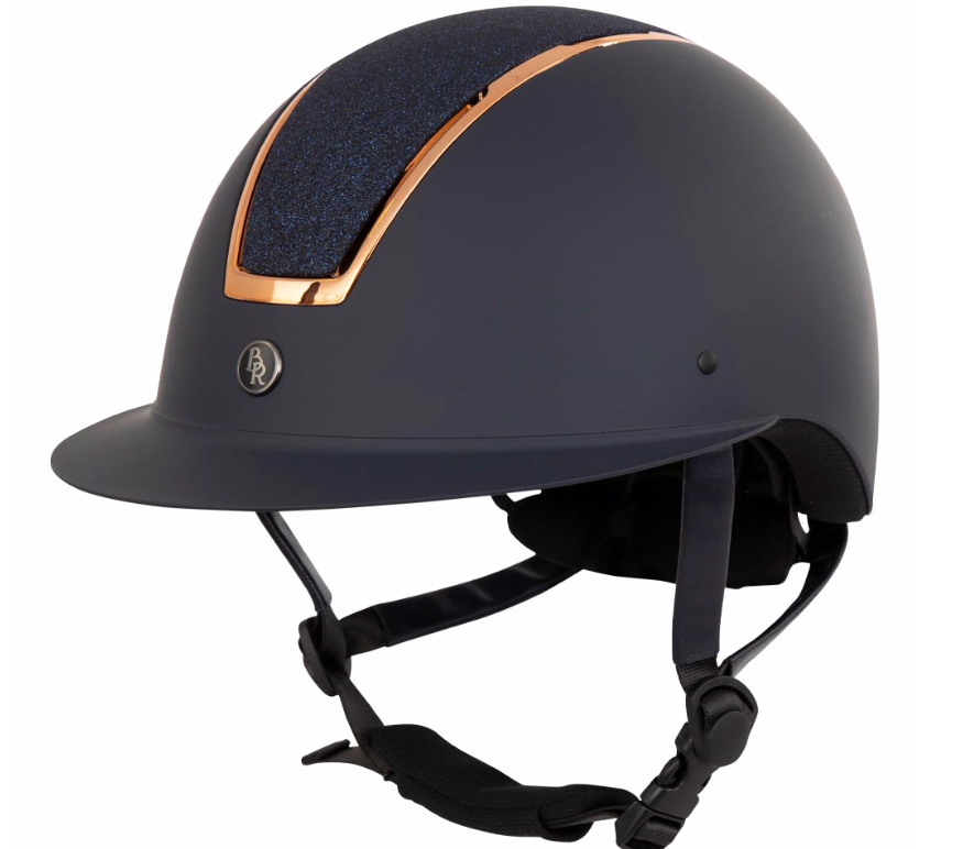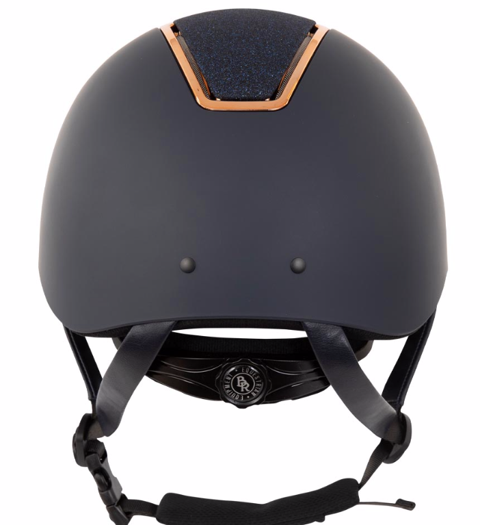 The BR riding helmet Omega Painted Glitter stands out due to the glitter top demarcated with a shiny bronze-colored edge and the extra large sun visor.