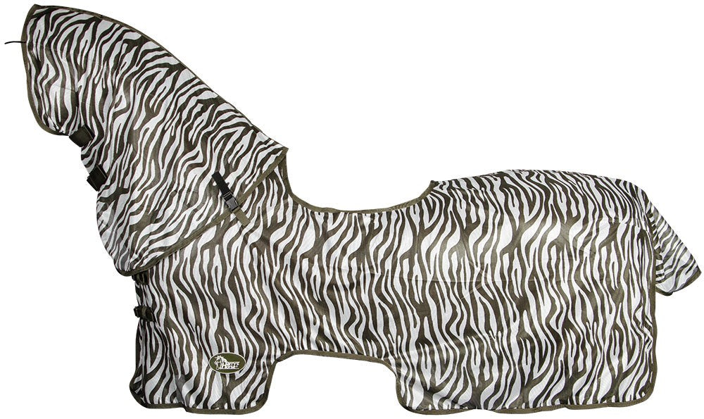 Fly rug with a detachable neck and saddle cutout with a zebra print. Soft and strong fabric.