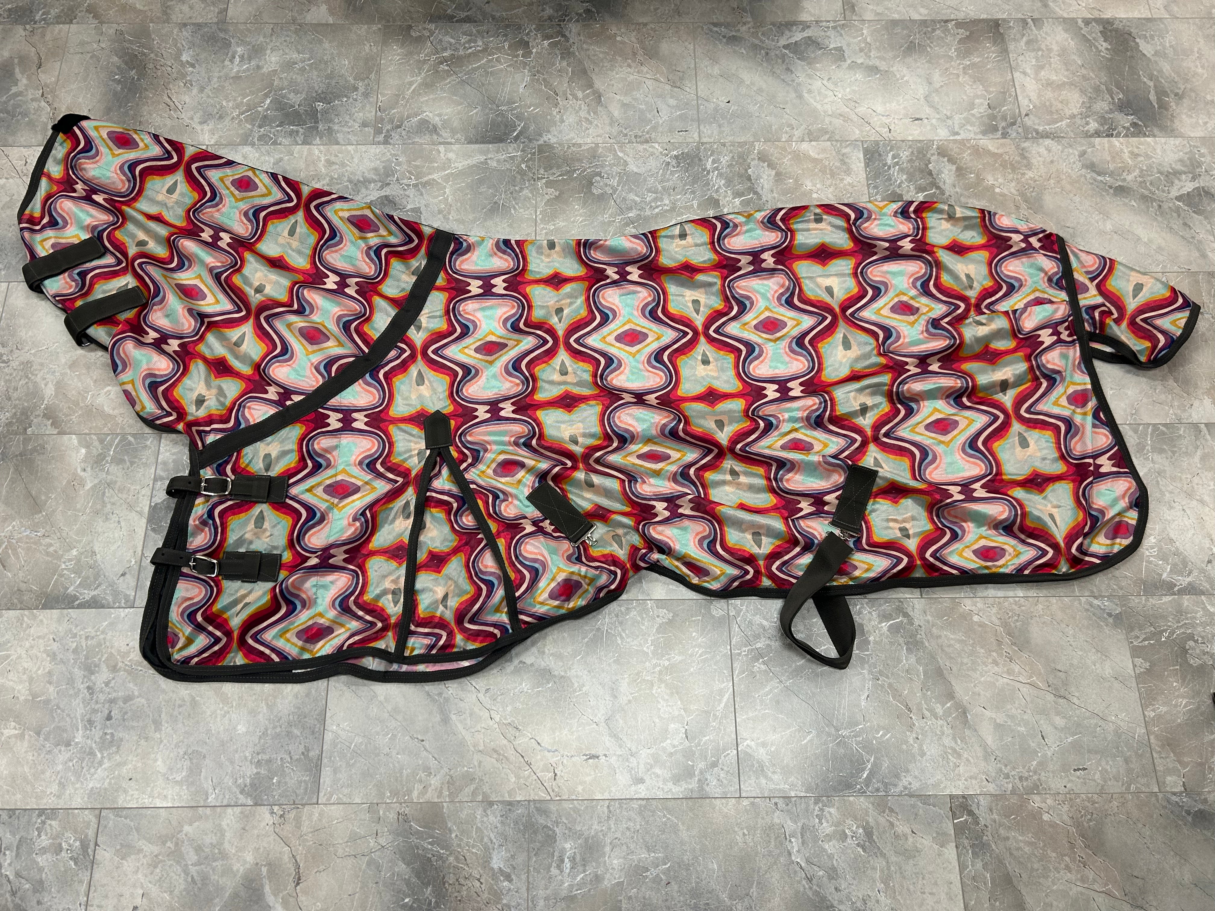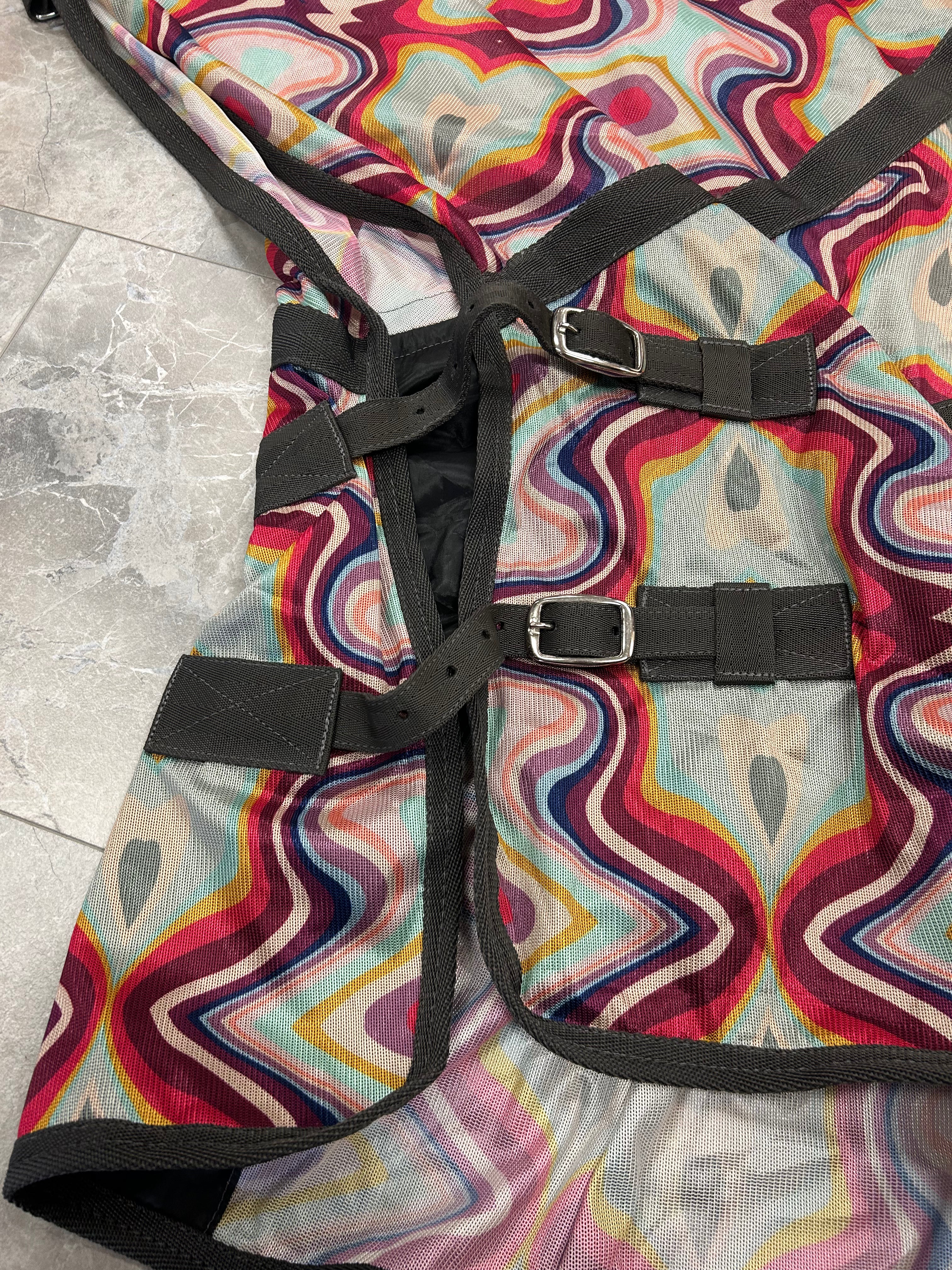 De deken is uitgerust met een vaste hals, een stevige voorsluiting, buiksingels en een staartriem, wat zorgt voor een perfecte pasvorm en voorkomt dat de deken verschuift tijdens het bewegen. Het ademende, lichtgewicht materiaal beschermt je paard effectief tegen vliegen, dazen en andere insecten, terwijl het tegelijkertijd zorgt voor voldoende ventilatie. Ideaal voor gebruik in de wei of op stal in de zomer. Dankzij de duurzame afwerking blijft je paard koel, comfortabel en goed bedekt — van oren tot staart.