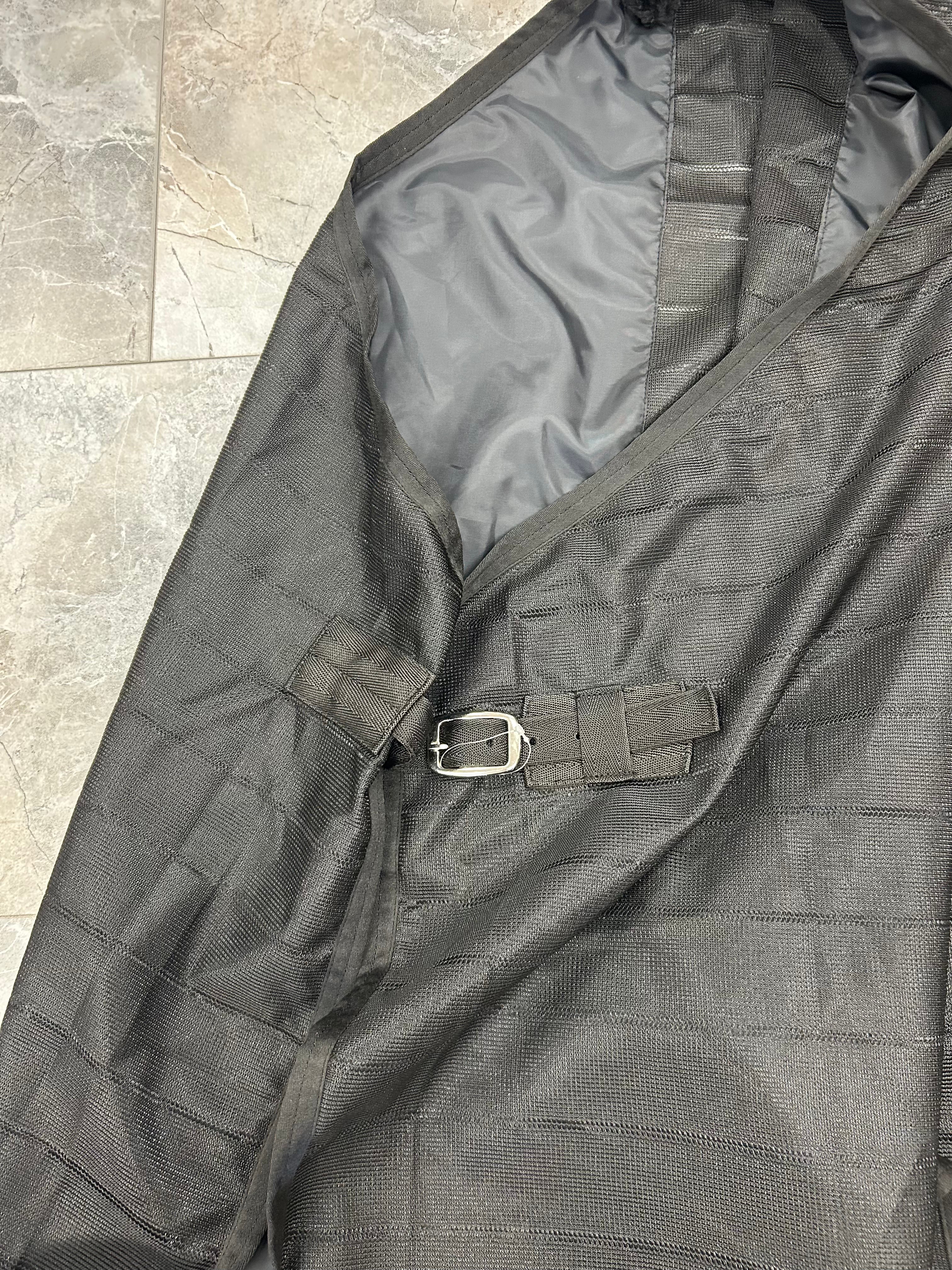 De deken is voorzien van een stevige voorsluiting, buiksingels en een staartriem, wat zorgt voor een uitstekende pasvorm en voorkomt dat de deken verschuift tijdens het bewegen. Gemaakt van ademend en lichtgewicht materiaal, beschermt deze vliegendeken effectief tegen vliegen, dazen en andere vervelende insecten. Ideaal voor gebruik in de wei of op stal tijdens de zomermaanden. Dankzij het duurzame ontwerp gaat de deken lang mee, terwijl je paard koel, comfortabel en goed beschermd blijft.