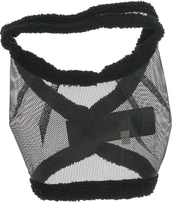 Fly hood made of sturdy material with a fine mesh. This prevents the horse from being bothered by flies in the pasture. With a soft fur along the edge and easy to attach.