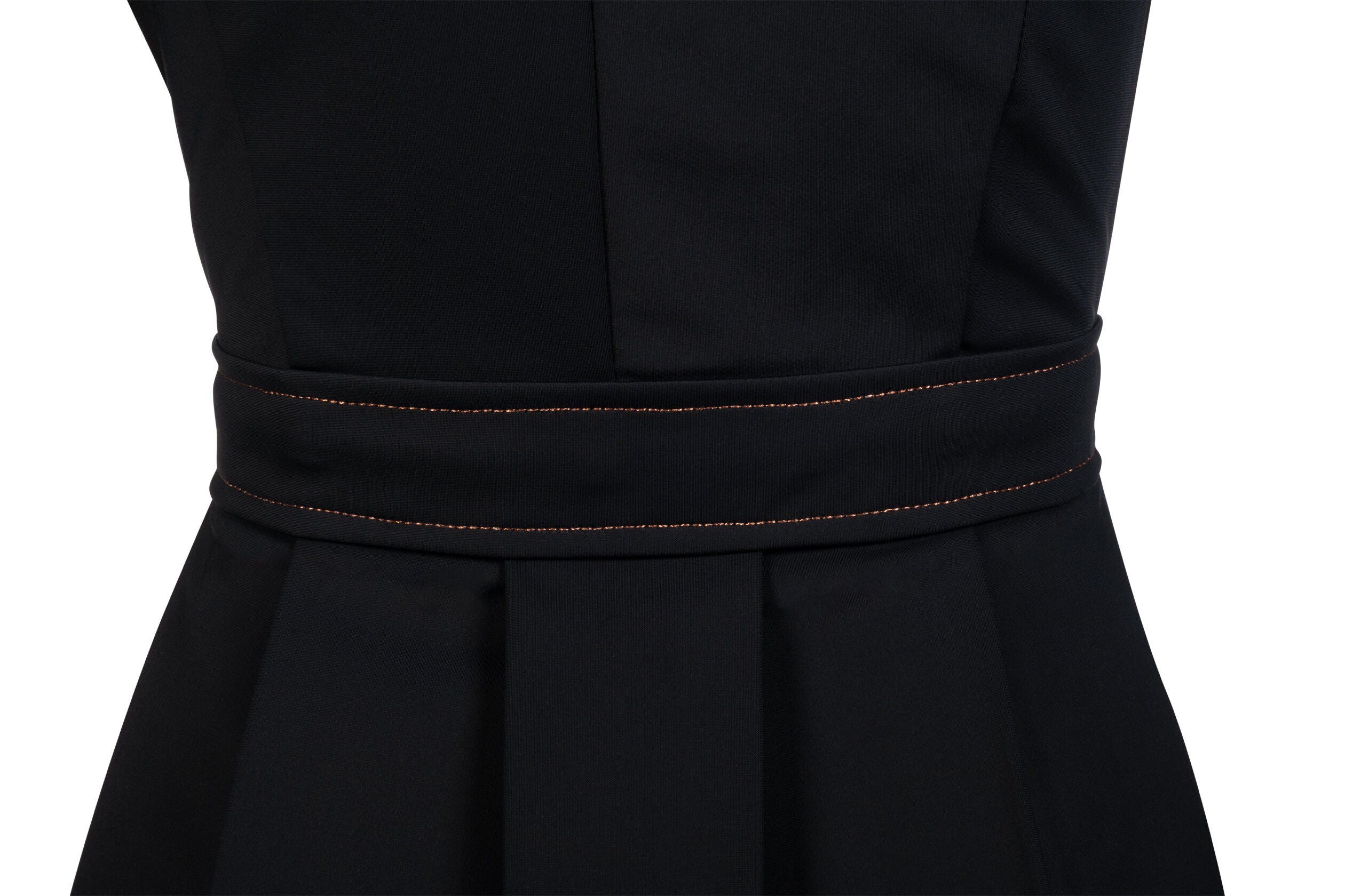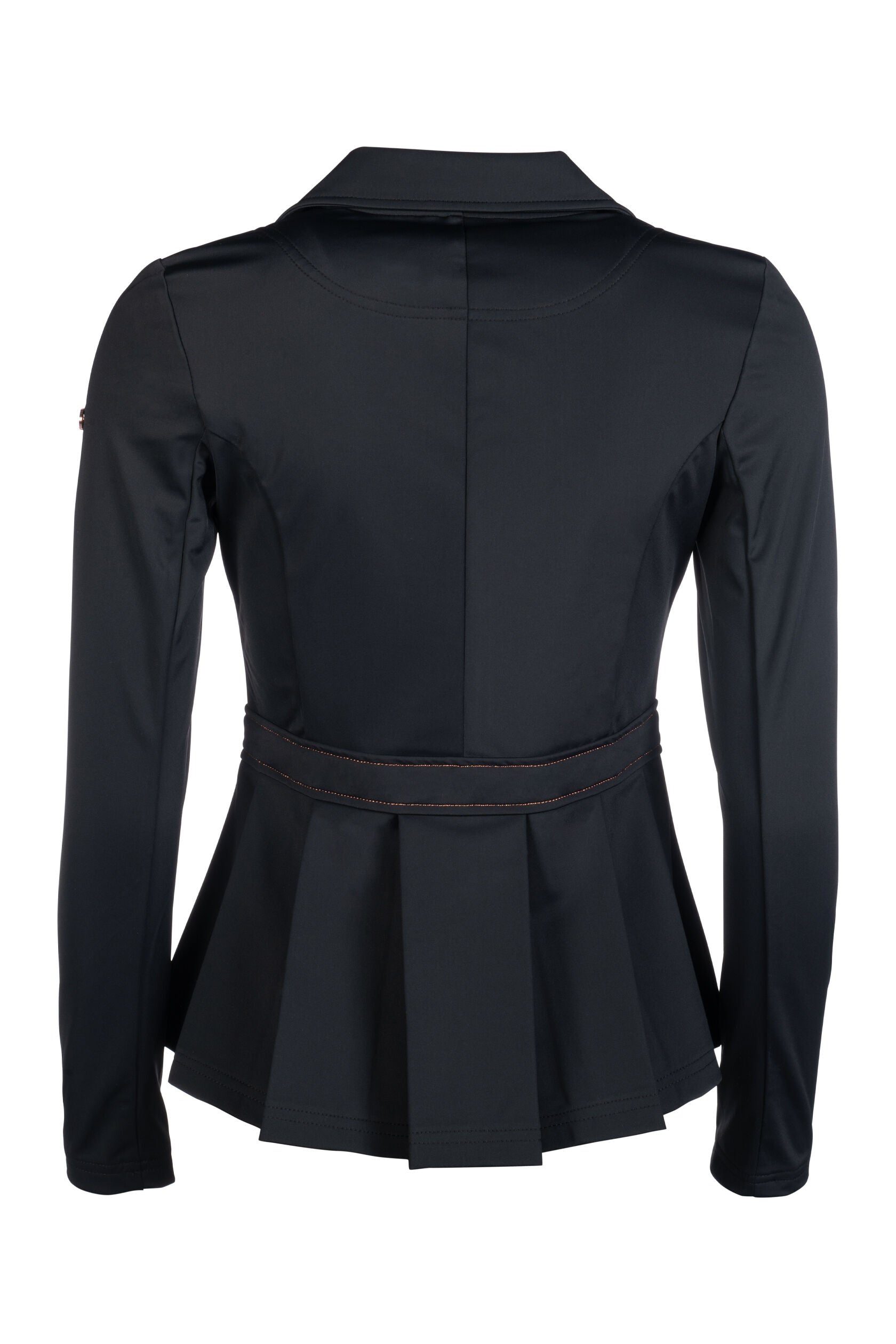 The Eloise competition jacket creates a beautiful silhouette with its tailored cut and integrated peplum at the back. It closes with a zip that is covered by an elegant button placket. Fine decorative seams, which are made of elegant rose gold, just like the buttons, give the jacket a touch of glamour. Because the jacket is both dirt-repellent and wrinkle-free, the care of the garment is kept to a minimum. This competition jacket is available in children's and adult sizes.