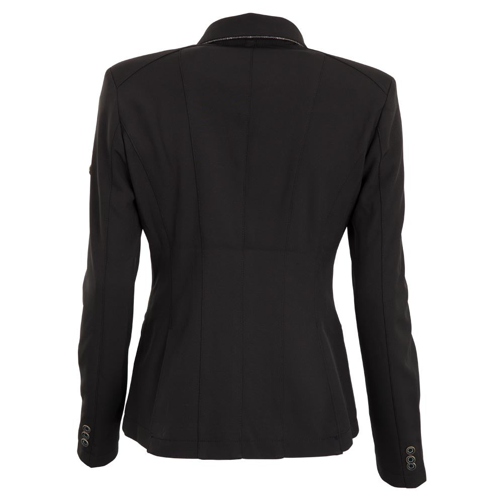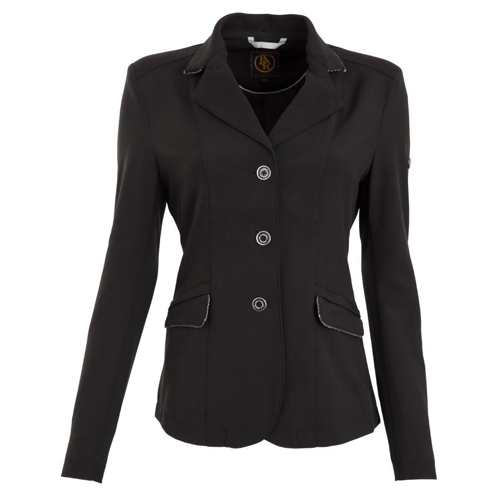 This elegantly tailored women's competition jacket is made of soft shell with a comfortable mesh lining. Soft shell is moisture-regulating and water-repellent. The light, elastic material and the pre-formed sleeves ensure an exceptionally comfortable fit. The jacket has three plastic BR buttons on the front. The cuffs have the same buttons in a smaller size. The jacket has a double slit with zip on the back. The slits are decorated with decorative tape on the inside. Both the flap pockets and the collar are finished with decorative cord with a subtle silver-coloured detail. The jacket's elegant lines on the back are striking, which further accentuate the waist. What makes this jacket unique are the interchangeable collar and flap pockets. Equipped with an easy-to-zip-off system with invisible zips. Machine washable at 30°C.